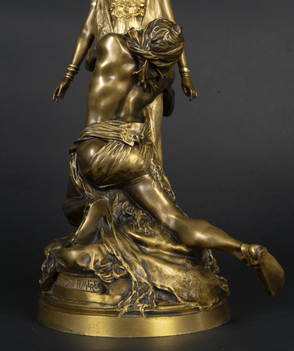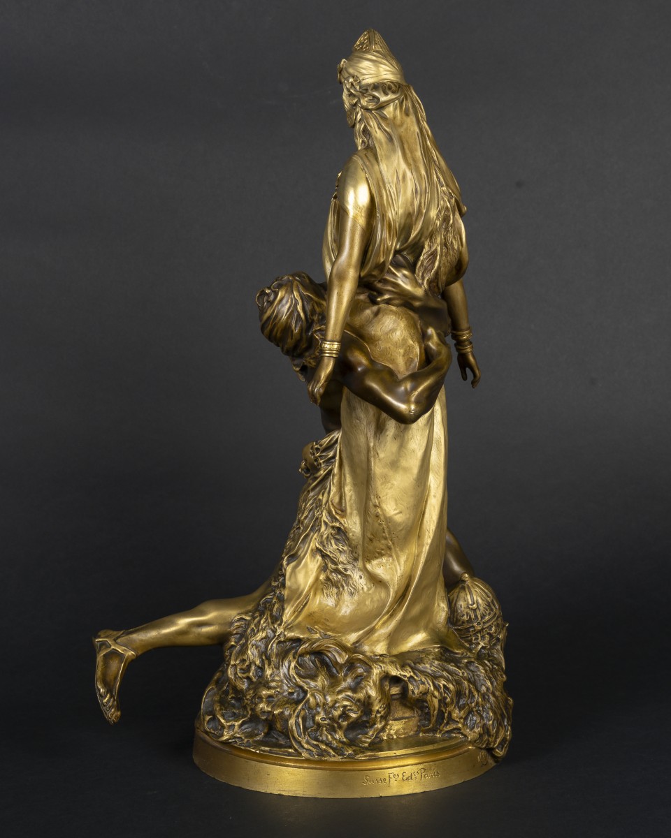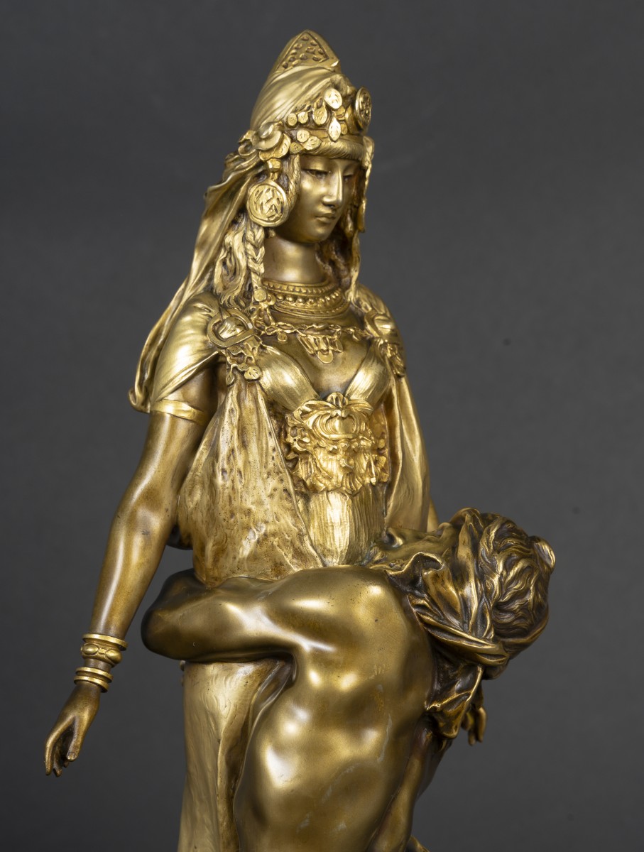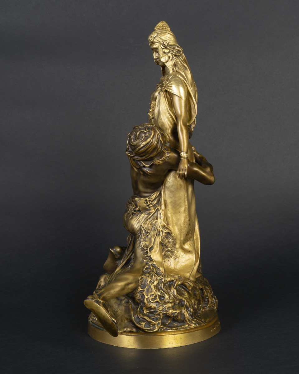 An elegant bronze sculpture with a double gilt patina depicting a scene between a Carthaginian priestess and a man kneeling at her feet. The upright and solemn female figure contrasts with the expressive movement of the male figure, creating a strong visual tension. The rich, nuanced golden patina highlights the delicate modeling, the details of the costume, and the quality of the drapery. An emblematic work of late 19th-century Orientalist aesthetics.