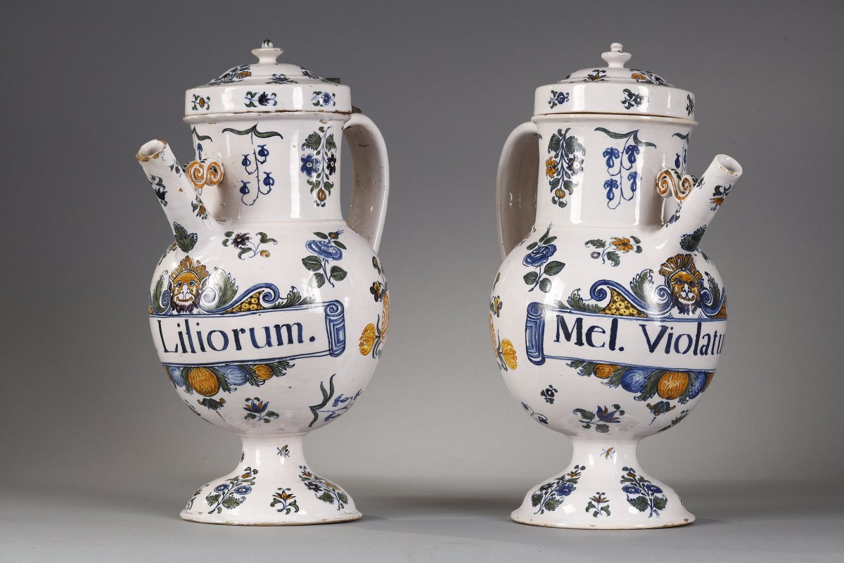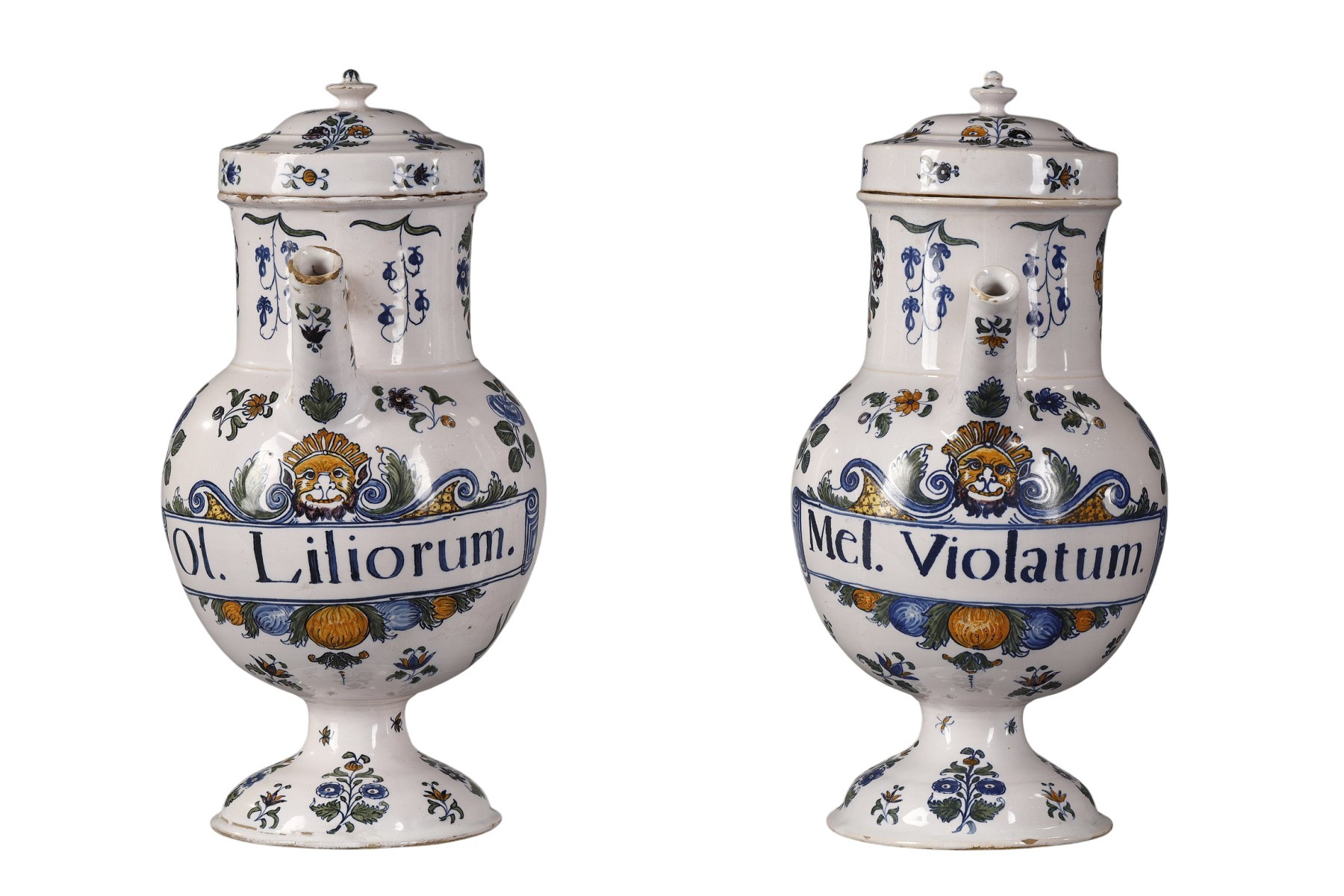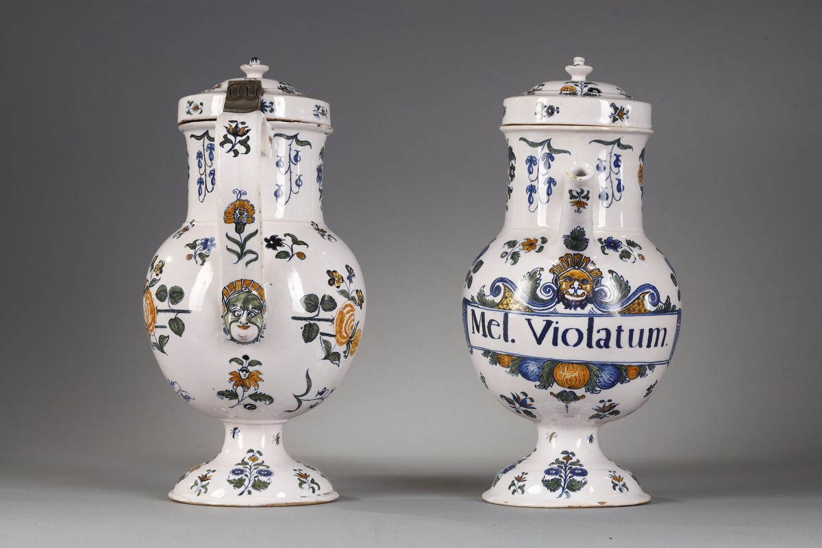 Pair of glazed earthenware apothecary chevrettes on spreading foot, decorated in polychrome with Latin inscriptions framed in phylacteries. Each is surmounted by stylized “Indian” heads surrounded by fruits and scrolling foliage, flanked by floral motifs including solanaceous blossoms (potato flowers), tulips, and roses. The undersides of the handles feature grotesque heads in low relief. Original pewter hinges.