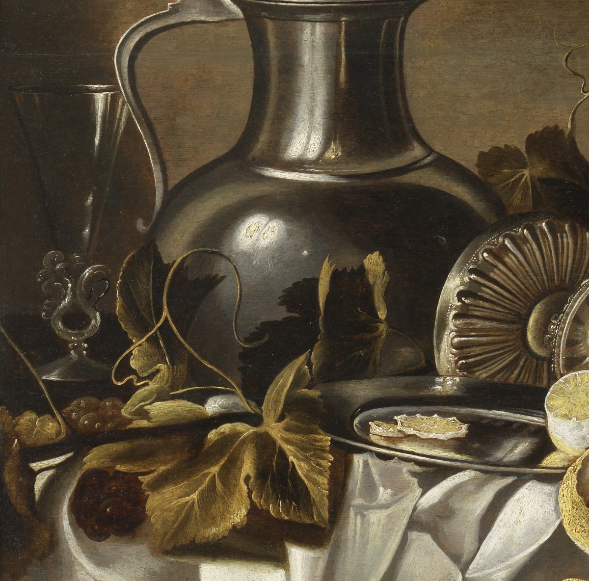 Related work: The arrangement of objects in space, the format, and the color palette are reminiscent of the painting held in a private collection and exhibited in Zurich in 2004: Entablature with a wide-bellied pitcher, an overturned silver goblet, a roemer, a fluted glass, and a roast capon, dated 1647.
