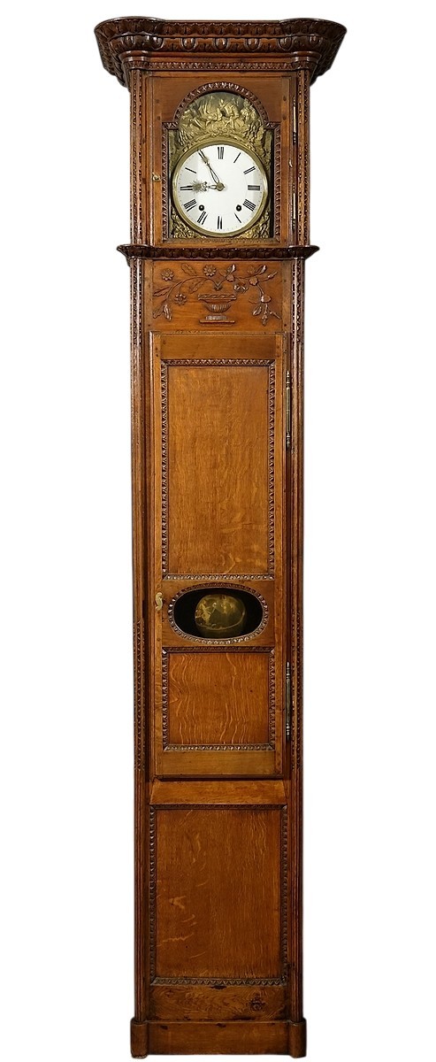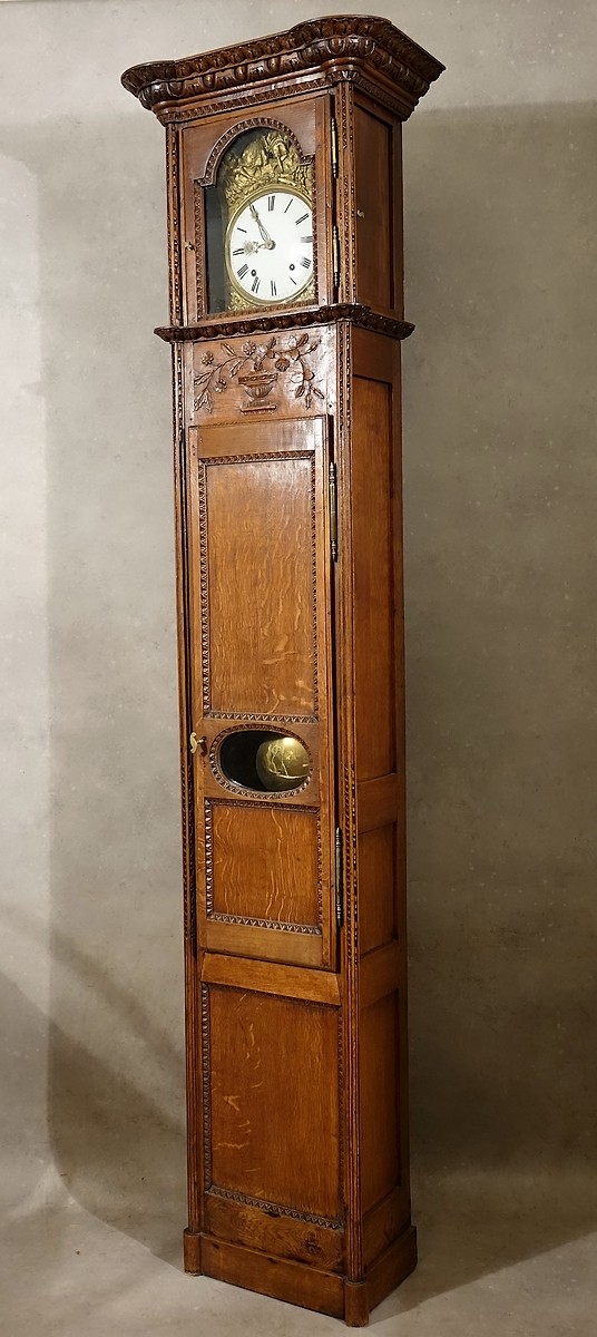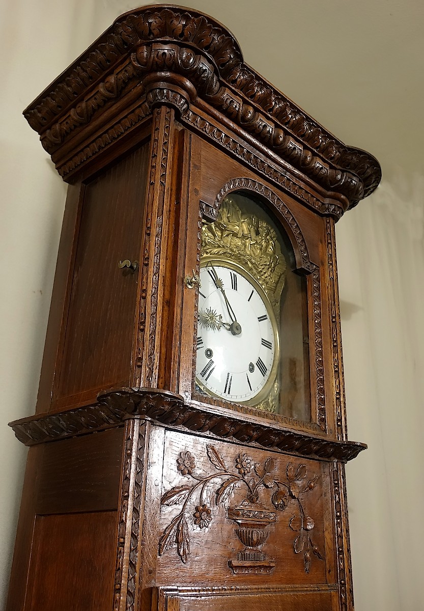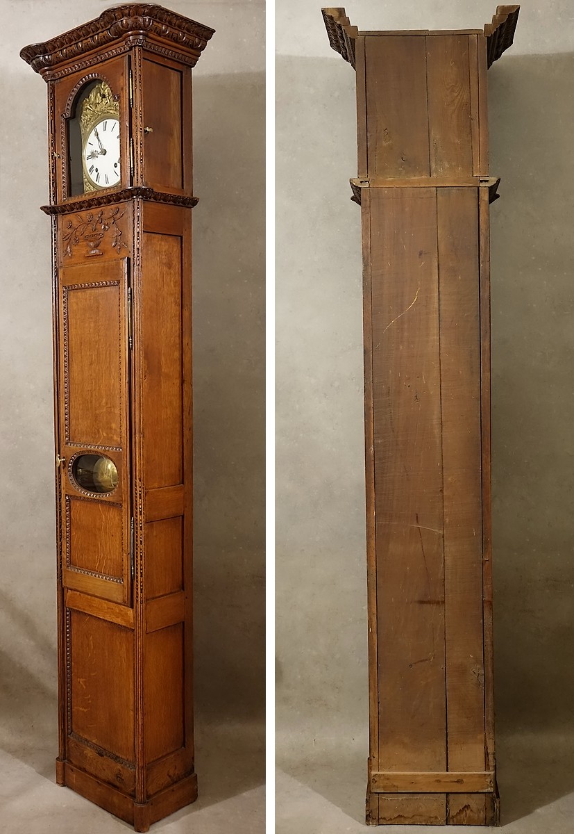 Indeed, this clock features a stepped cornice and slender columns exactly comparable to those found on Vire wardrobes and sideboards, as well as carved decoration with motifs and a fineness of execution characteristic of works produced by Vire sculptors. Moreover, it is entirely made of high-quality oak, with all visible parts in quarter-sawn oak (chêne merrain), which is yet another hallmark of the Vire workshops.