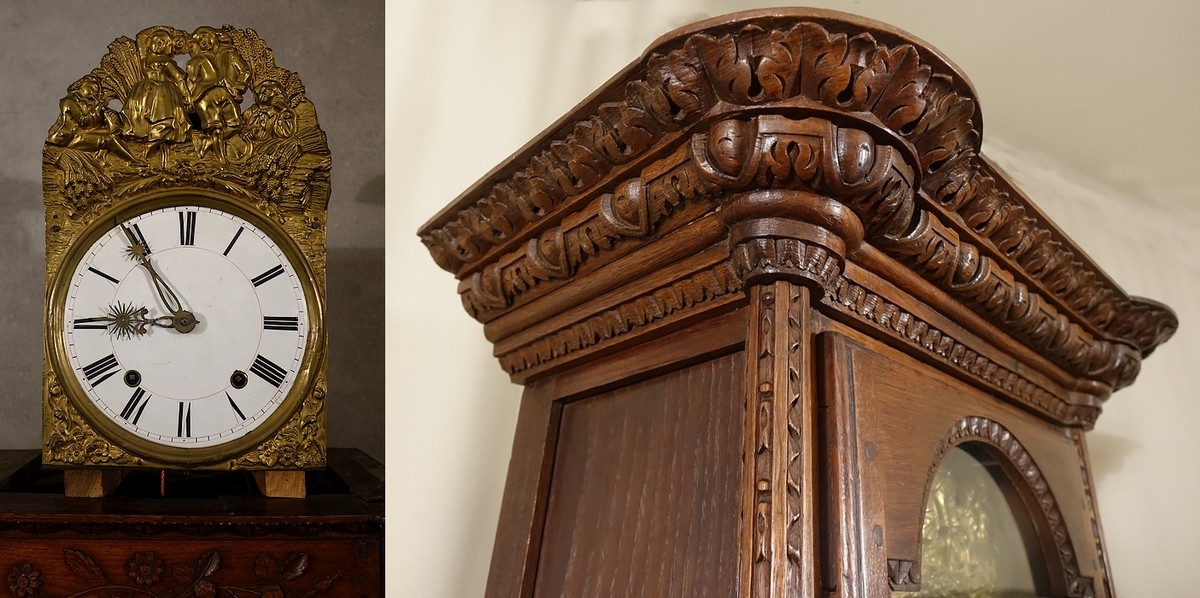 This clock also has a story, one that its last owner wished to share with us (somewhat surprised that we immediately attributed it to Vire, despite encountering it in Loire-Atlantique): on the evening of June 6, 1944, just before the bombings, his ancestors hastily fled the town of Vire—the mother taking the children by the hand, and the father pushing a wheelbarrow containing this very clock, along with bread and carrots for the evening meal… the essentials, in short!