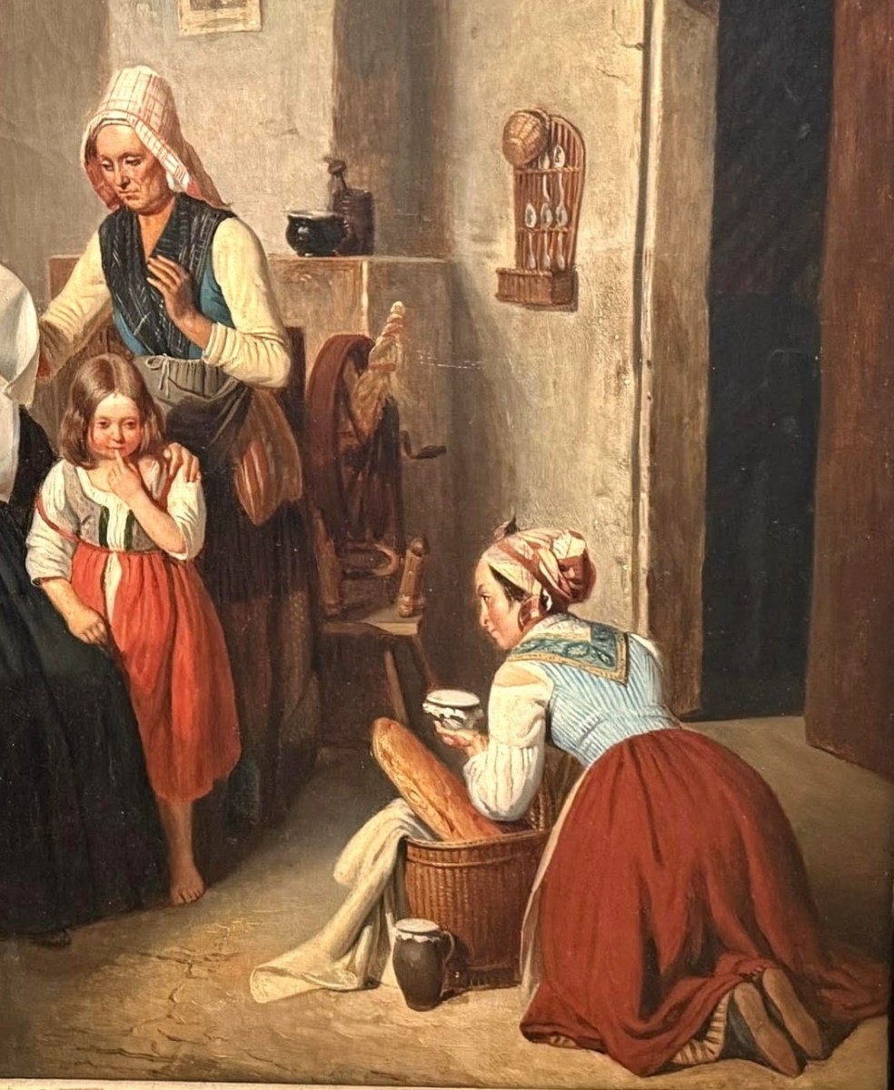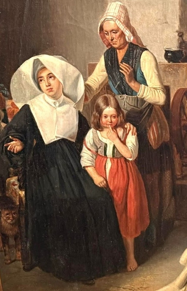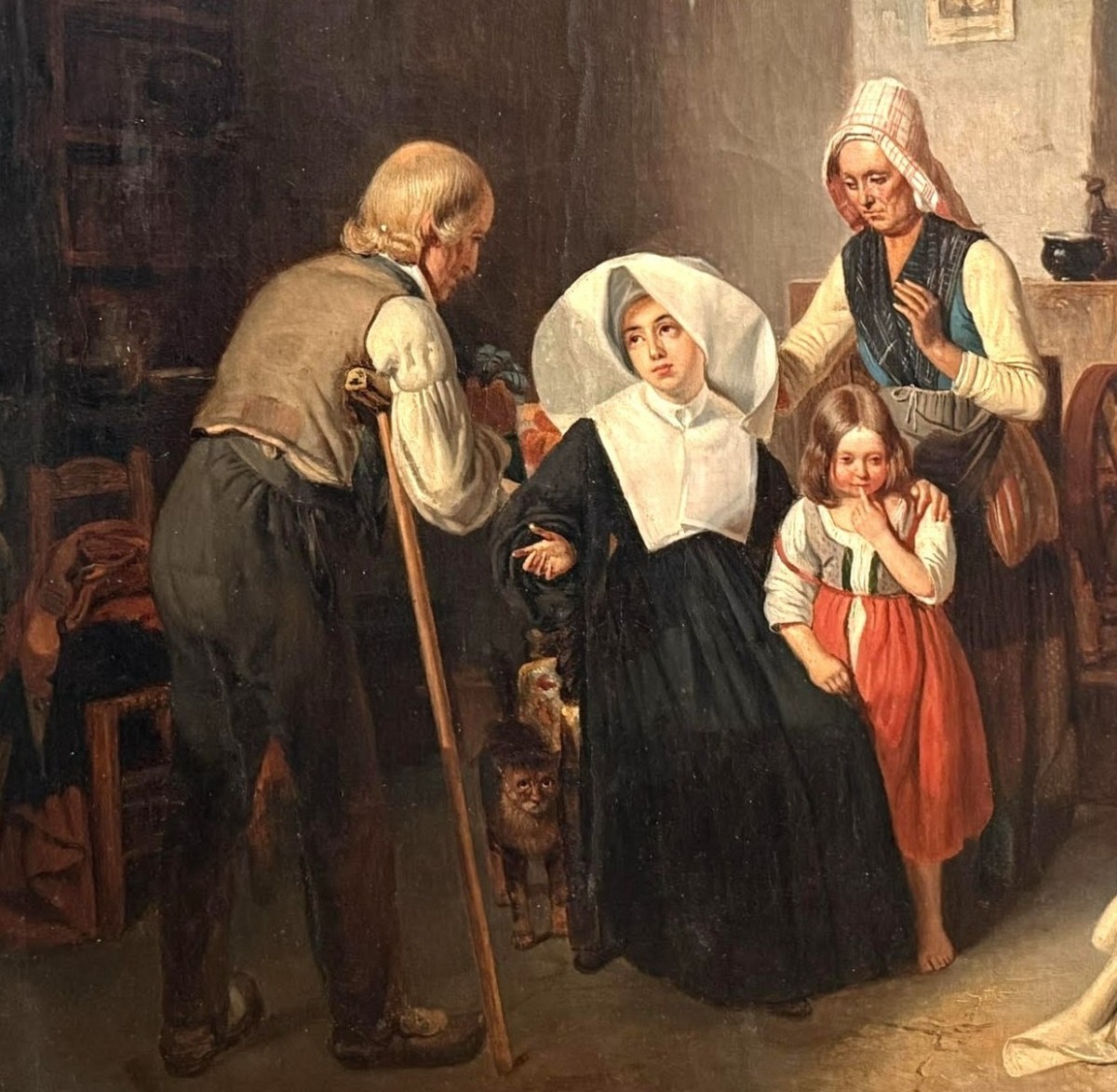 Pierre DUVAL LECAMUS (Lisieux 1790 - Saint-Cloud 1854) The Visit: oil on canvas Dimensions on stretcher Height: 47.8 cm - Width: 54.3 cm;on frame: 68.5 cm - 77 cm. Canvas previously re-stretched, old retouching repaired and cleaning carried out by our restorer. Genre painting of a peasantinterior, depicting a sister of Christian Charity visiting a family in need tobring them aid from her congregation. The order of her community, Charity, isrecognizable by her distinctive cornette. Seated in the center of the room onan armchair, her arm affectionately resting on the little girl's shoulder, sheasks the patriarch to entrust her youngest daughter to her so that she canteach her to read and write. The father, worn out by hard work, has to lean ona crutch; the exhausted mother stands slightly behind, while her eldestdaughter kneels eagerly unpacking the food brought by the sister. Pierre DuvalLe Camus was the son of a master glazier. At the age of 18, his parents senthim to Paris, where he discovered the arts and, in 1808, joined David's studio,where he caught the master's eye. He married Aglaé Virginie Le Camus, amarriage that propelled him into Parisian high society, as his wife's fatherwas a cavalry officer and her grandfather a lawyer and president of the ParisBar Association. In 1819, Pierre Duval Le Camus participated for the first timein the Paris Salon, where he would exhibit until 1853. His meticulous andpolished style, inspired by 17th-century Dutch artists, perfectly matched thetastes of the Duchess of Berry and the Duke of Orleans (the future King ofFrance: Louis-Philippe), and placed him in the same sphere as artists such asBoilly, Drolling, Grenier de Saint-Martin, Mallet, Roehn, Haudebourg-Lescot,Pingret, and Van Gorp. Pierre Duval Le Camus happily continued this vein ofgenre painting inspired by the art of the Dutch Golden Age during theRestoration and the July Monarchy. A taste for detail and the picturesque,polished painting without being mechanical, and subtle attention to the variousattitudes of the figures make the artist the best representative of this typeof painting in the 1820s. A genre and portrait painter, he was also alithographer, but his personal work in printmaking is not abundant. Many of hispaintings were engraved or lithographed, particularly by Léon Noël, whichgreatly contributed to the dissemination of his work, especially his familiaror peasant scenes, which were very successful, such as our painting, which isneither signed nor dated but is listed by inestimable.com. In 1833, heexhibited 17 paintings at the Salon. The reviews were eloquent, especially forhis small full-length portraits, “which are one of Mr. Duval Le Camus's happyspecialties” (Auguste Jal, Les Causeries du Louvre, Salon of 1833). Generallyflattering and elegant, the figures stand out against a luminous background. In1837, he founded the Lisieux Museum of Painting and Sculpture and, in the sameyear, was made a Knight of the Legion of Honor. In 1842, father and son beganexhibiting together at the Salons. They continued to exhibit together until1853. In 1848, Pierre Duval Le Camus moved to Saint-Cloud. In 1853, he becamemayor of the town. He died the following year, penniless, but leaving behindmemories of his kindness and generosity towards artists and his fellowcitizens. For several years, he was painter to the Duchess of Berry.His works can be found in many French museums, as well as atthe Hermitage in Saint Petersburg and the Clark Art Institute (USA). Bibliography: based on the press kit for the exhibition Les Duval Le Camus, peintres de père en fils (The Duval Le Camus family, paintersfrom father to son) at the Musée des Avelines, Musée d'Art et d'Histoire deSaint-Cloud.