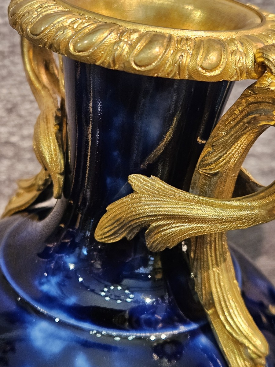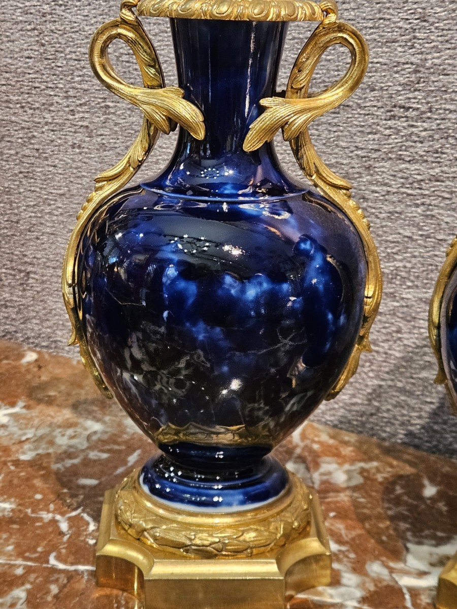 Rare and decorative pair of Sèvres porcelain vases with a deep, subtly nuanced blue ground, resting on an important finely chased gilt-bronze mount.