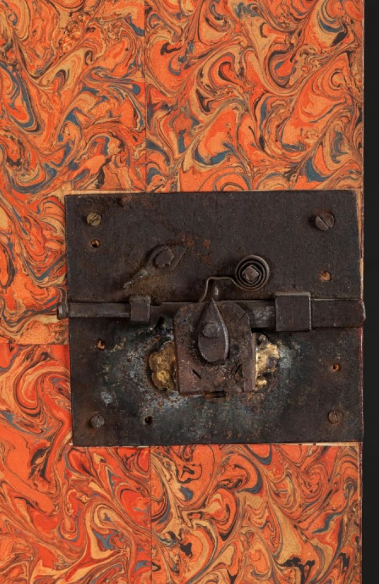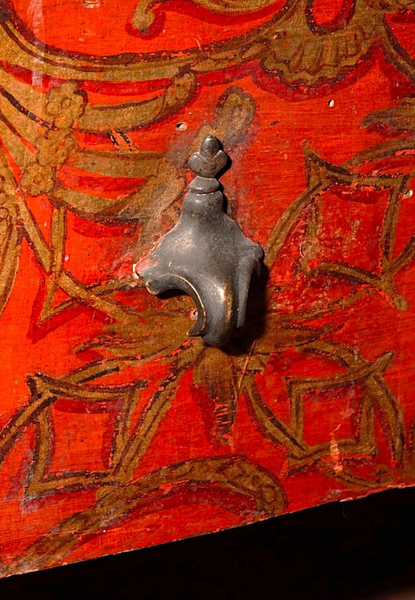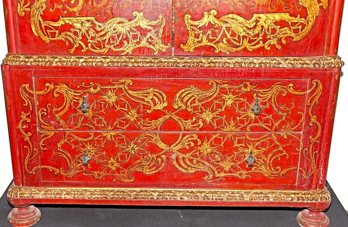 A two-part cabinet with impressive red lacquer painting and gilt decorations. The painting is in the Rengen style, featuring interlacing patterns and rocaille motifs. The doors have a central grid-like panel. The chest section rests on turned, round feet. The body segments are separated by carved and gilt moldings. The projecting cornice is also painted. The interior is lined with well-preserved marbled paper. Due to its age, the piece shows some retouching and repaired flaws, as well as minor wear and tear. Restoration of these areas can be arranged after consultation with a specialist. However, given the overall good condition of the lacquered surface, it should only be carried out as part of a careful plan by a qualified restorer. The piece originates from the Veneto region and was made around the mid-18th century.