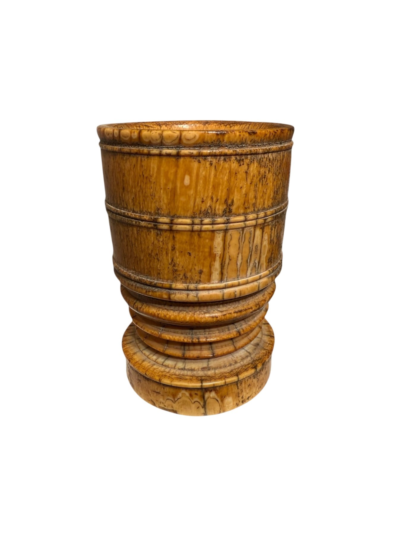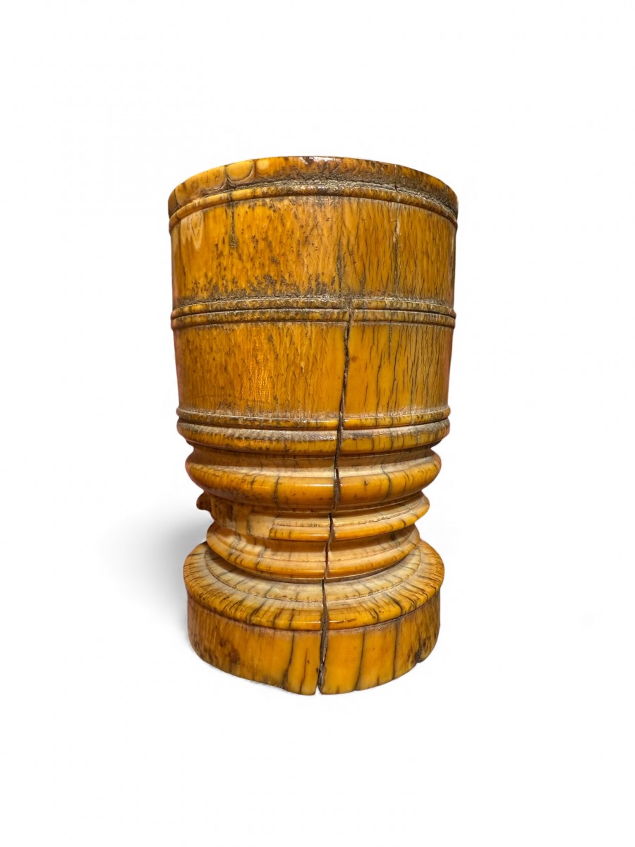 Rare Indo-Portuguese mortar carved from a single block of ivory, dating from the 17th century. Of cylindrical form with a finely turned stepped base, it displays a warm honey-coloured patina and natural striations typical of early ivory.