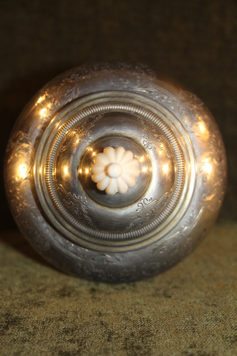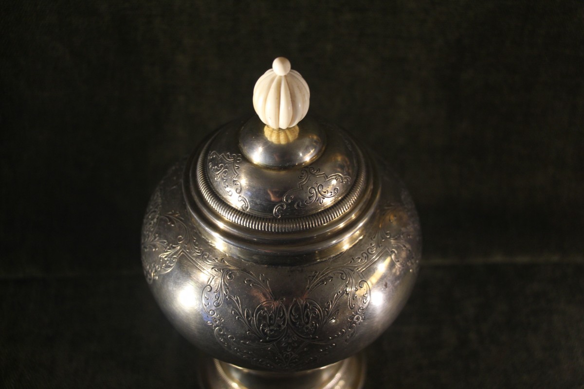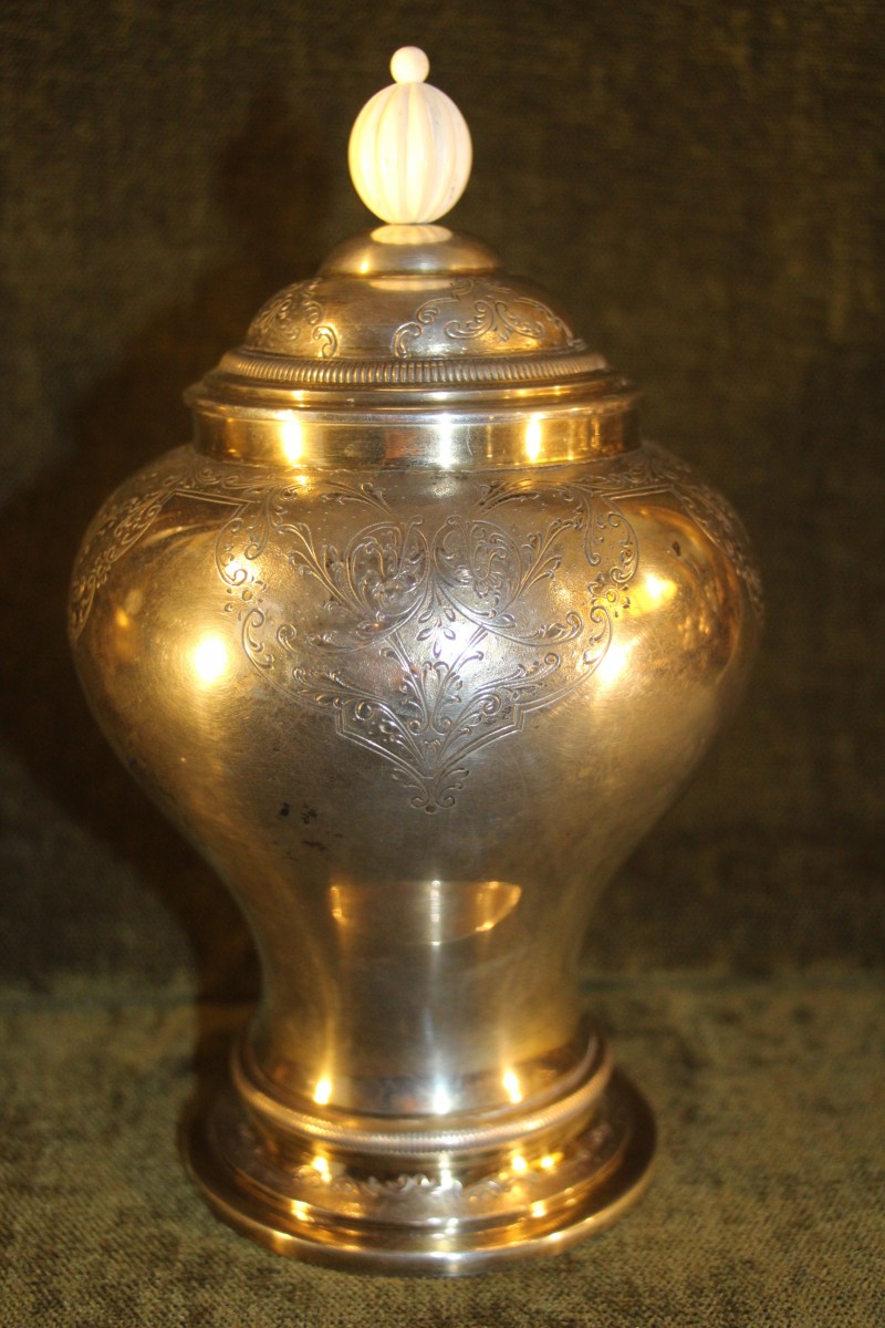 We present this very elegant lidded pot, finely chased with foliage and scrollwork, finished with a pedestal foot on its base.