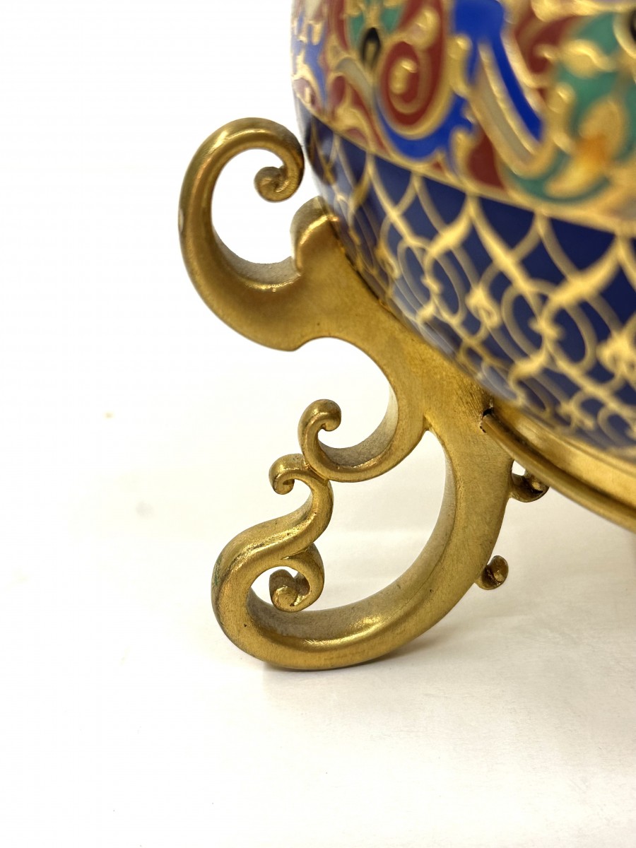 Large round box in "champlevé" enamels, with scrollwork mount in gilded bronze. By Ferdinand Barbedienne and Constant Sévin (1821–1888)