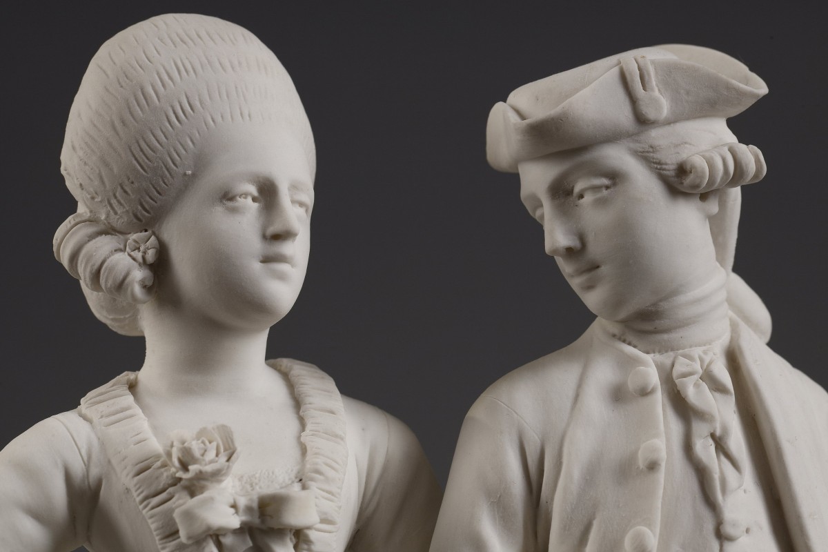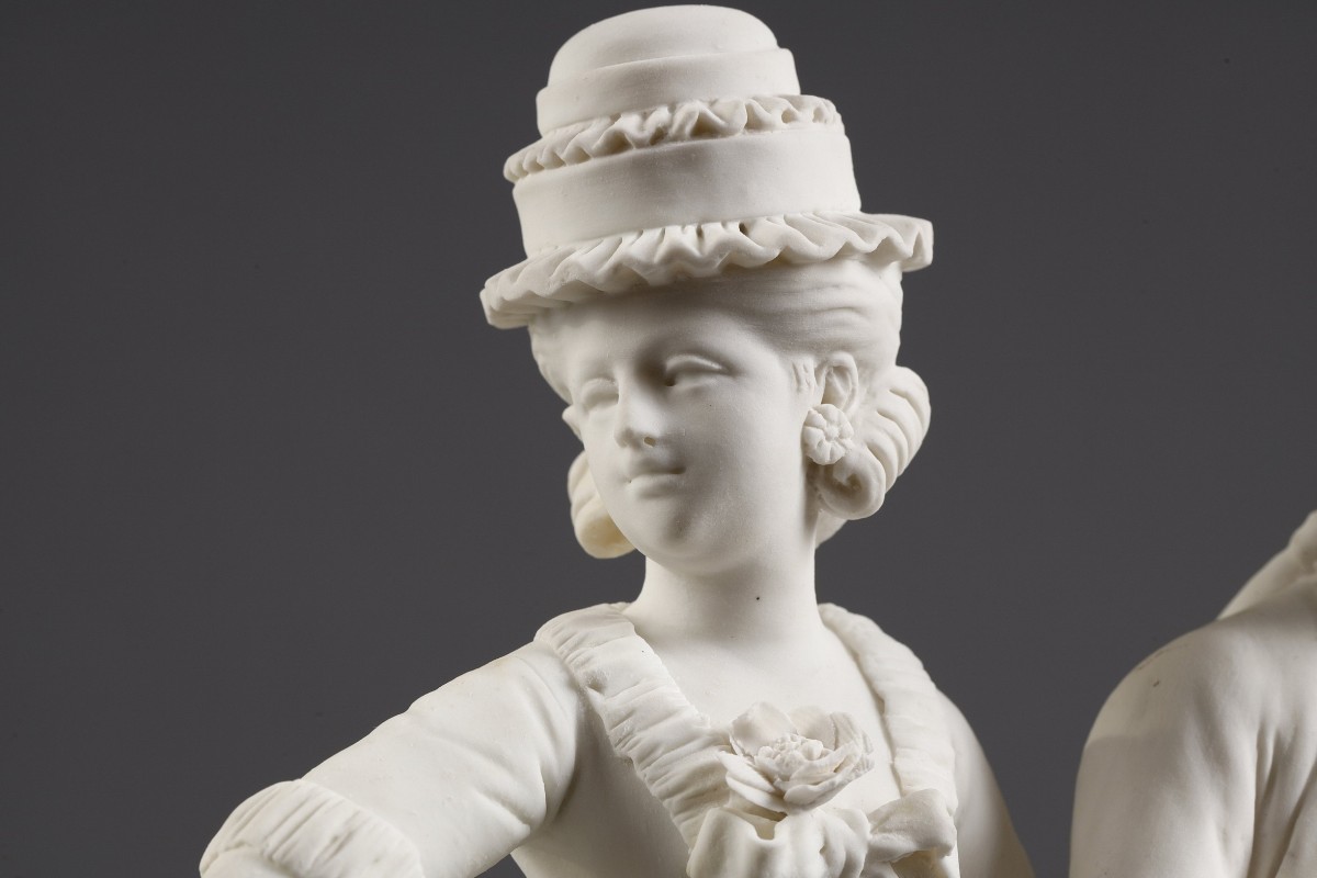 Rare pair of biscuit porcelain groups depicting elegant families strolling, likely originating from one of the table centrepieces themed around the Real Passeggio (Royal Promenade).