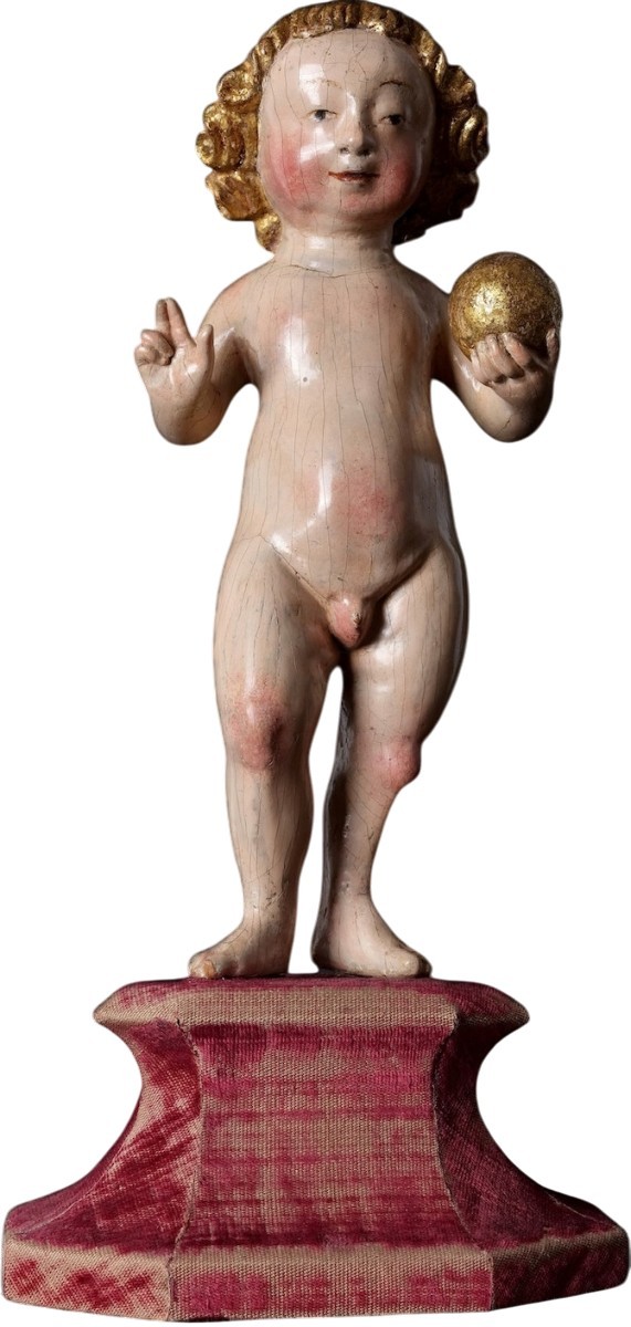 An important comparable piece is now in the Louvre in Paris (inv. no. RF 2009.05). There, too, the child is depicted unclothed and standing in contrapposto, with a gesture of blessing and a globe. The close stylistic relationship can be seen in particular in the flatly laid calotte hairstyle and the curls that stand out at the sides in volutes.