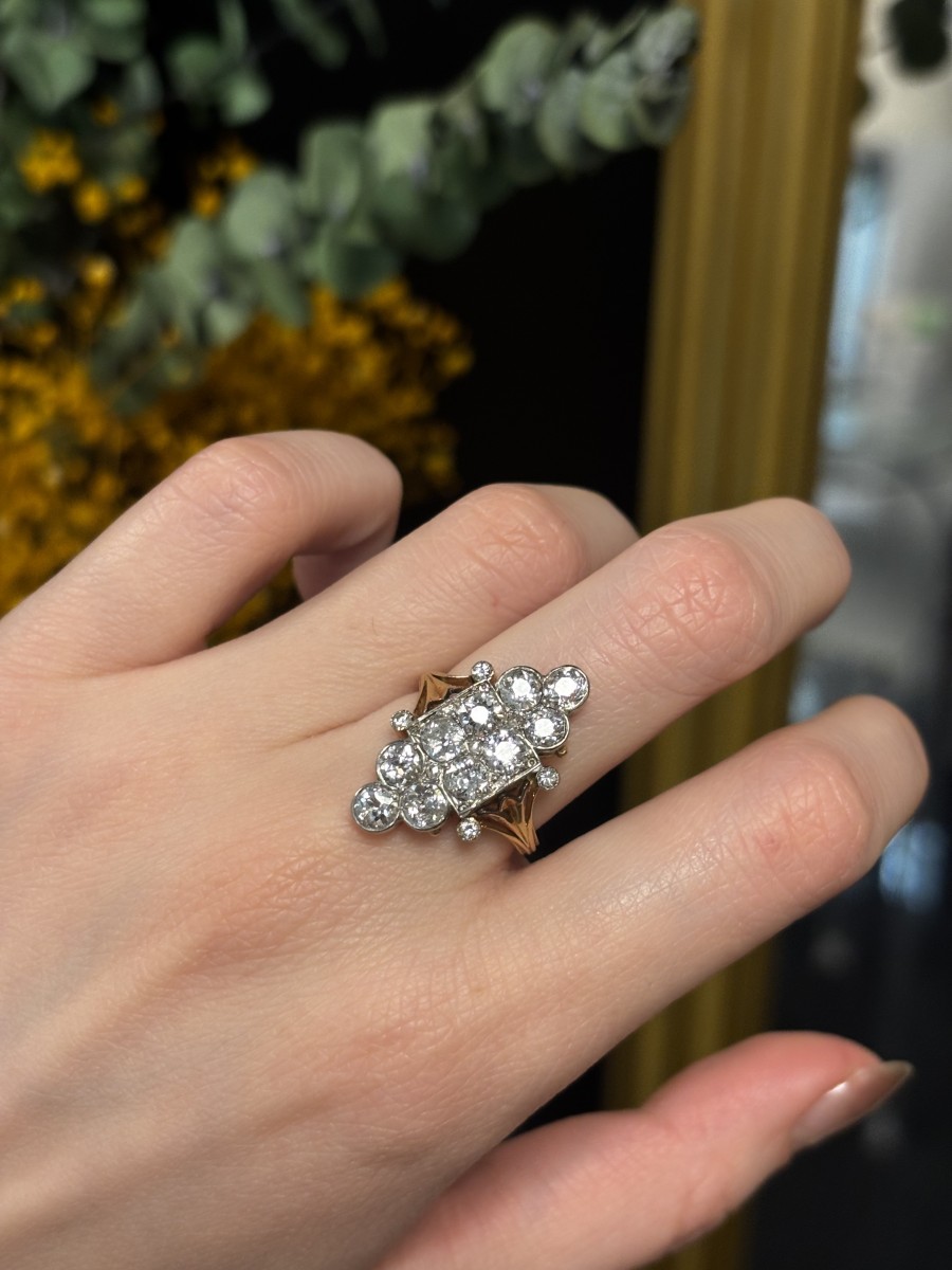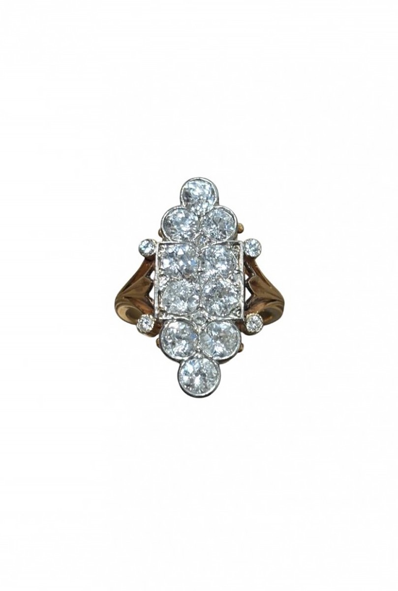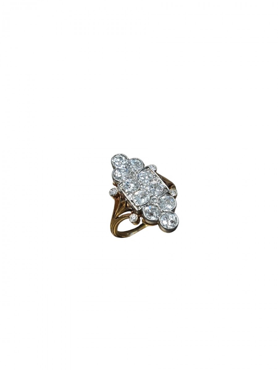 18k yellow gold and platinum marquise-shaped ring with an architectural border of trefoils, set with old-cut diamonds, curved basket setting, very fine pierced work, early 20th century.