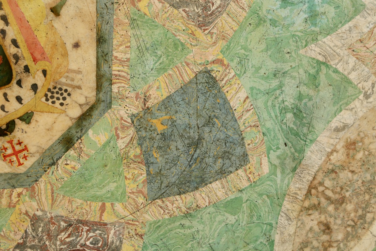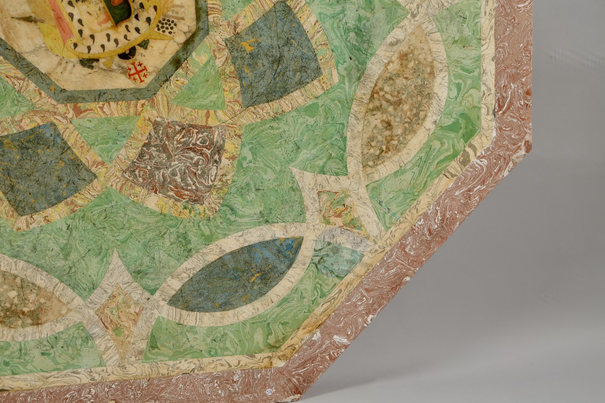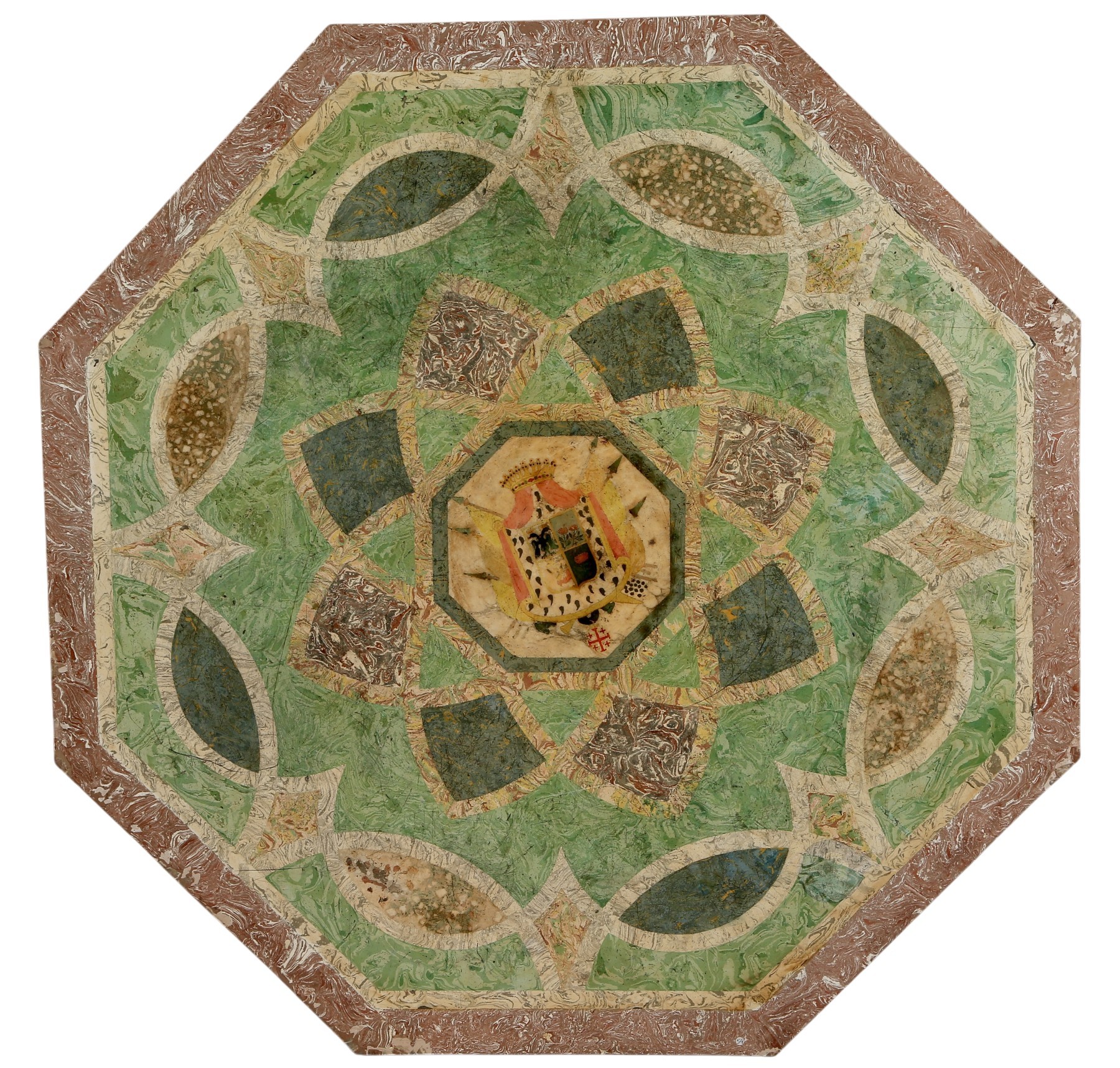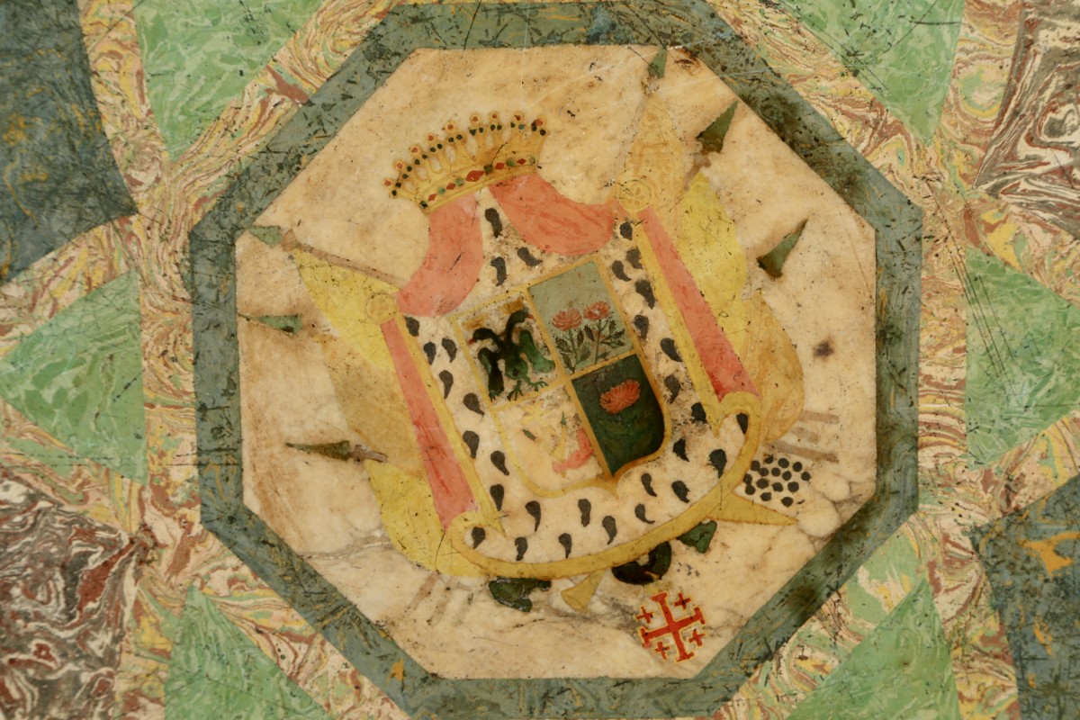 It could be attributed to the Tocco family of Kefalonia. Indeed, the coat of arms discovered on the edge of a well in the medieval fortress of Arta presents a coat of arms which has a sinister illustration of a doubly crowned two-headed eagle (relation to Byzantium). Like ours, it presents itself with its wings not spread and its beak closed, a crown overhanging each head. However, unlike ours, it is gold. Other coats of arms, those of Enzo of Sardinia could, by similarity, also correspond to ours.