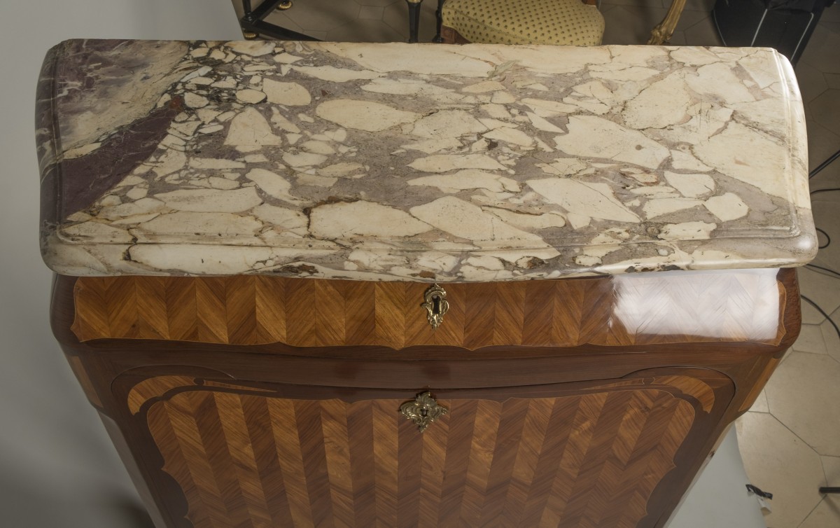 The top is made of breccia marble with a molded edge.