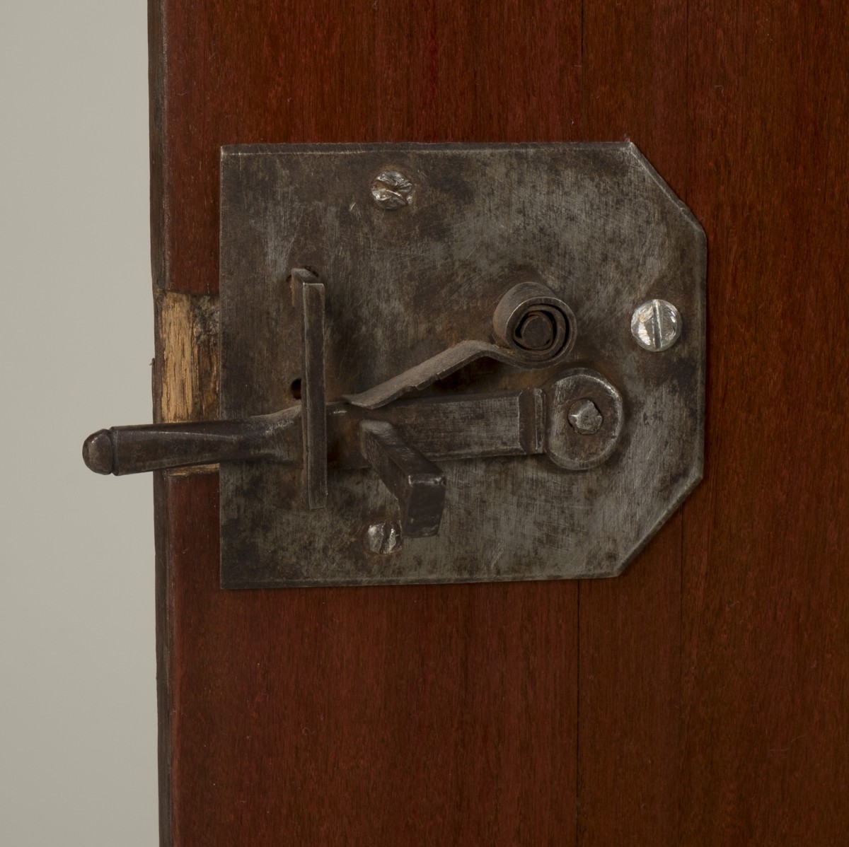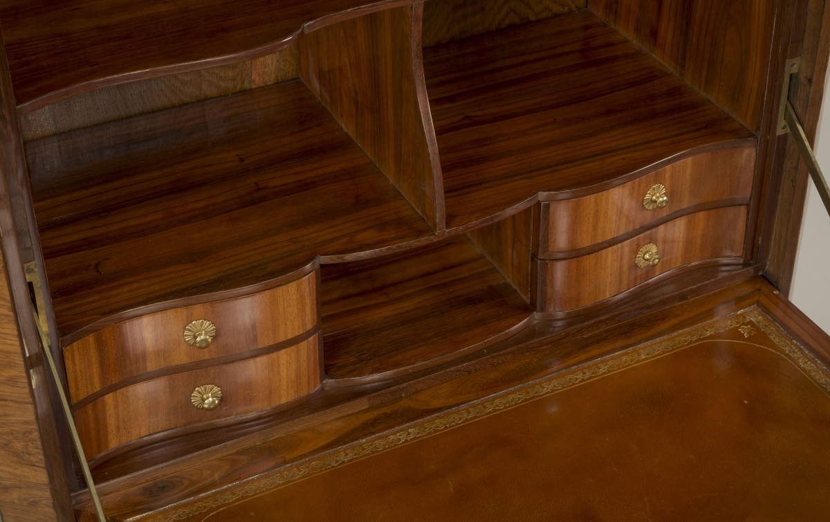 This secretary desk is distinguished by the purity of its craftsmanship and the rarity of the absence of a crossbar between the two doors and the drop-front.