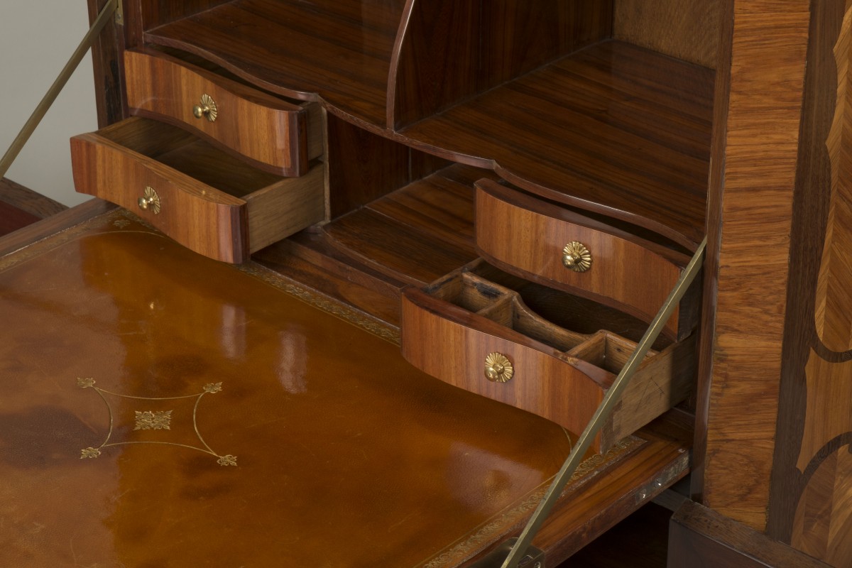 This secretary desk is curved on the sides and front.