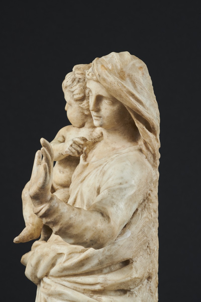 This marble Virgin and Child belongs to Roman sculpture of the seventeenth century, at the intersection of a classicism inherited from Antiquity and the iconographic requirements of post-Tridentine art. The work is closely related to the formal language developed by Alessandro Algardi, drawing upon a model he elaborated in Rome around the middle of the century and widely disseminated through his workshop and artistic circle.