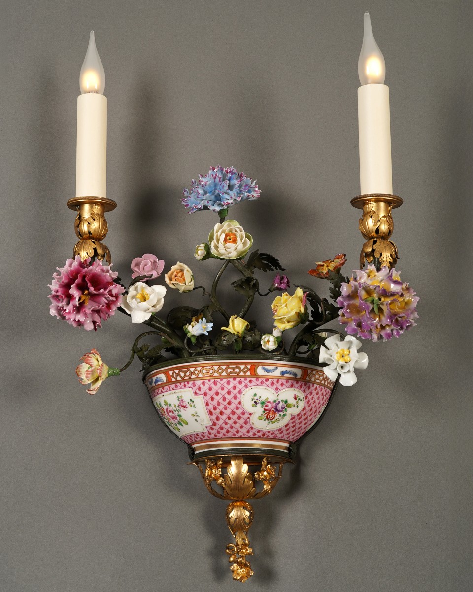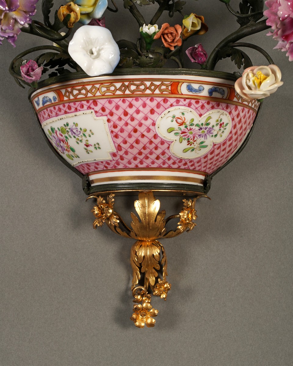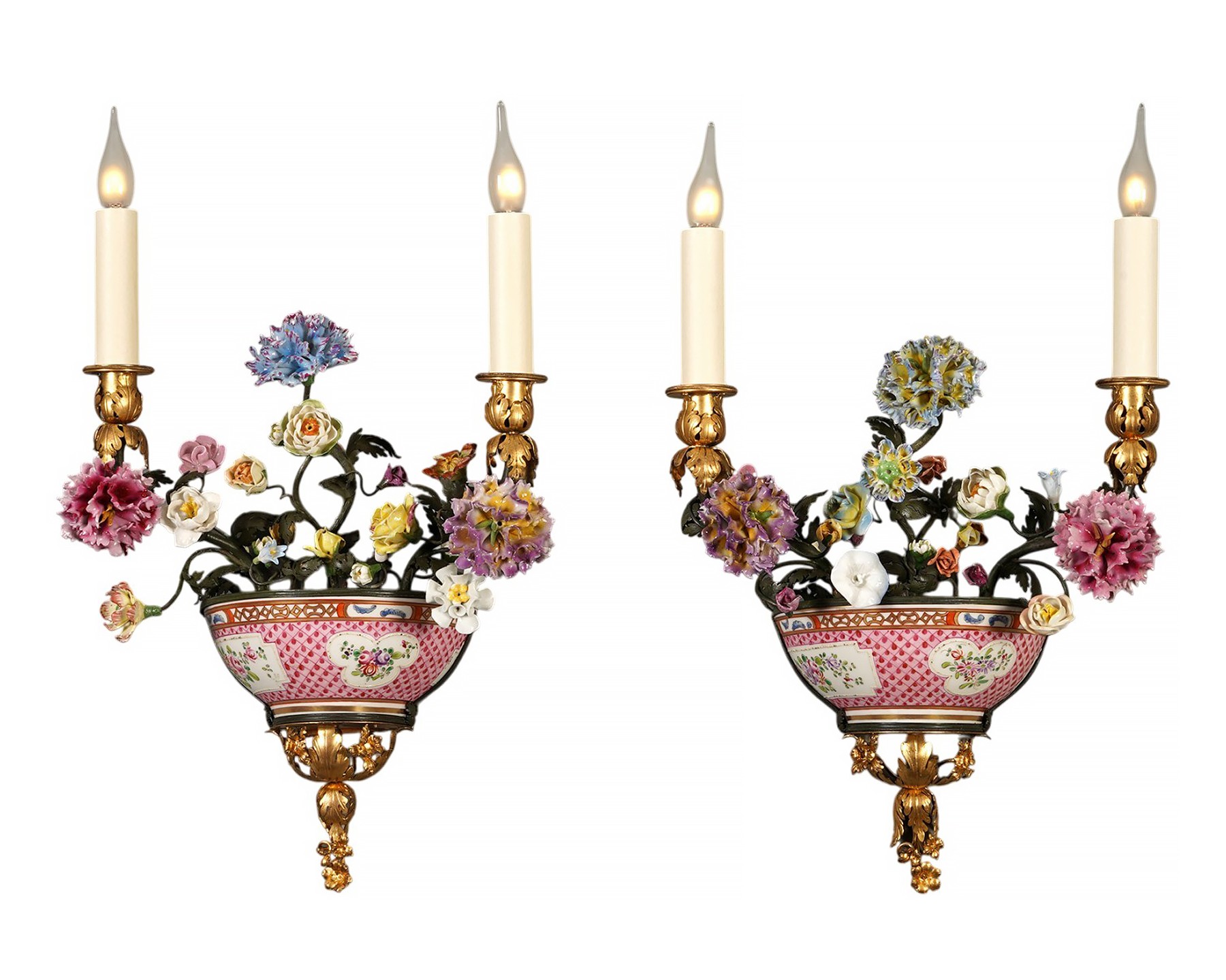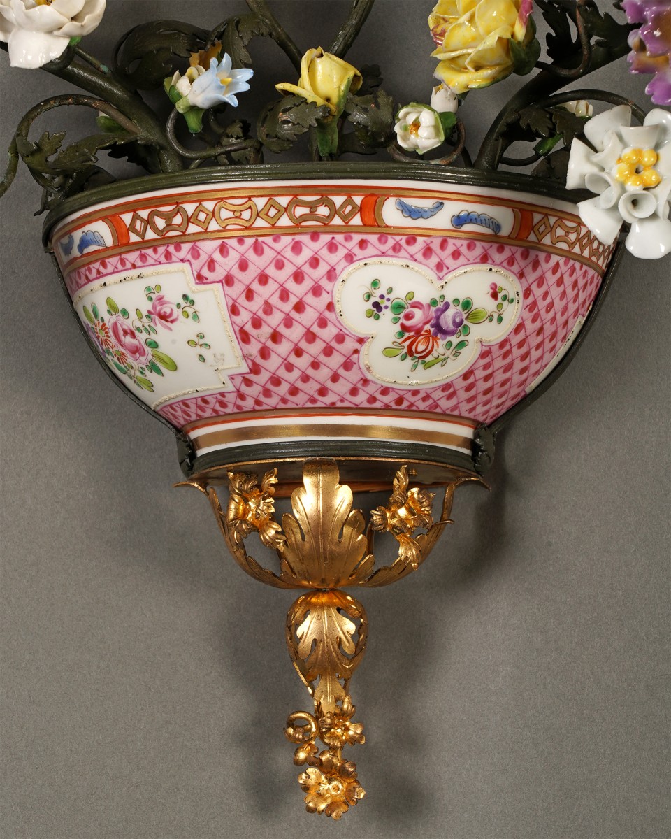 Pair of wall-lights with two light-arms in sheet metal, gilded bronze and painted porcelain with gold highlights attributed to L'Escalier de Cristal. Each composed of a half-cup with floral decoration in cartouches on a pink pastille background, surmounted by a bouquet formed of polychrome porcelain flowers and painted sheet metal leaves. They rest on a small gilded bronze console with leaf and flower motifs.