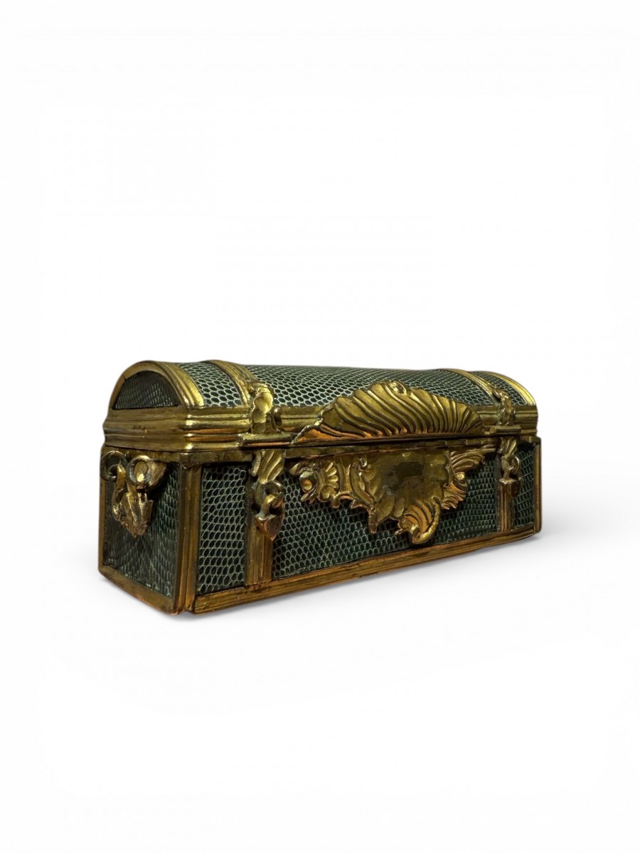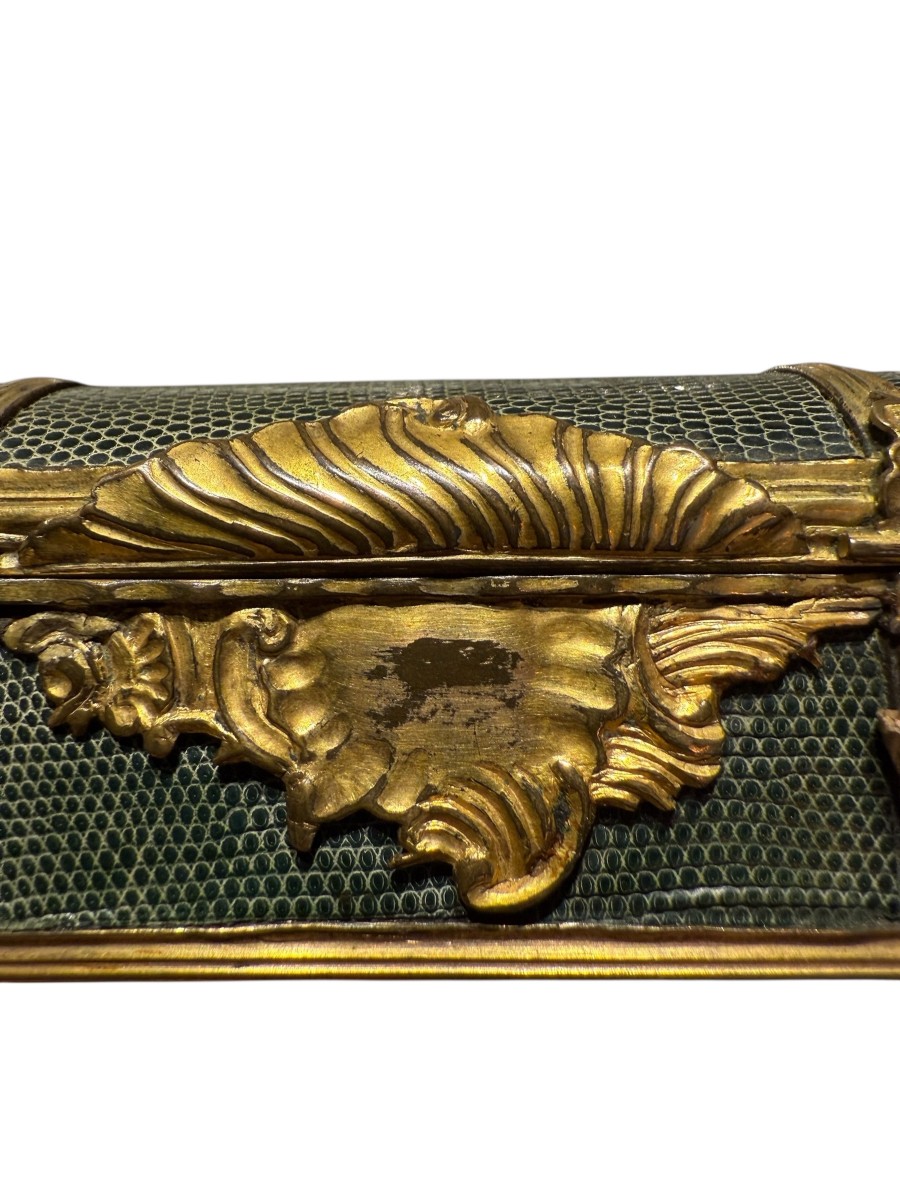 A small rectangular 18th-century casket, crafted in gilt bronze and decorated in the Louis XV style. The slightly domed lid is encircled by molded bands and features a surface decorated to resemble reptile skin, likely an inlay or surface treatment typical of luxury objects of this period. The front is dominated by a large, finely chased rocaille cartouche composed of asymmetrical volutes, scrolls, and foliate motifs characteristic of the Louis XV style. The corners are accentuated with small sculpted heads and ornaments, adding relief and elegance to the whole. The sides and back repeat the same textured decoration, framed by gilt moldings. The interior, also gilt, displays an old patina with traces of oxidation, attesting to its age and authenticity. This box, probably intended to hold small precious objects — jewelry, gloves, or writing accessories.