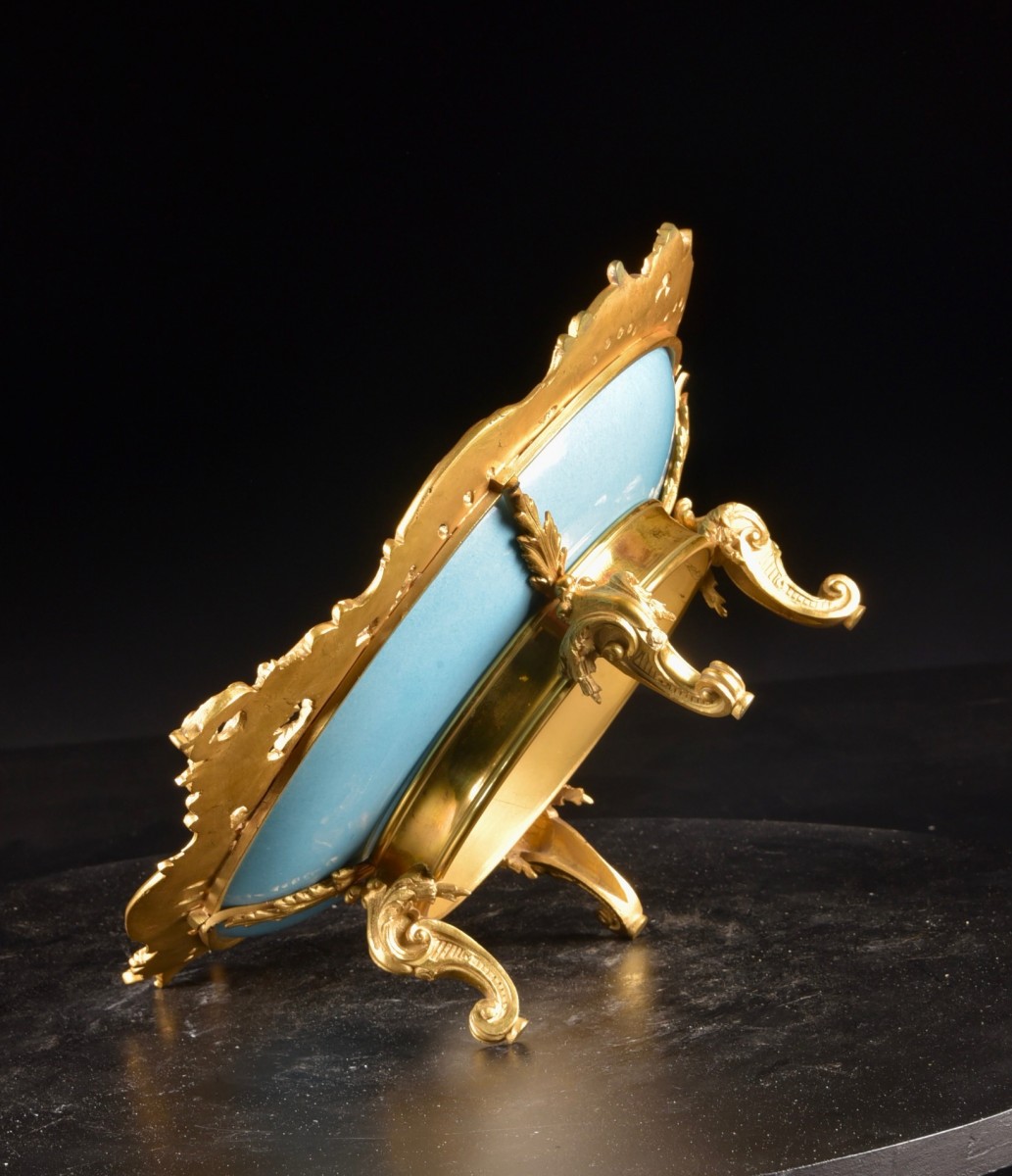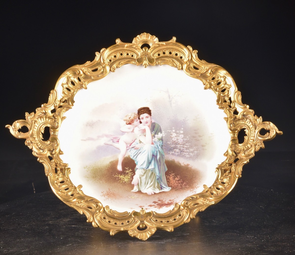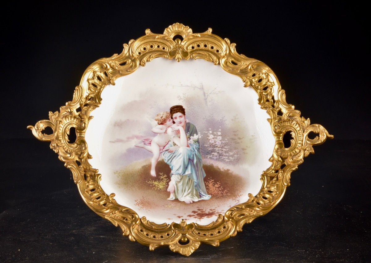 An elegant French porcelain dish, richly mounted in a sumptuous, high-quality gilt bronze frame. The bronze work is finely chased and openwork, adorned with rocaille motifs and elegant scrolls, displaying a warm and luminous gilding characteristic of late 19th-century French ornamental bronze. The porcelain center is decorated with a charming hand-painted tableau depicting a graceful young woman holding a putto, a scene imbued with sweetness and poetry. The composition, executed in delicate and nuanced tones, draws inspiration from classical and sentimental themes. The painting is signed “Richard,” presumably the decorator (porcelain painter) of the scene. The reverse also reveals great care in execution, with a turquoise glazed porcelain background and a sturdy bronze support system, allowing for an elegant vertical display, like a true salon object. The refined combination of painted porcelain and gilt bronze gives this piece a luxurious and decorative character, typical of French production during the Napoleon III period. Dimensions: 43 × 36 × H 13 cm
