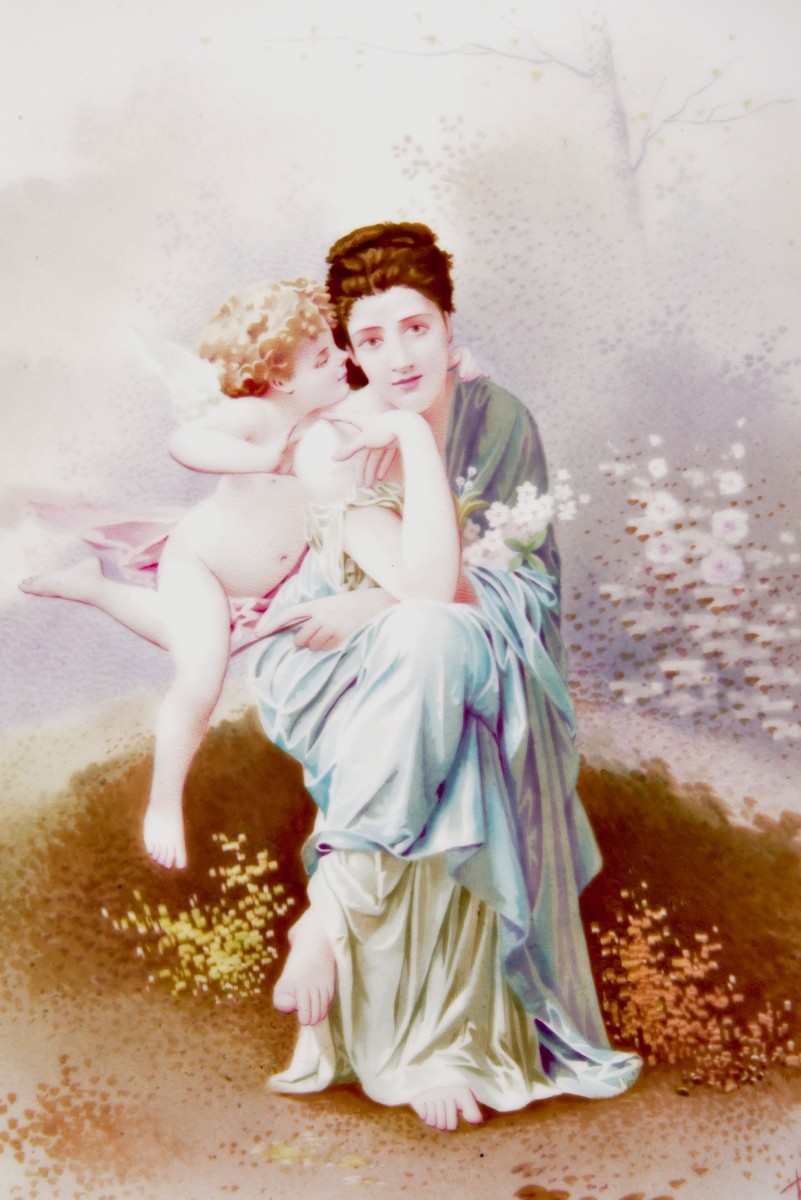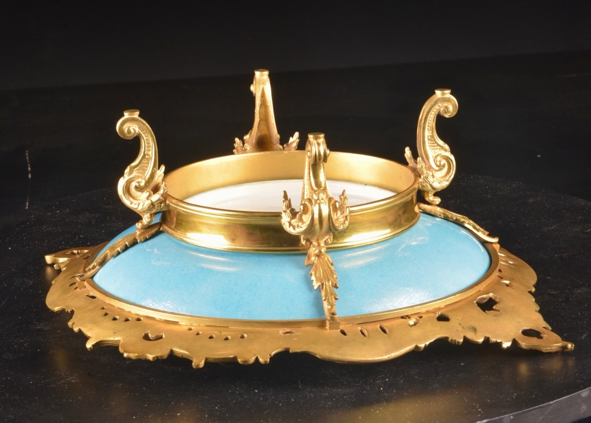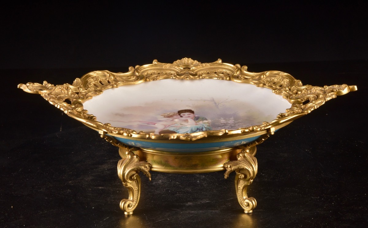 An elegant French porcelain dish, richly mounted in a sumptuous, high-quality gilt bronze frame. The bronze work is finely chased and openwork, adorned with rocaille motifs and elegant scrolls, displaying a warm and luminous gilding characteristic of late 19th-century French ornamental bronze. The porcelain center is decorated with a charming hand-painted tableau depicting a graceful young woman holding a putto, a scene imbued with sweetness and poetry. The composition, executed in delicate and nuanced tones, draws inspiration from classical and sentimental themes. The painting is signed “Richard,” presumably the decorator (porcelain painter) of the scene. The reverse also reveals great care in execution, with a turquoise glazed porcelain background and a sturdy bronze support system, allowing for an elegant vertical display, like a true salon object. The refined combination of painted porcelain and gilt bronze gives this piece a luxurious and decorative character, typical of French production during the Napoleon III period. Dimensions: 43 × 36 × H 13 cm