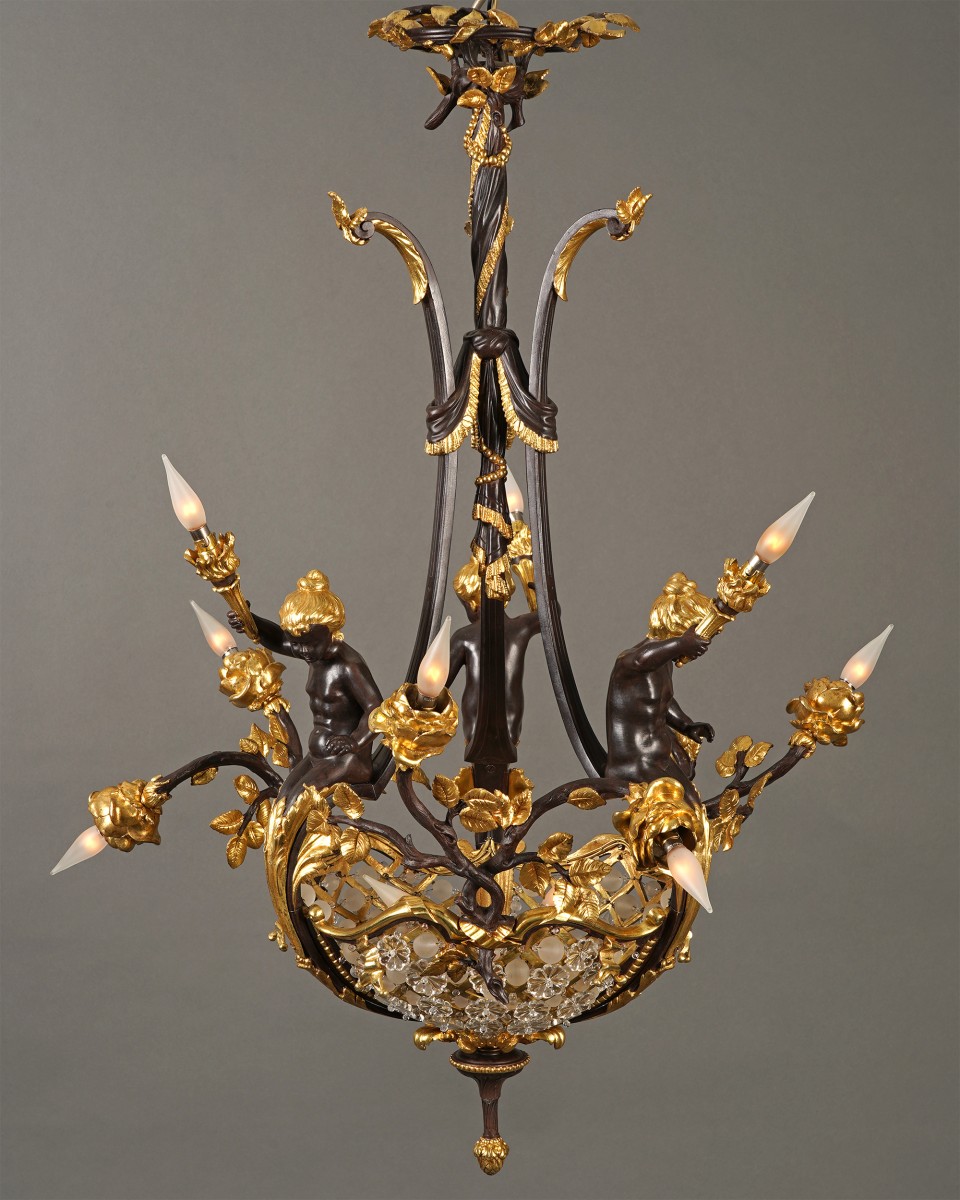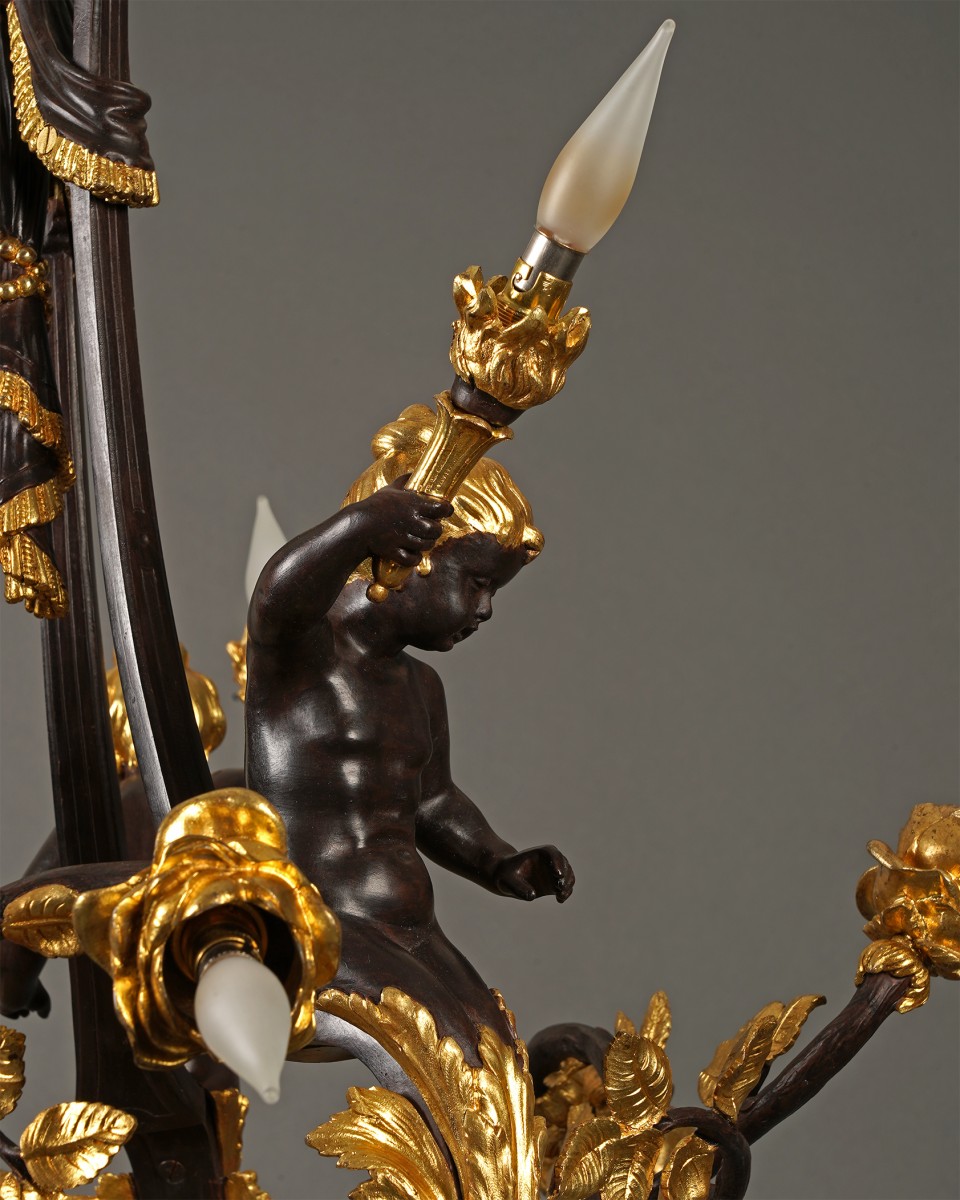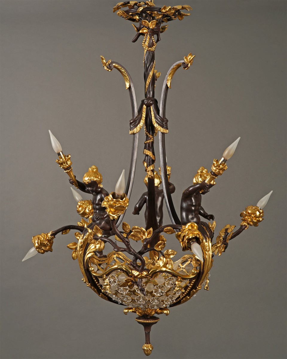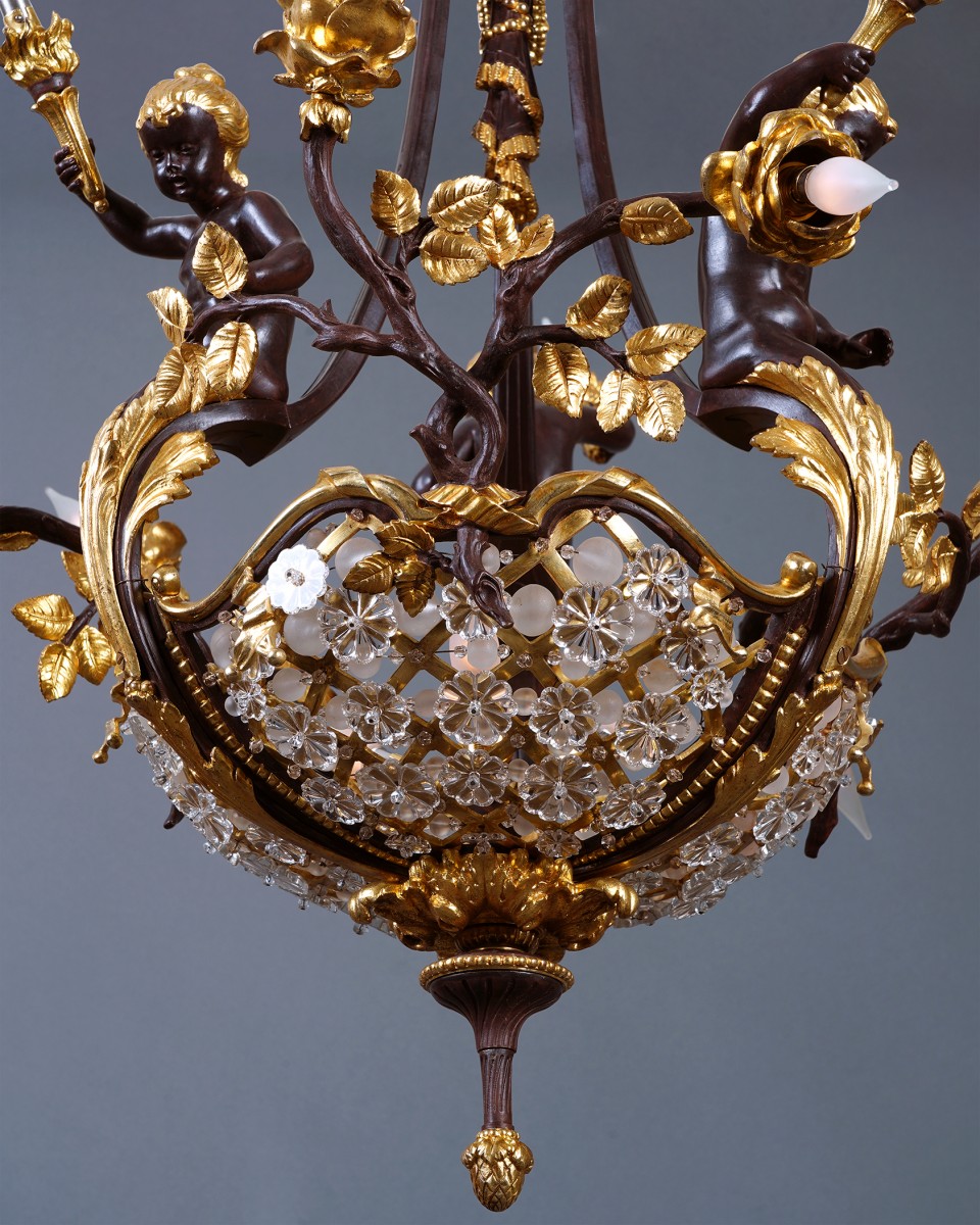 Charming gilded and patinated bronze chandelier composed of nine branches ending with illuminating roses. The central lattice basket of pearls and crystal rosettes supports three seated cherubs carrying luminous torches. The whole is suspended by ribboned uprights ending in a ceiling light with openwork foliage decoration.