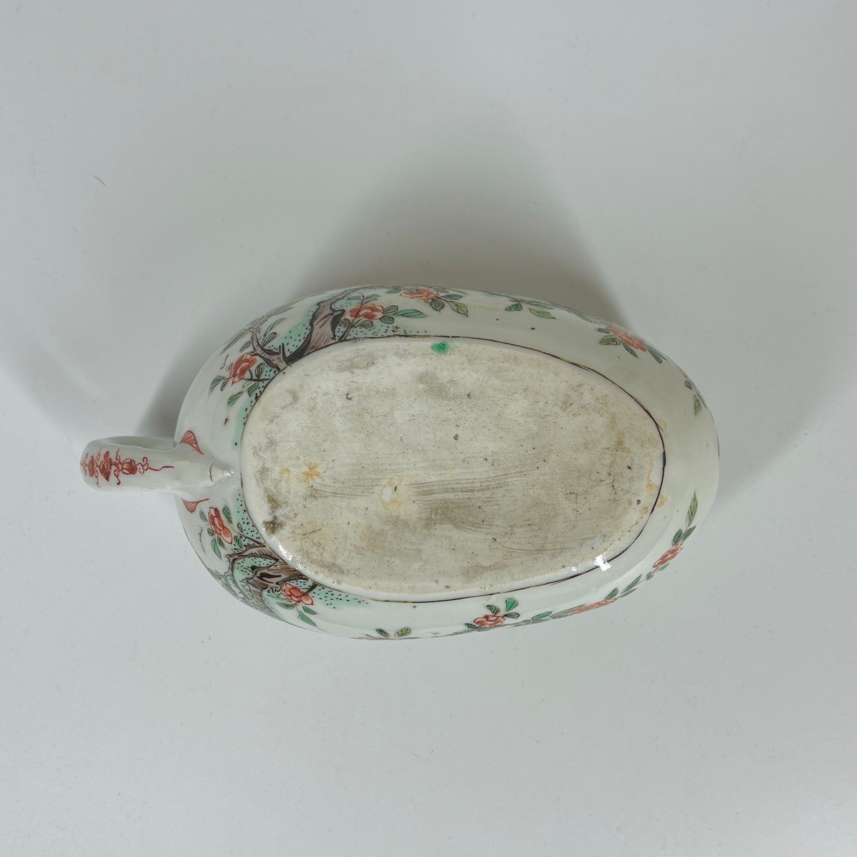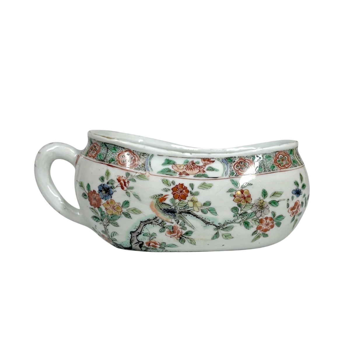 A Famille Verte porcelain Bourdaloue with polychrome and gilt decoration of flowering branches and birds. It features fish, shrimp, and crab in reserves.