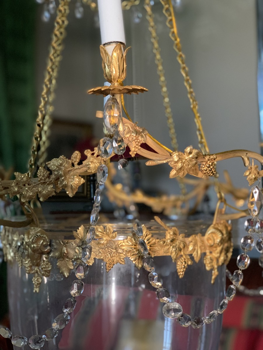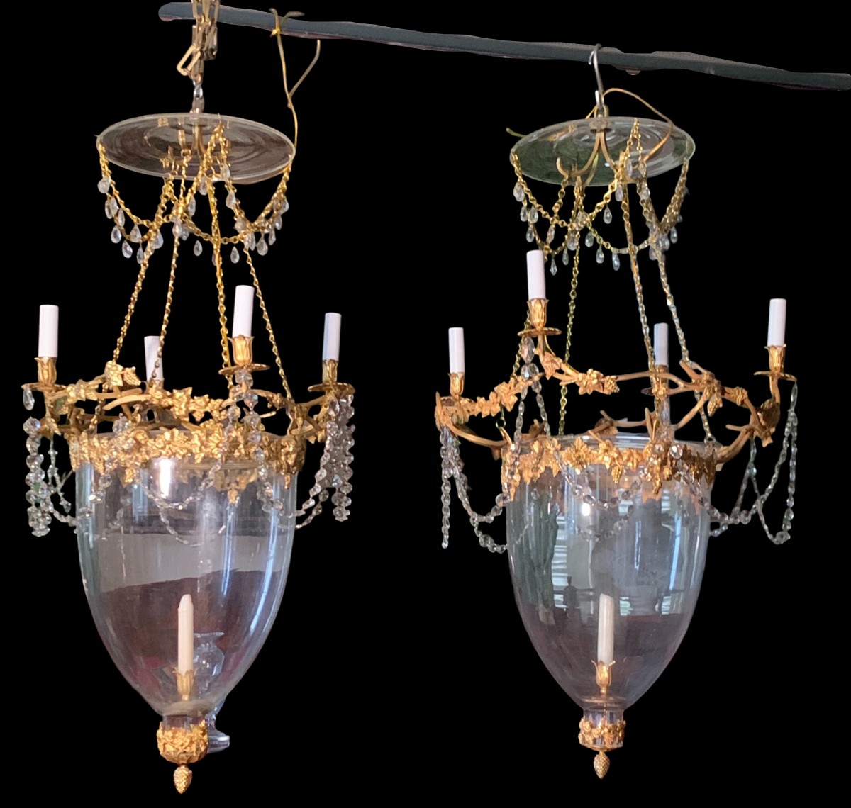 Pair of Russian-style lanterns, original design featuring a motif of branches, grapes, and vines, topped with a crystal smoke burner. Rich gilt bronze mount adorned with chains and cut crystal pendants. Four peripheral lights and one internal light.