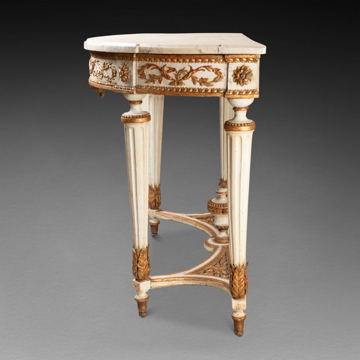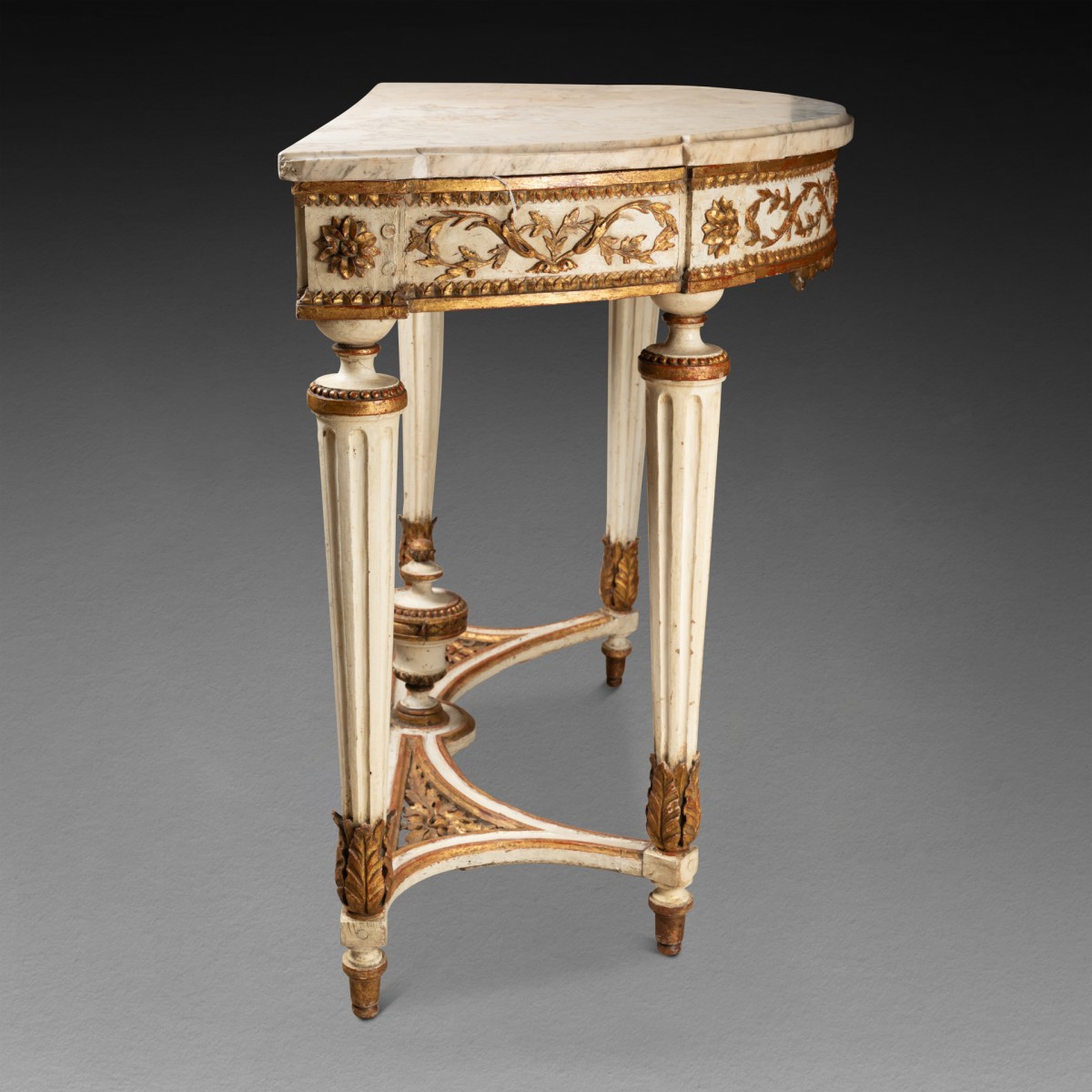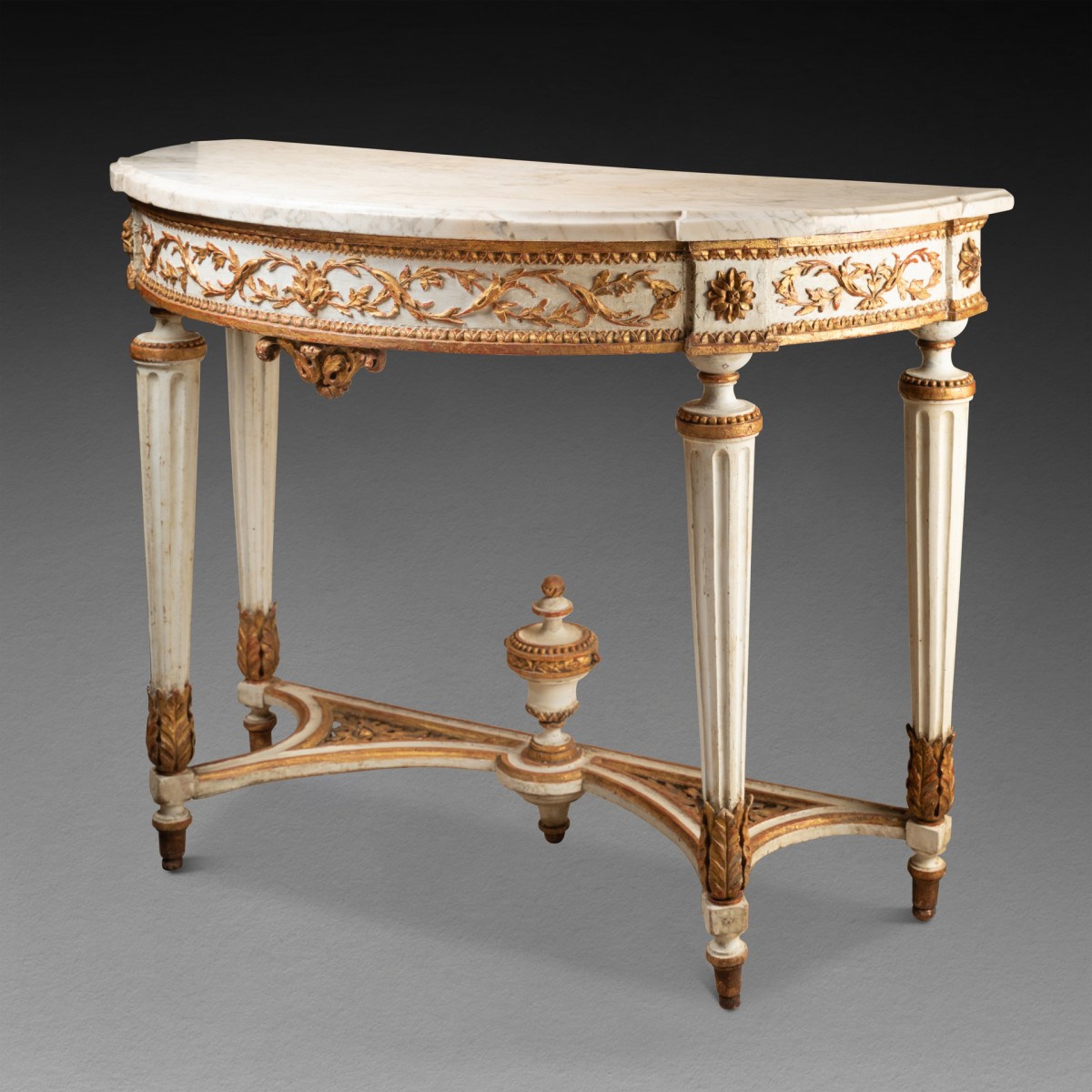 Half-moon console table in carved and cream-lacquered wood, with a carved belt in relief featuring large garlands of leaves and fruits in gilded wood ; resting on four legs with wide fluting , decorated at the bottom with a scroll of acanthus leaves ; joined by an openwork crossbar decorated with floral motifs , topped with a fire pot. White marble top.