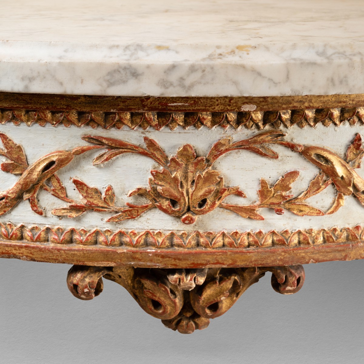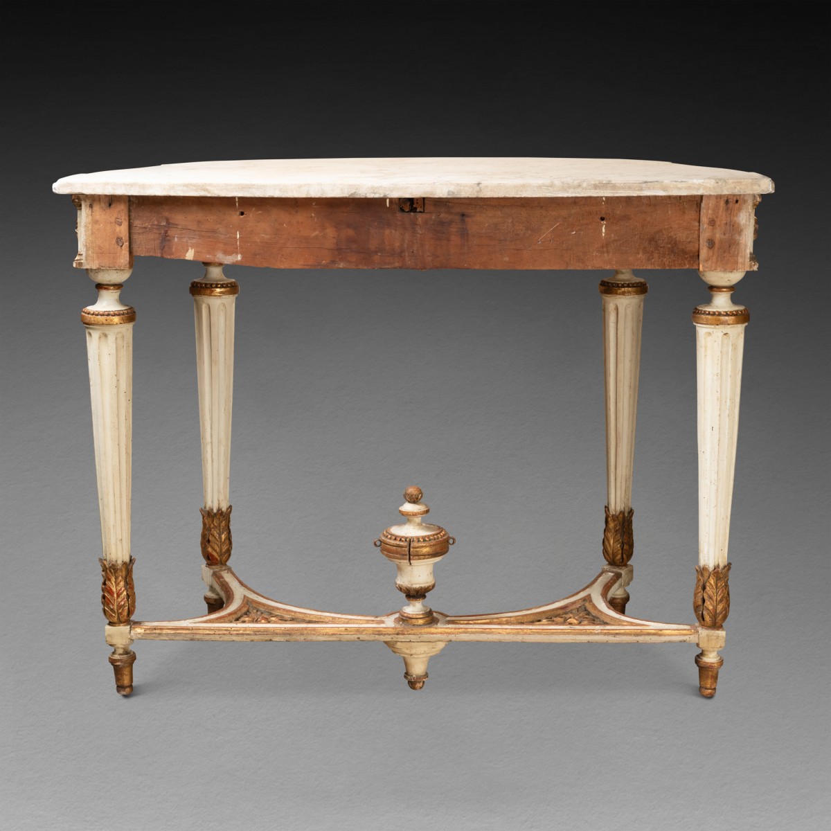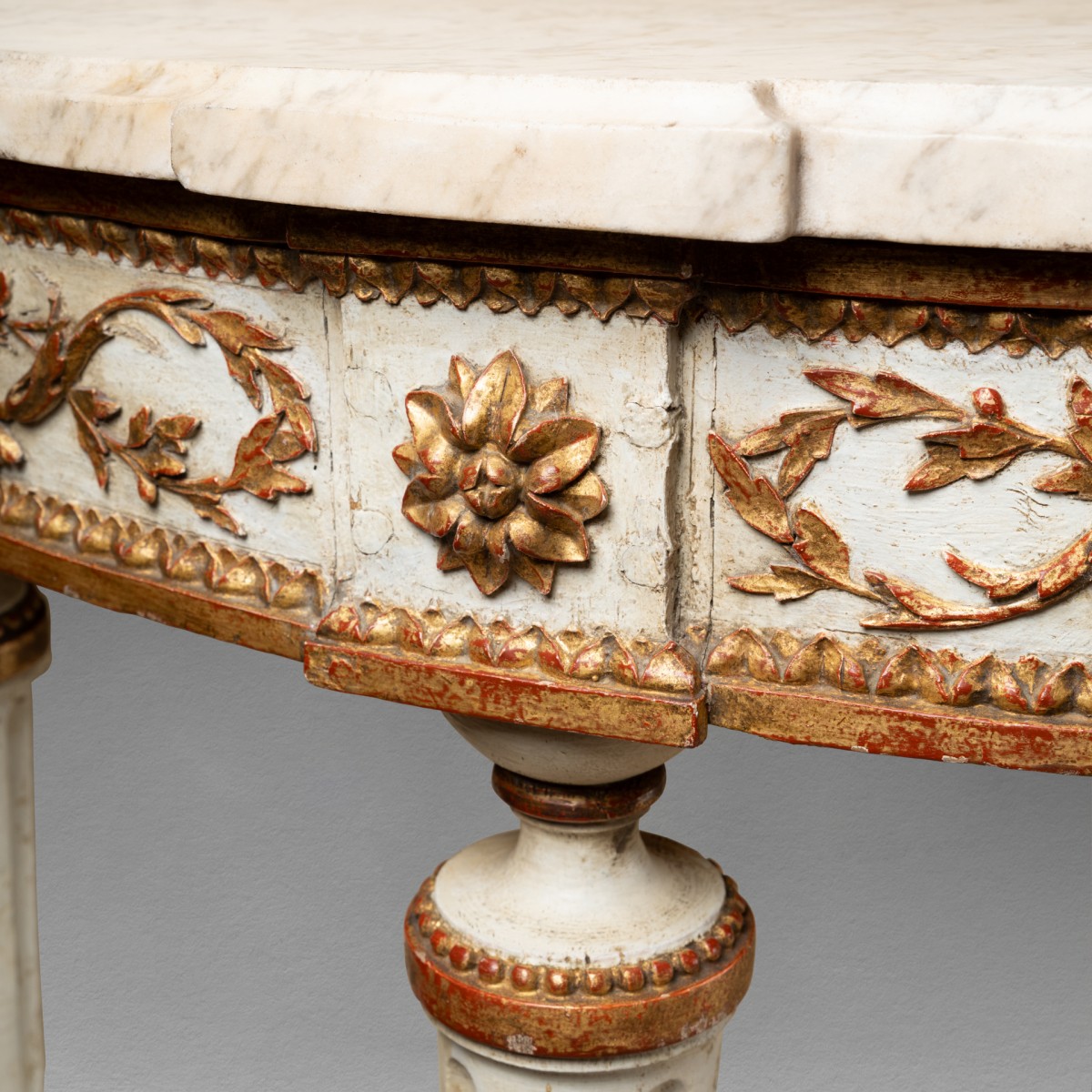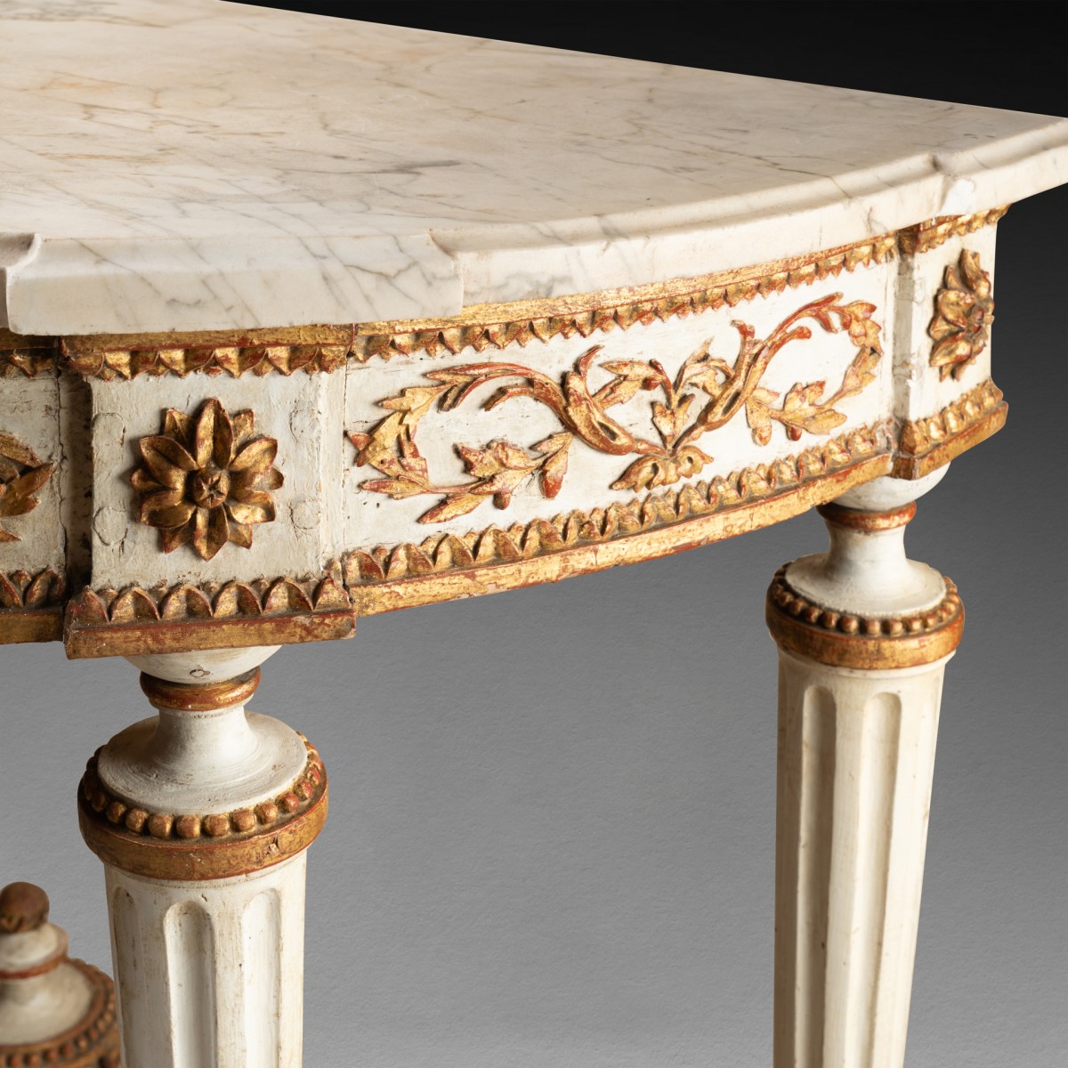 Half-moon console table in carved and cream-lacquered wood, with a carved belt in relief featuring large garlands of leaves and fruits in gilded wood ; resting on four legs with wide fluting , decorated at the bottom with a scroll of acanthus leaves ; joined by an openwork crossbar decorated with floral motifs , topped with a fire pot. White marble top.