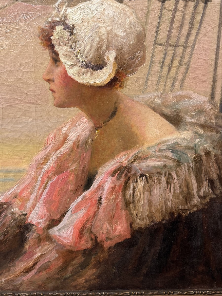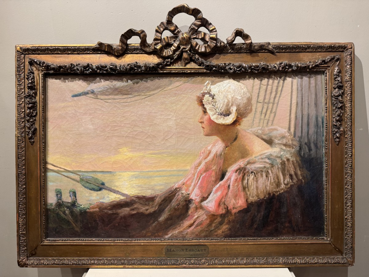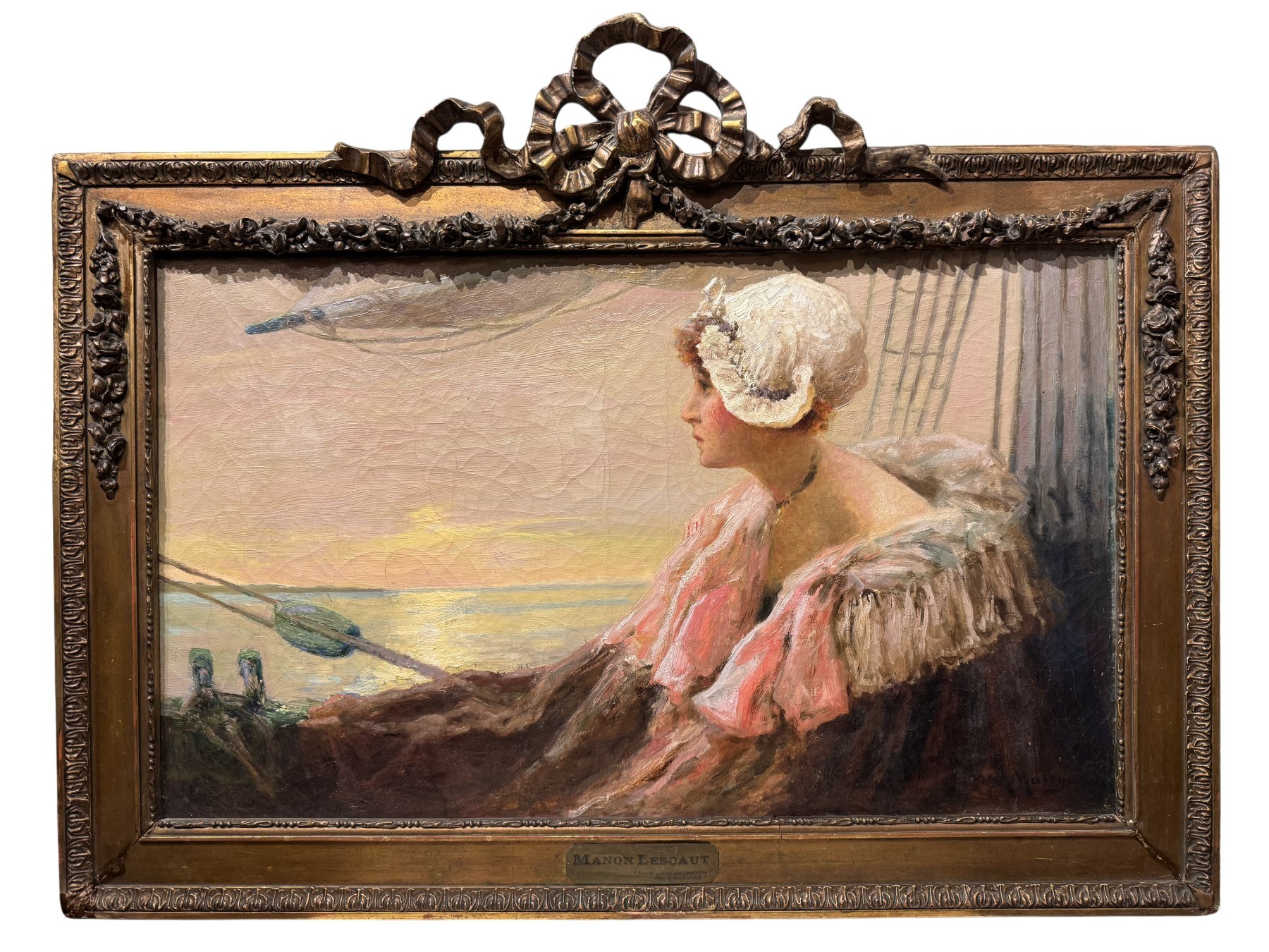 Oil on canvas depicting Manon Lescaut departing for exile, signed lower right A. MATIGNON, circa 1890. The central character of Abbé Prévost's novel "Histoire du Chevalier des Grieux et de Manon Lescaut" (1731), the heroine is shown here departing for exile aboard a Mississippi Company ship bound for New Orleans around 1724-1725. Albert Matignon (1869-1937), a student of Hébert and Albert Maignan, exhibited at the Salon des Artistes Français (gold medal in 1914). Museums: Bucharest, Le Mans, Nemours, Tarbes. Bénézit, Vol. VII, p. 259. Original Louis XVI ribbon frame (minor restoration needed in the upper right corner). 85 x 65 cm with frame.