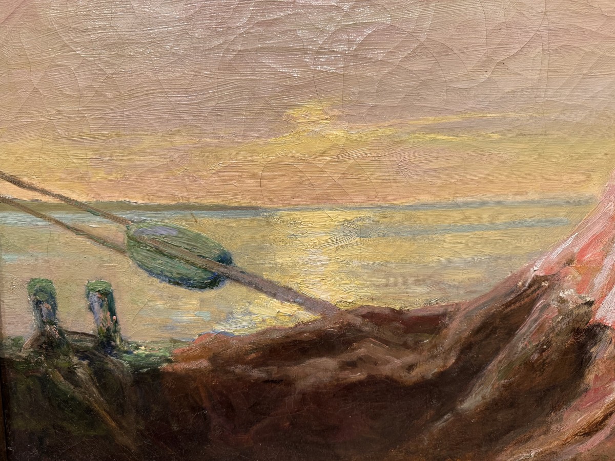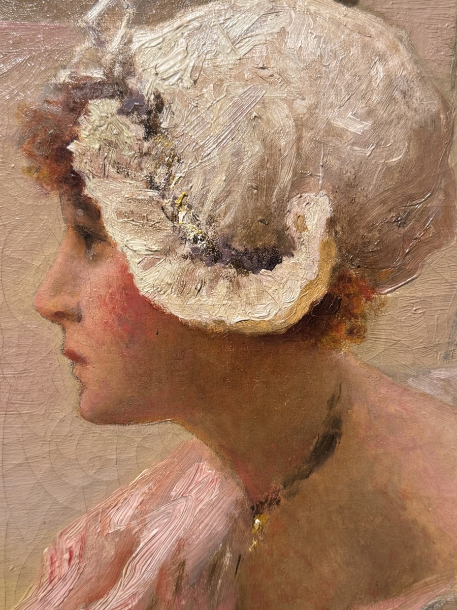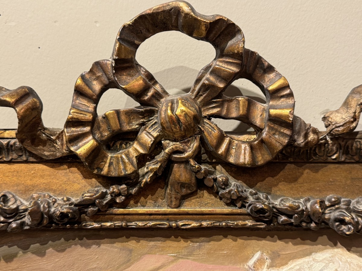 Oil on canvas depicting Manon Lescaut departing for exile, signed lower right A. MATIGNON, circa 1890. The central character of Abbé Prévost's novel "Histoire du Chevalier des Grieux et de Manon Lescaut" (1731), the heroine is shown here departing for exile aboard a Mississippi Company ship bound for New Orleans around 1724-1725. Albert Matignon (1869-1937), a student of Hébert and Albert Maignan, exhibited at the Salon des Artistes Français (gold medal in 1914). Museums: Bucharest, Le Mans, Nemours, Tarbes. Bénézit, Vol. VII, p. 259. Original Louis XVI ribbon frame (minor restoration needed in the upper right corner). 85 x 65 cm with frame.