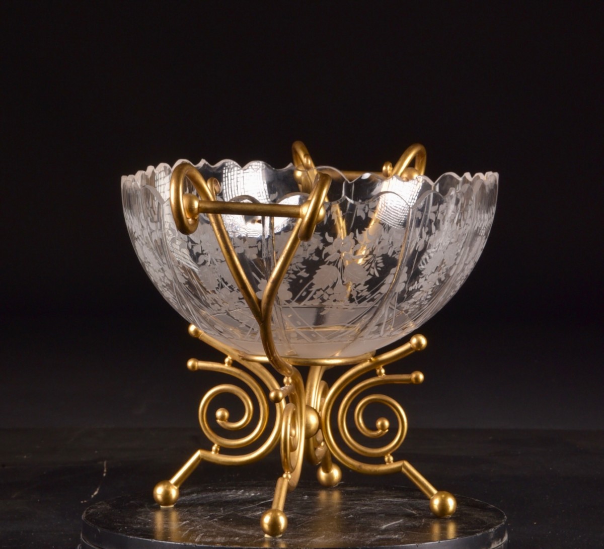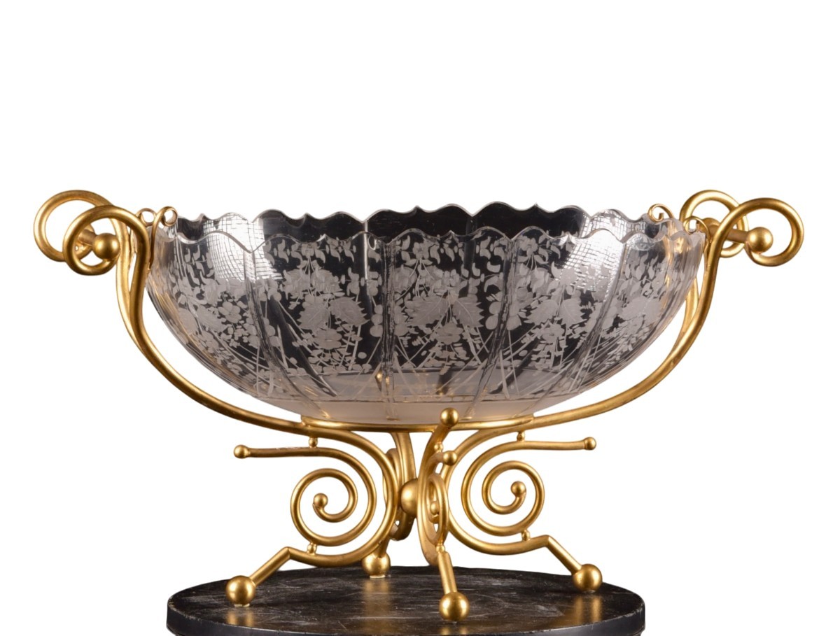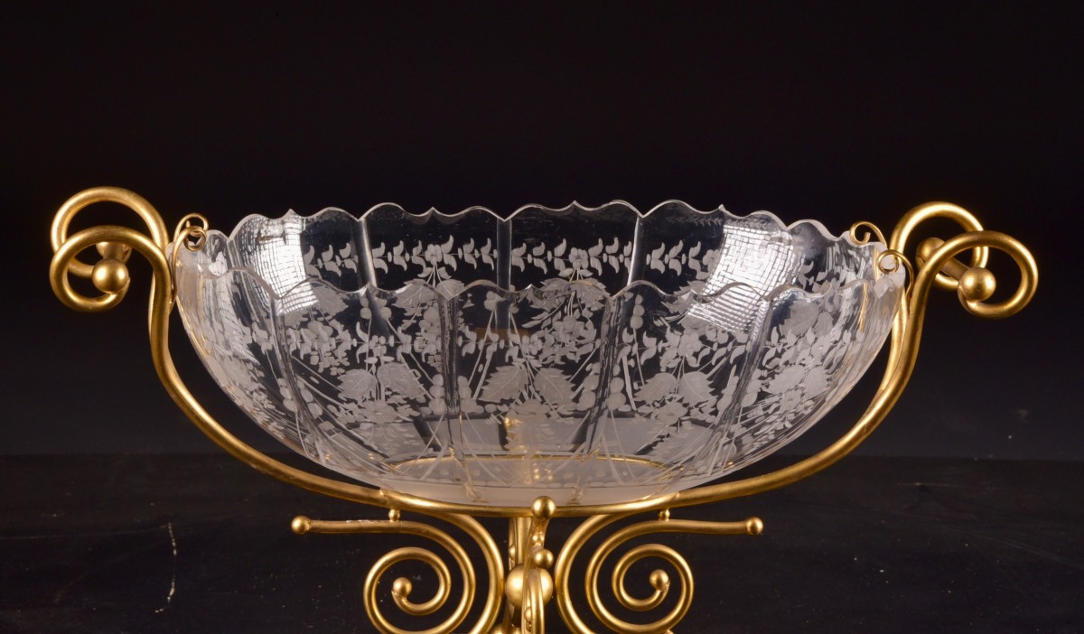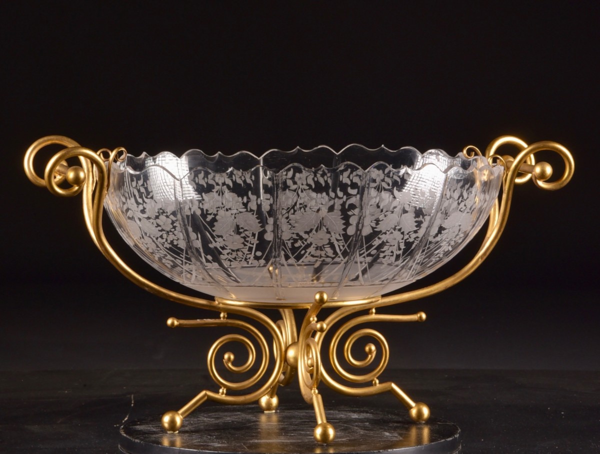 This clear Baccarat bowl is richly cut with floral motifs, featuring a faceted, petal-shaped rim and a base adorned with a cut star. It is elegantly mounted in gilt bronze with Art Nouveau scrollwork, forming graceful handles and a sculptural base. The whole rests on scrolled feet ending in balls, demonstrating the high quality of craftsmanship and decorative refinement characteristic of the period. Dimensions: 50 × 26 × 26 cm