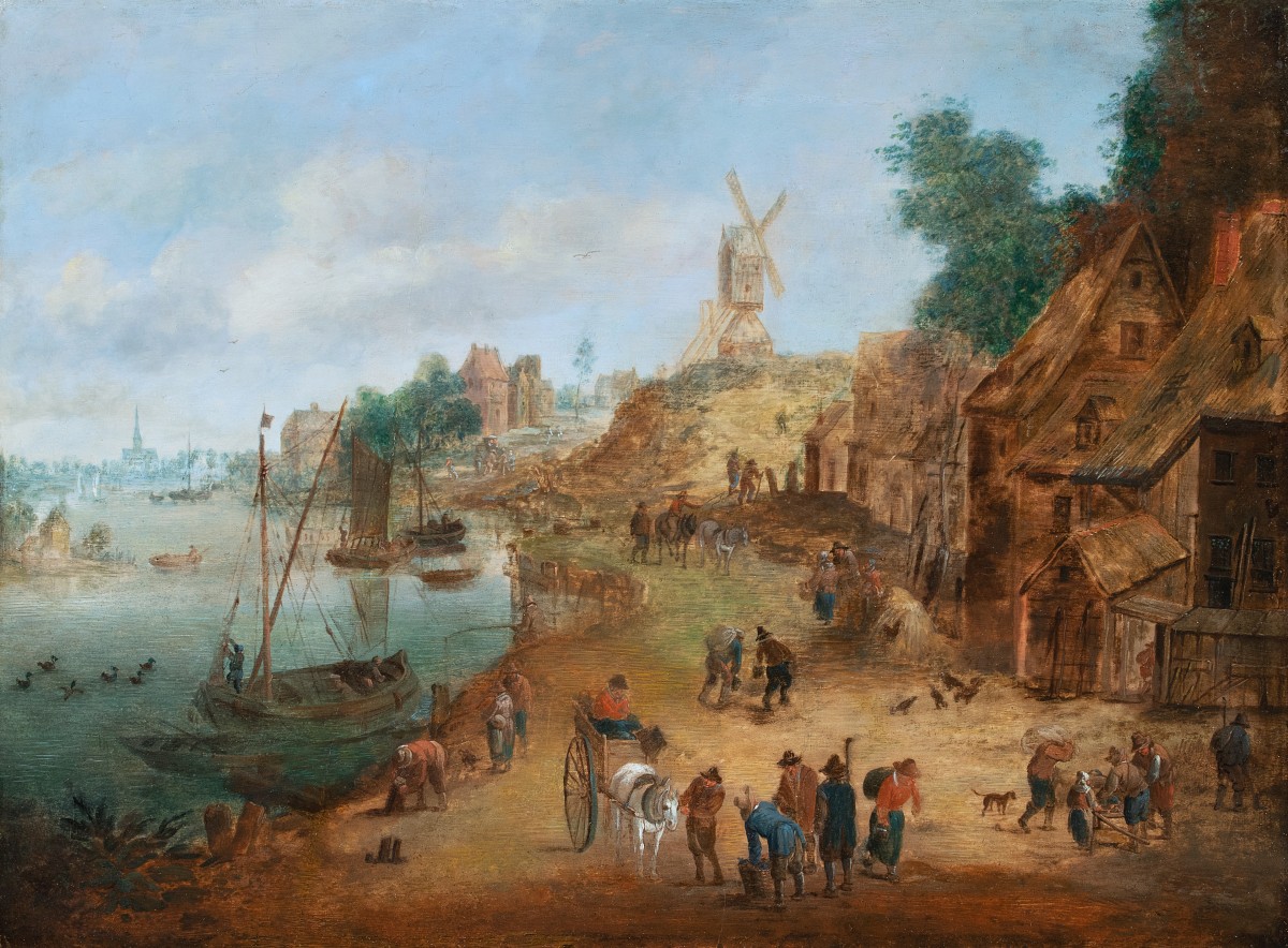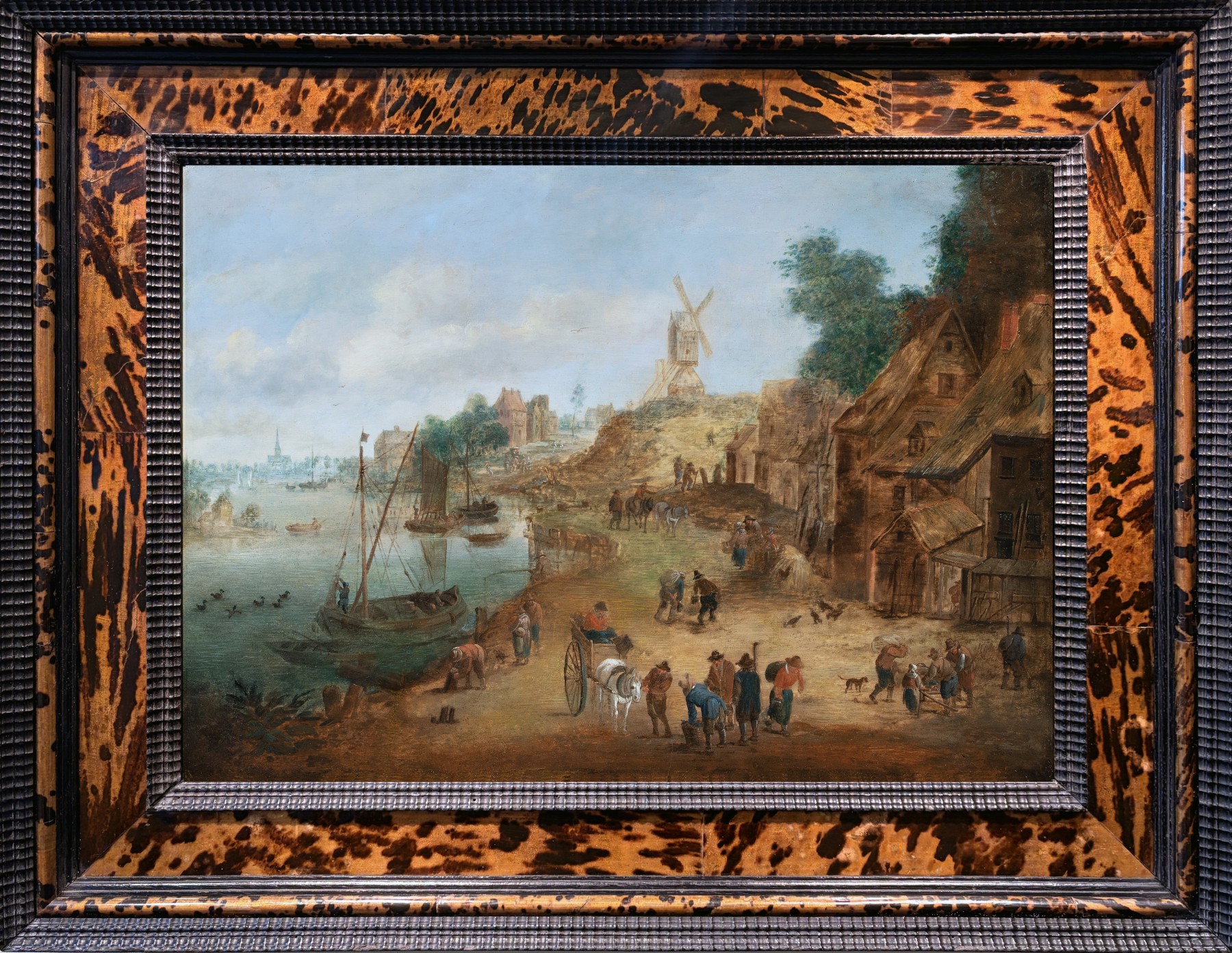 This painting offers a lively scene of Flemish rural life, characteristic of the work of Théobald Michau, an artist active from the late 17th to the mid?18th century. The landscape is structured around a village bordered by a river, where a small market is taking place. The artist unfolds a rich and bustling composition populated with figures, animals, and architectural elements, creating an atmosphere that is both picturesque and harmonious.