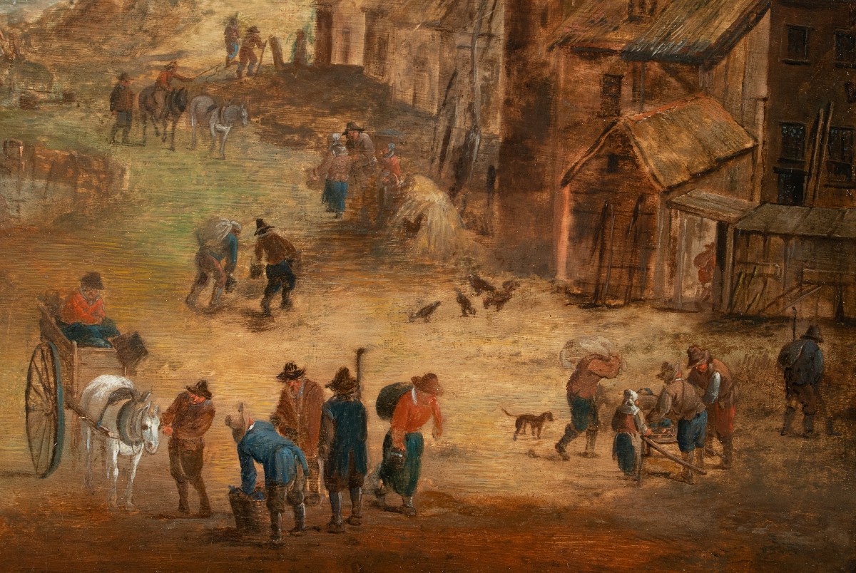 **Foreground:** Villagers go about their daily activities—conversing, transporting goods, tending to animals. A white horse harnessed to a cart, along with chickens and dogs, animates the scene.