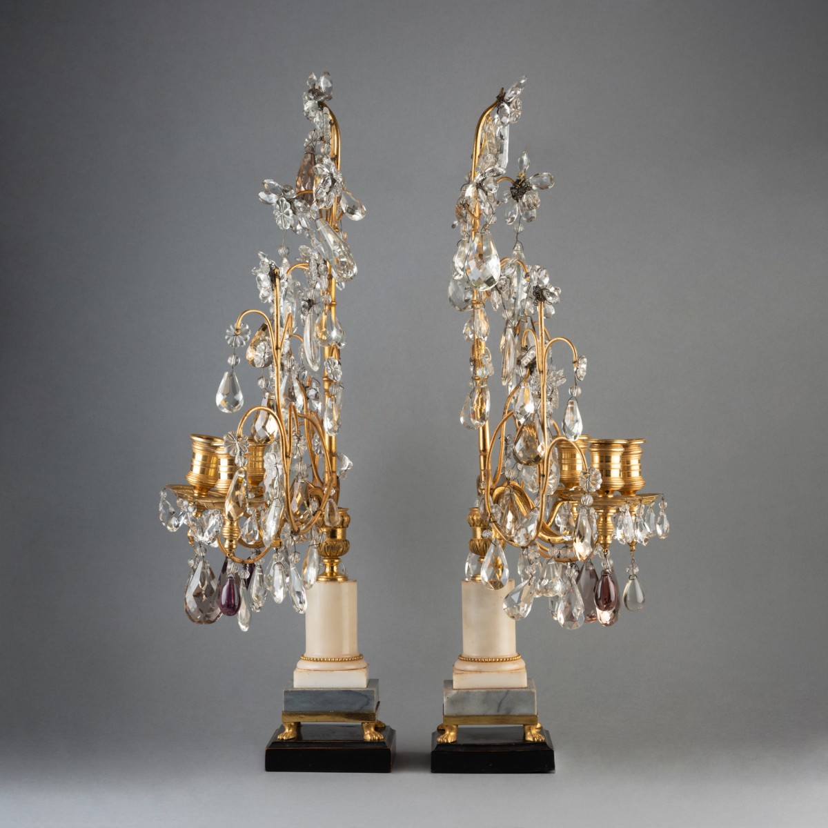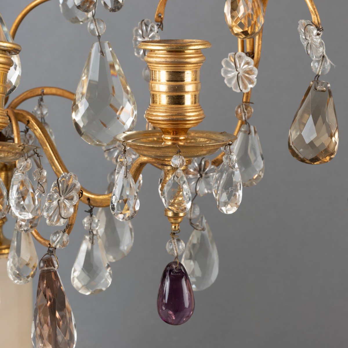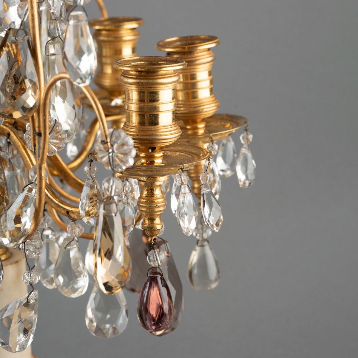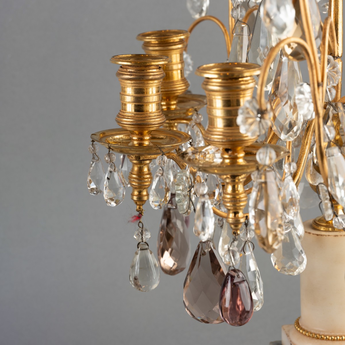 Pair of three-light candelabra in gilded bronze with crystal pendants, some amethyst-colored; they rest on a truncated white marble column with a turquoise blue marble counter-base, both resting on gilded bronze claw feet.