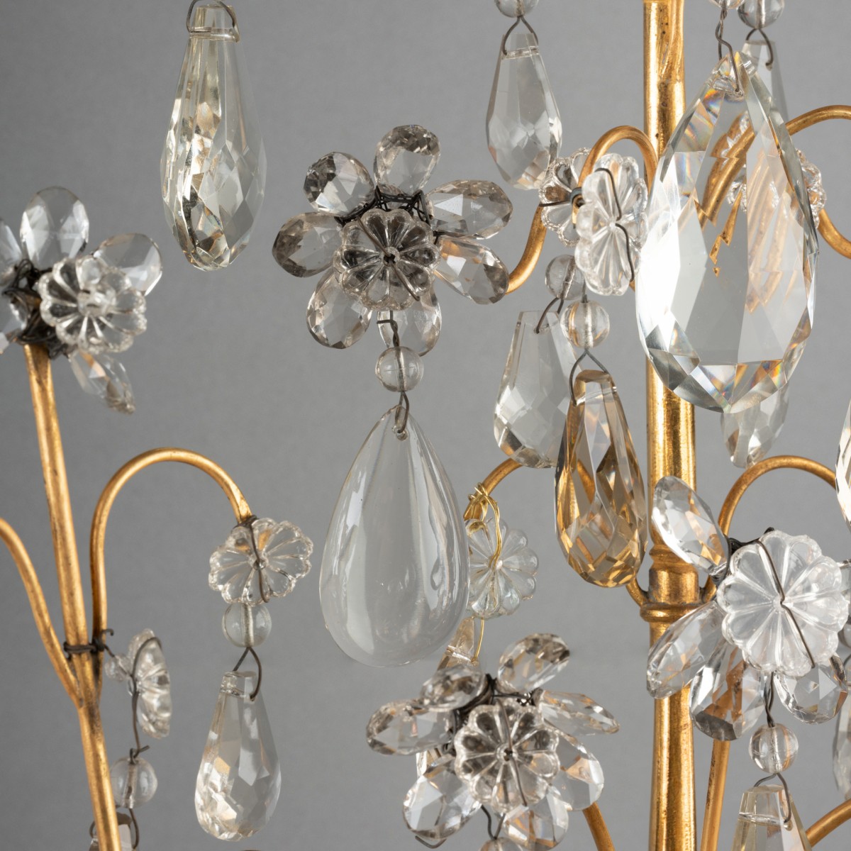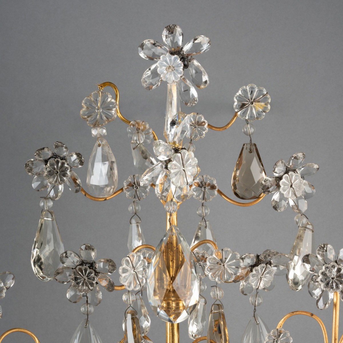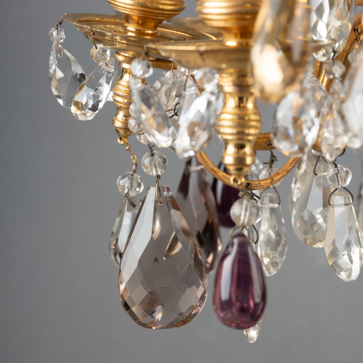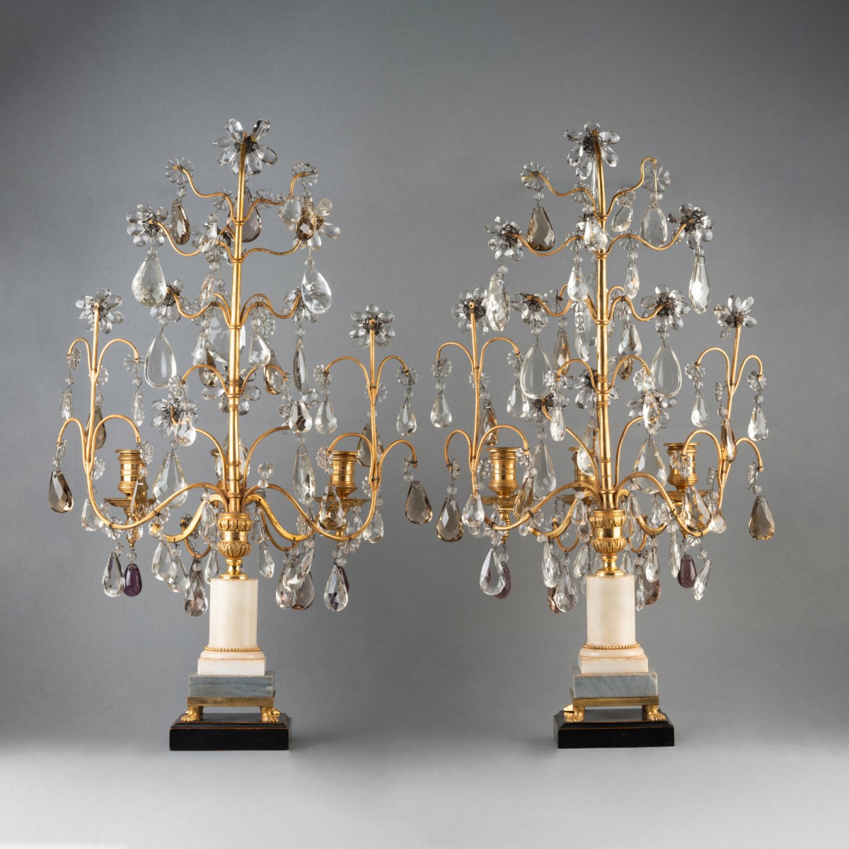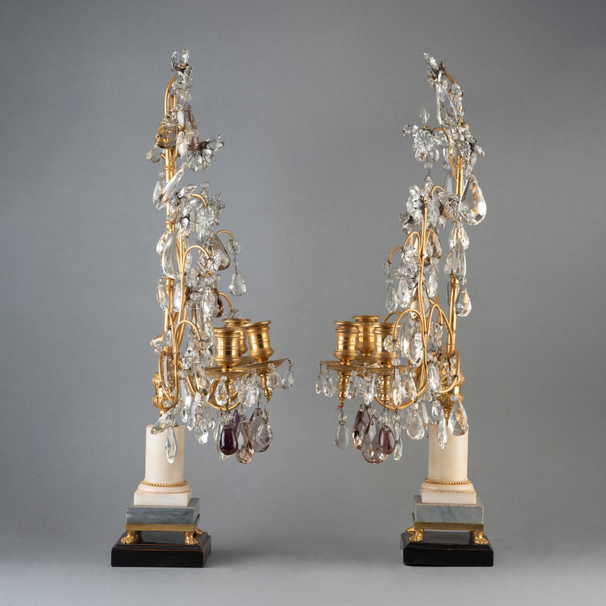 Pair of three-light candelabra in gilded bronze with crystal pendants, some amethyst-colored; they rest on a truncated white marble column with a turquoise blue marble counter-base, both resting on gilded bronze claw feet.