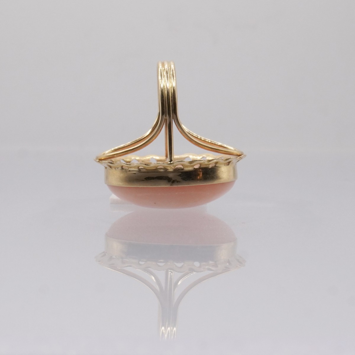 Yellow gold ring, showcasing a generously proportioned oval coral measuring 30 × 25 mm, with a warm and natural hue.