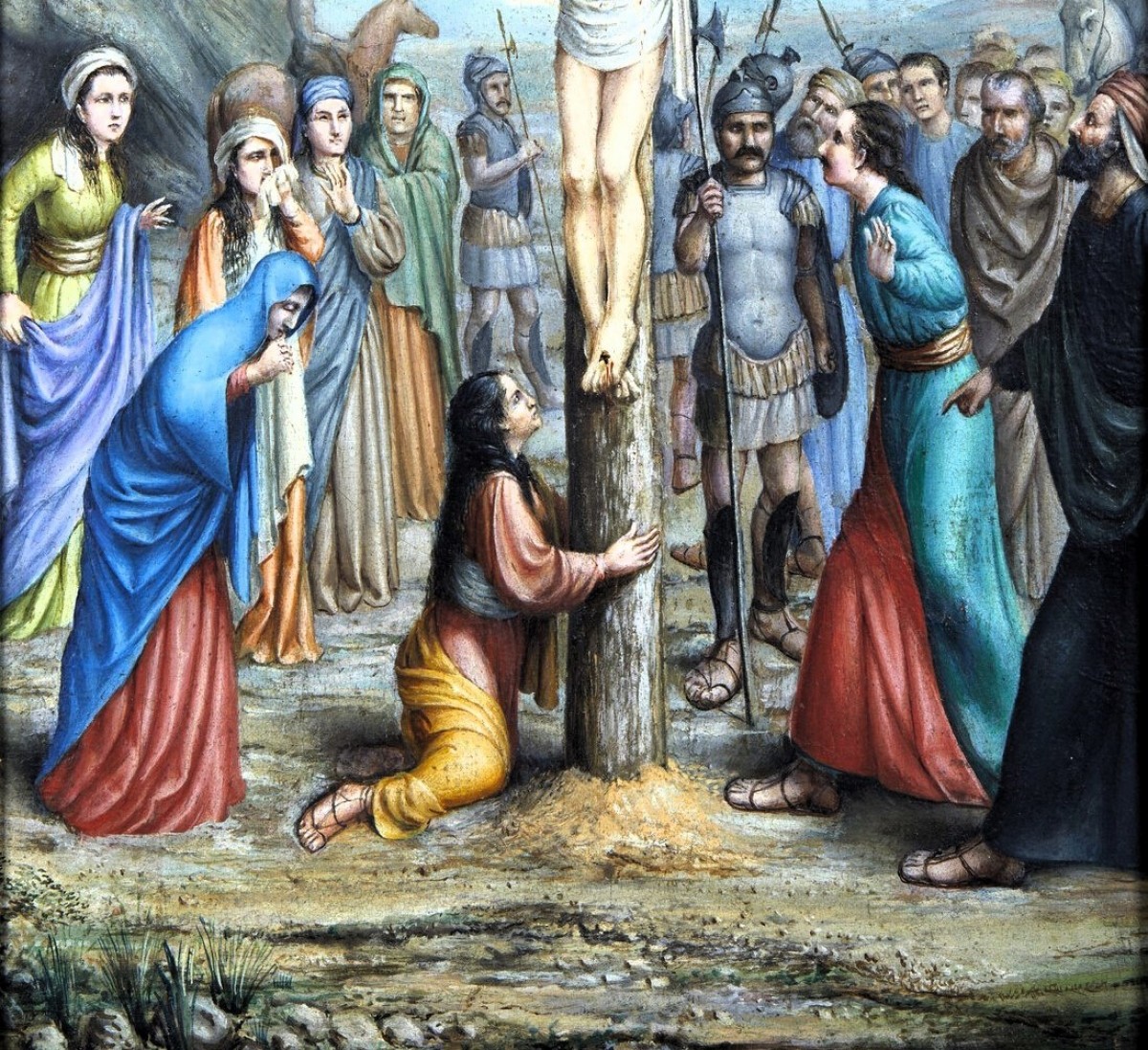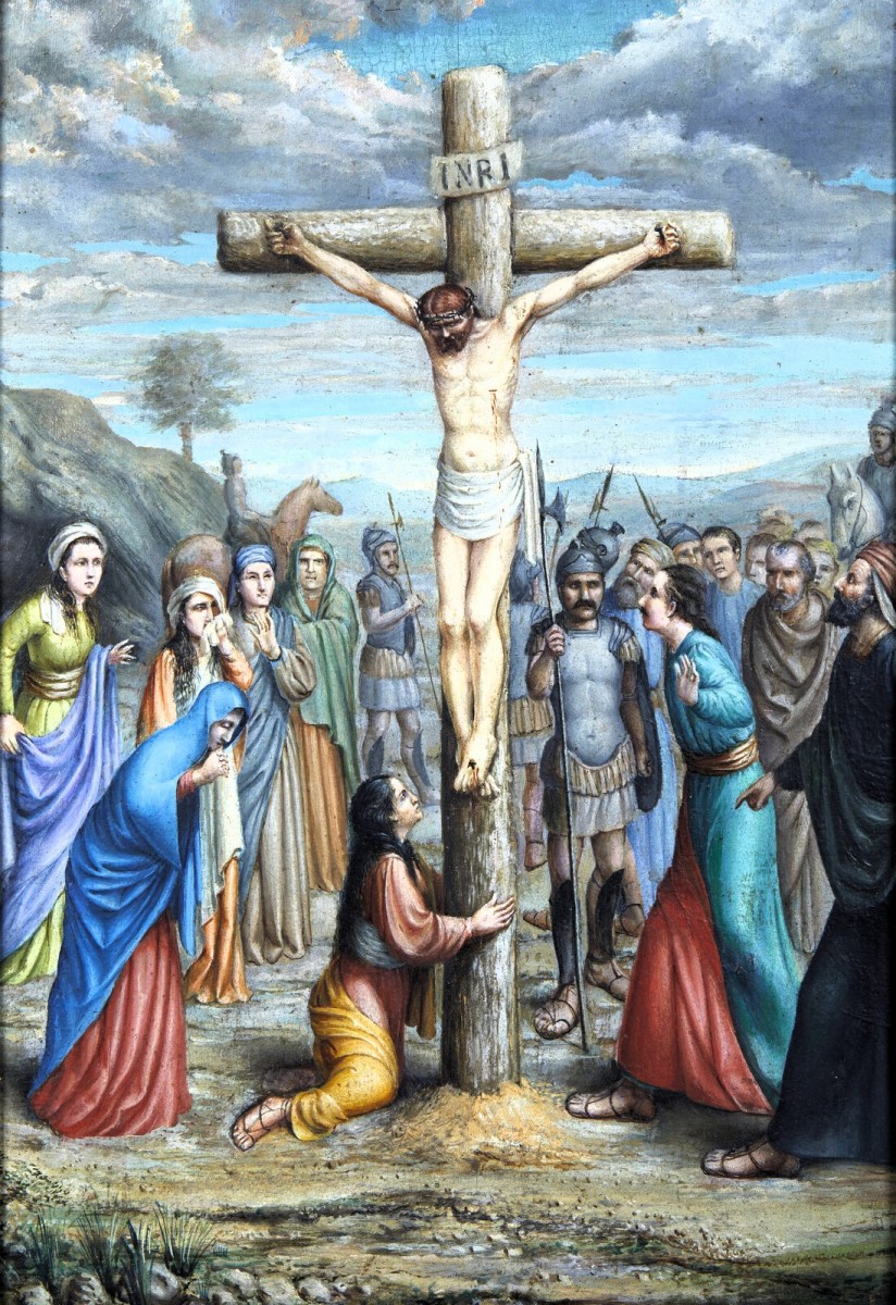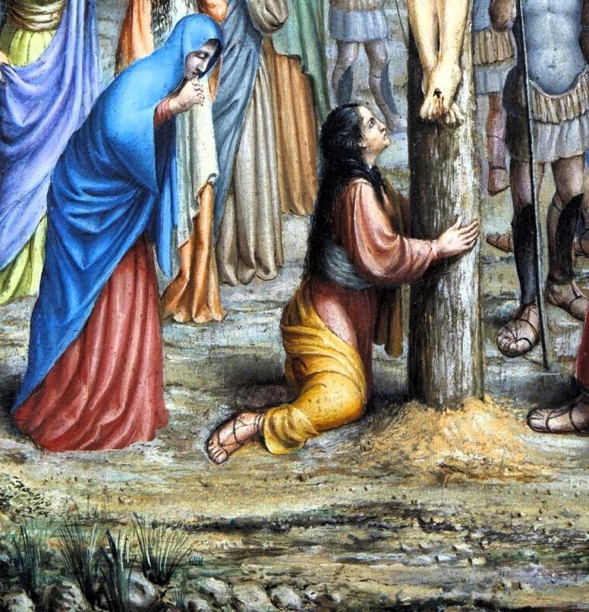 The scene, as per tradition, shows Mary Magdalene kneeling at the foot of the cross, sharing her grief with the Virgin Mary and Saint John. Behind the Virgin, on the left, are the pious women, Mary of Clopas, the Virgin's sister, and Mary Salome, the mother of James and John. On the right, Roman soldiers in their armor observe the scene. The pictorial finesse in the details of the figures, the vegetation on the ground, and the blue sky dotted with clouds is remarkable.