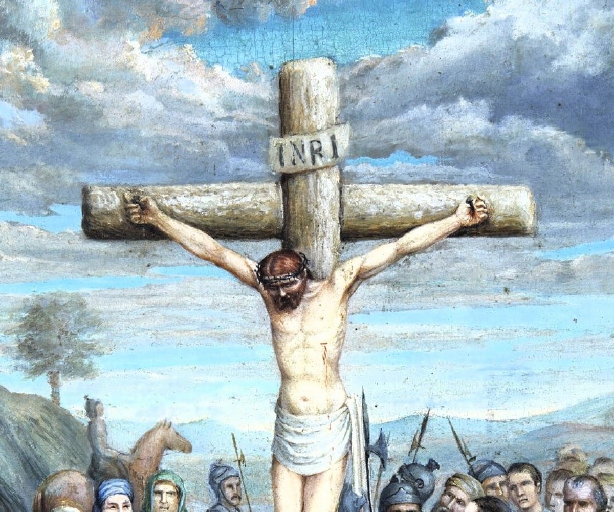 A splendid oil painting on panel depicting the Crucifixion of Christ.