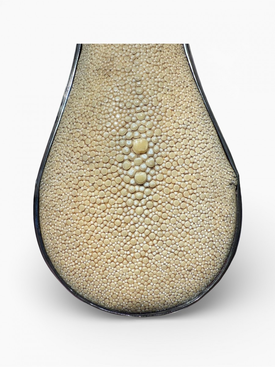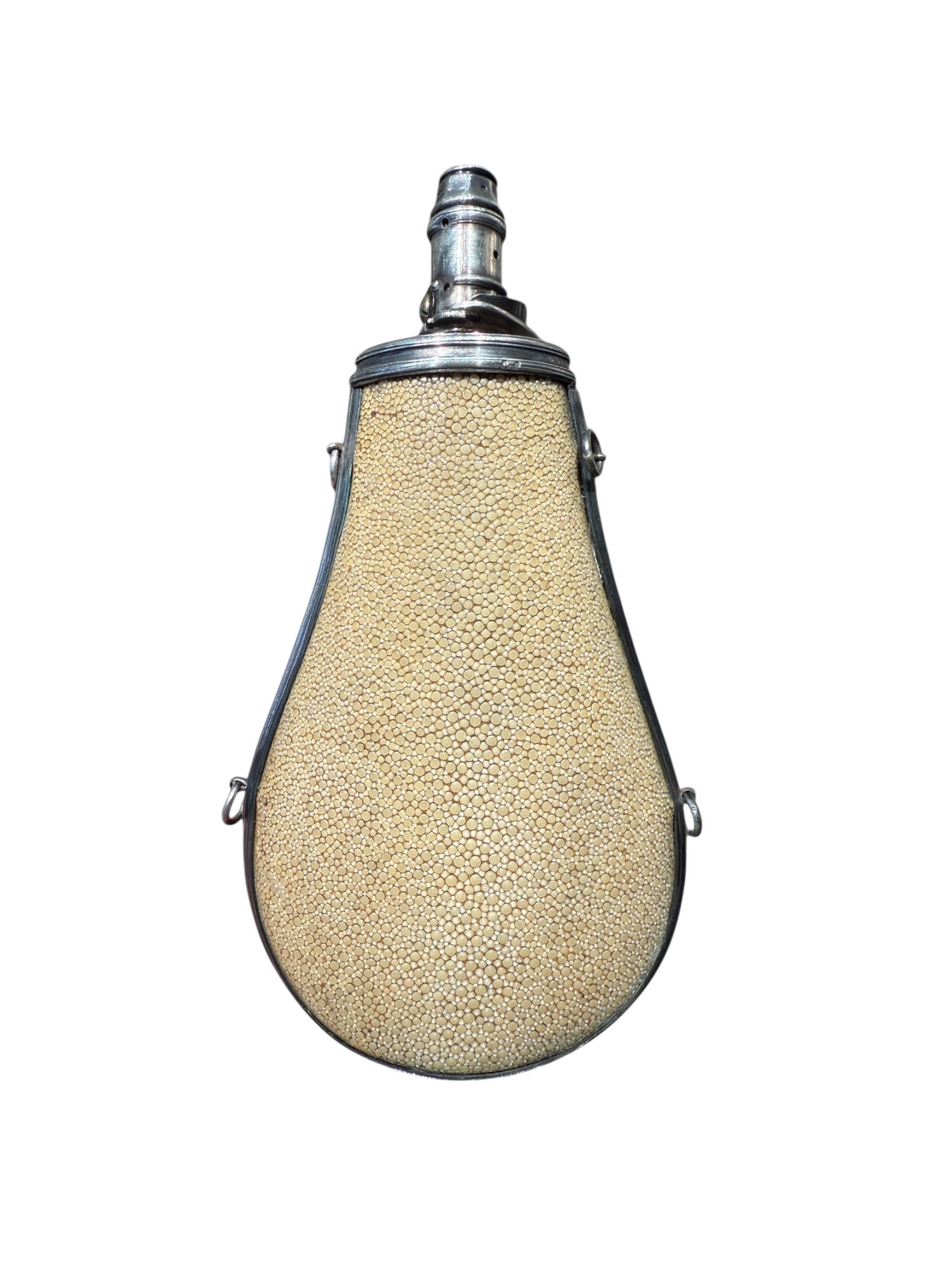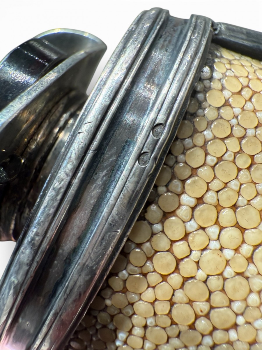 An elegant 19th-century powder box with a silver mount and a body covered in shagreen (ray skin). The cylindrical spout is fitted with a small hinged lever. The shagreen has a fine, even grain and is framed by a silver border with three attachment rings. A beautiful, refined, and well-preserved period piece.