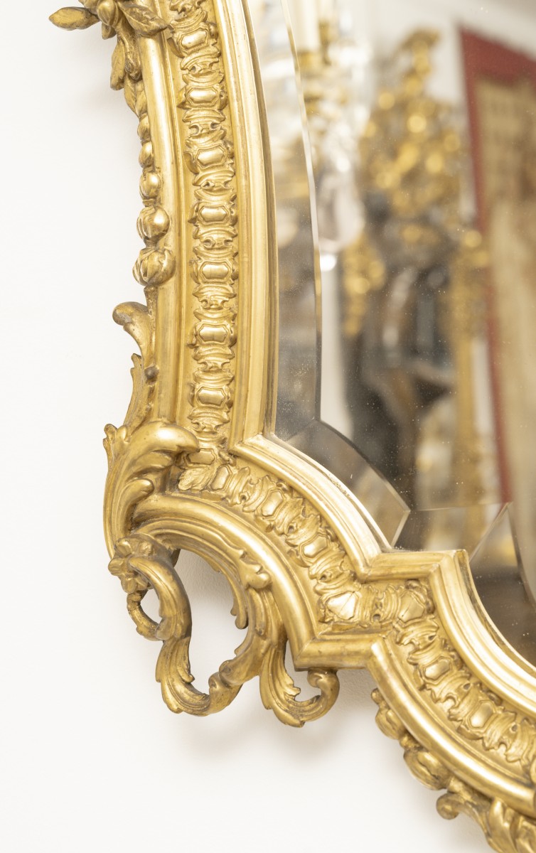The original gilding, warm and deep in tone, enhances the sharply defined relief and reflects the craftsmanship of Parisian workshops of the third quarter of the 19th century. The mirror retains its original bevelled glass, which adds elegance and attests to the high quality of the piece.