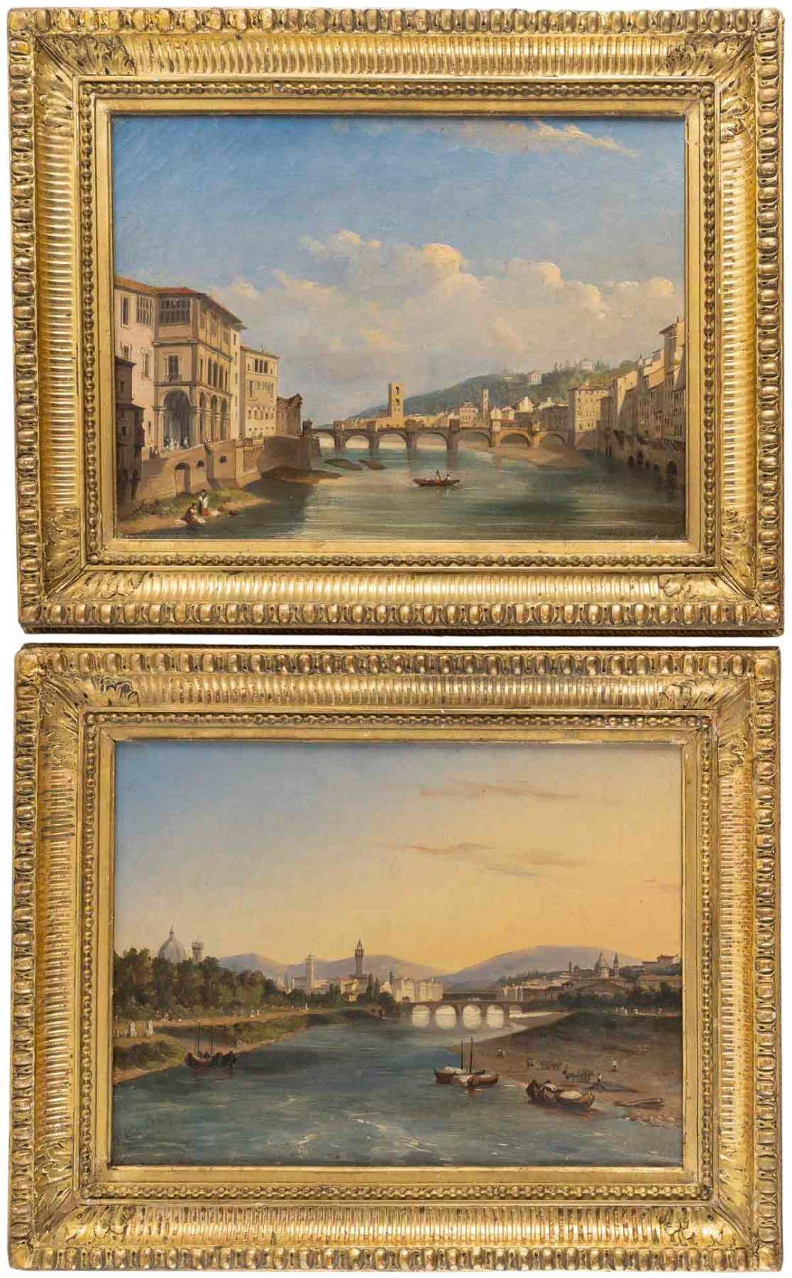 We present here a pair of canvases in which the artist skillfully captured everyday scenes along the banks of the Arno River. Rich in architectural detail, these compositions faithfully evoke the luminous atmosphere so characteristic of Florence. Hugot immortalized the city’s emblematic bridges and the lively activity on its riverbanks, blending precision with poetic sensitivity.