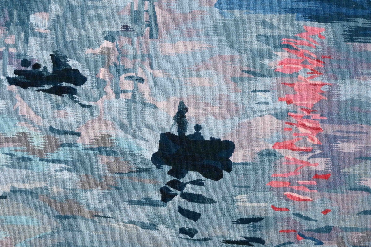 This remarkable Aubusson tapestry, signed by the Robert Four workshop, is a masterful textile interpretation of Claude Monet's famous "Impression, Sunrise," a seminal work of the Impressionist movement.
