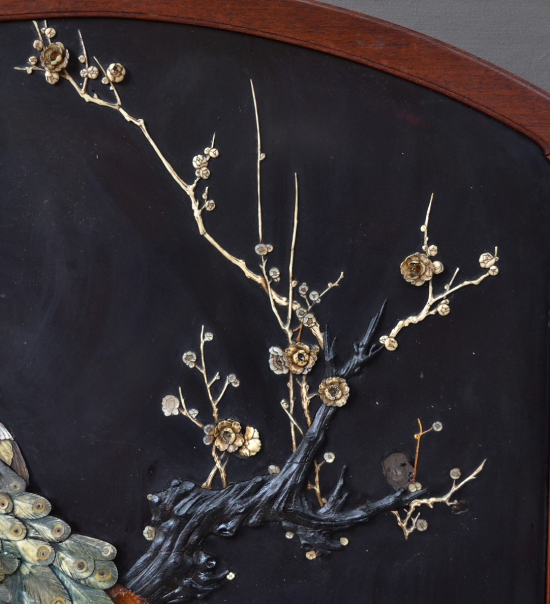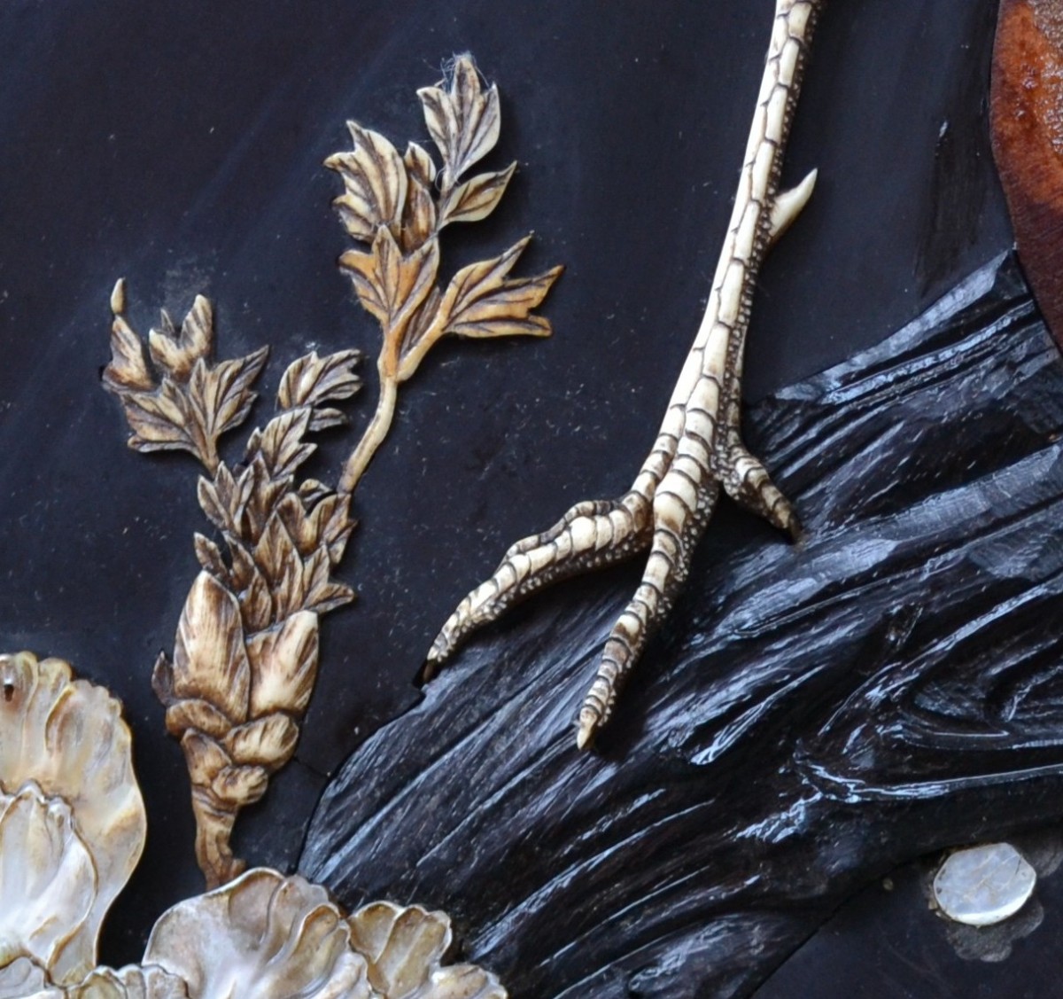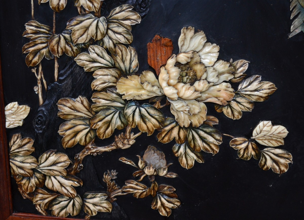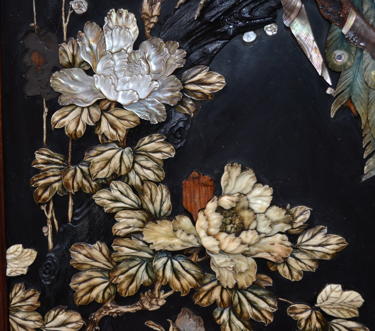 It is an exceptional work of absolute perfection; everything is of high quality: the materials, the precise and masterfully sculpted details. The bird's talons and head, the peony petals, and the tree trunk are all particularly revealing. There is no flaw. It is the work of a great master. There are two seals that might allow us to identify the artist, certainly one of the best of his time. It is likely that this screen was commissioned by Japan and not made for export.