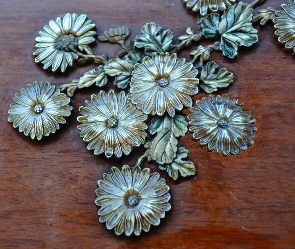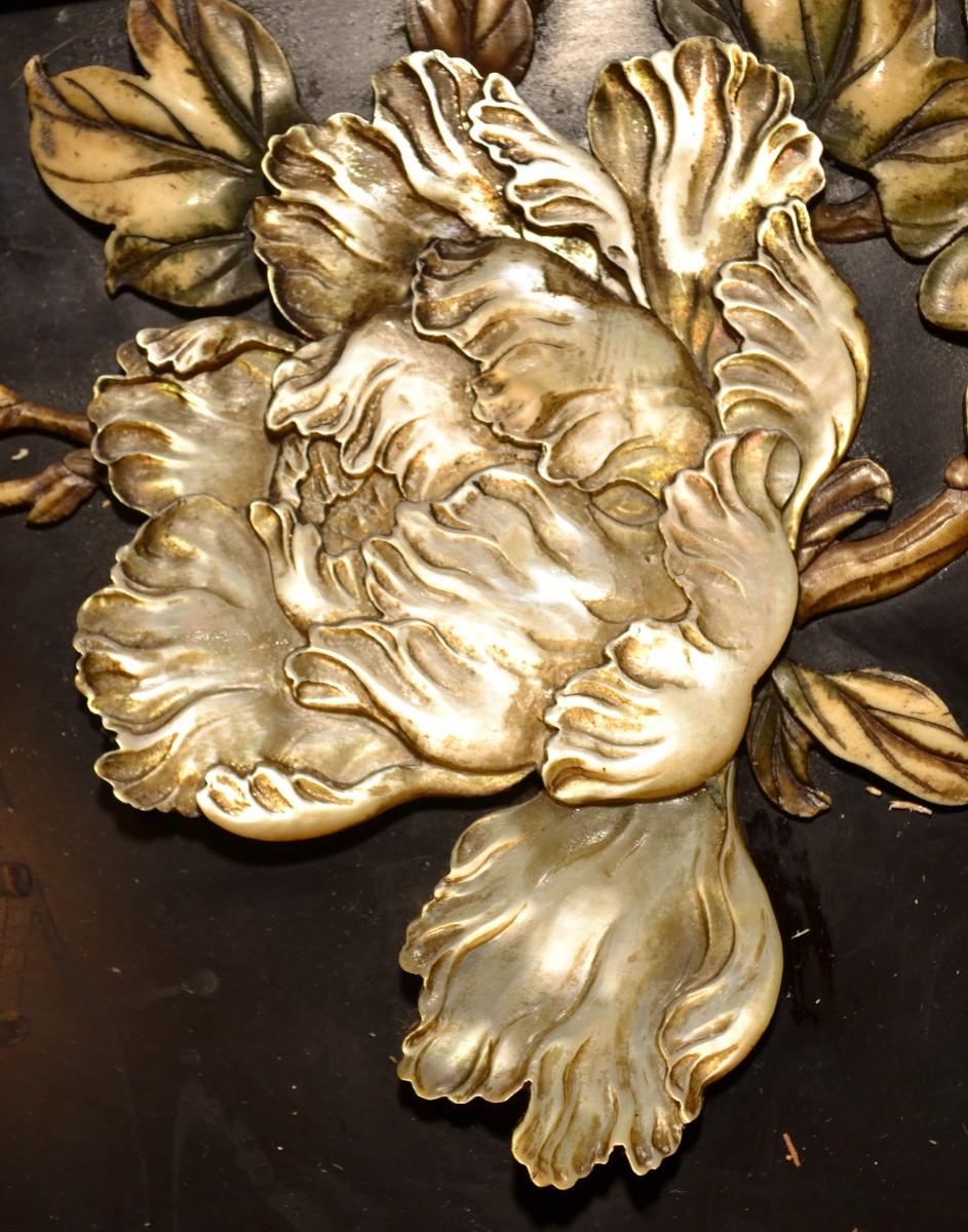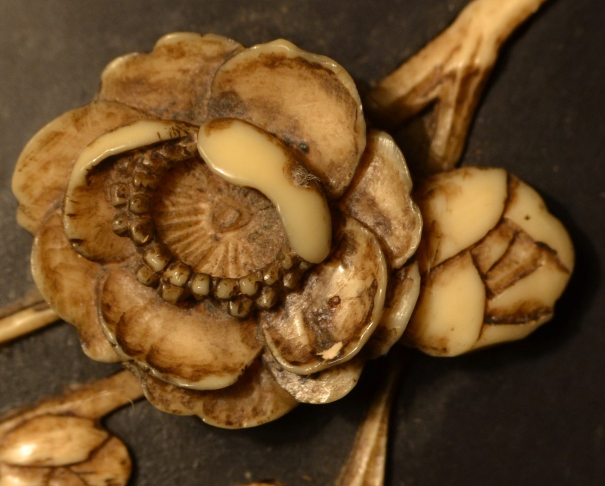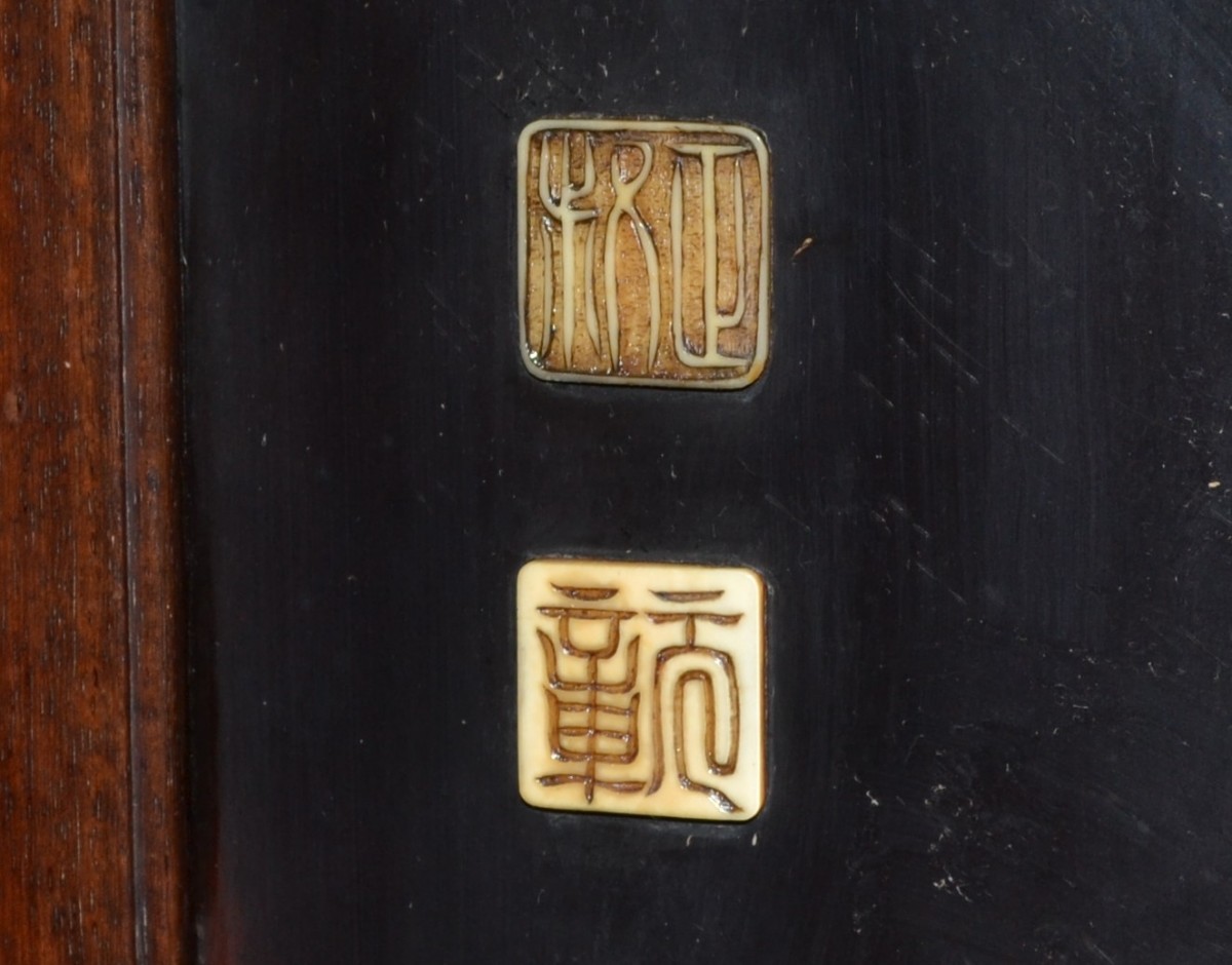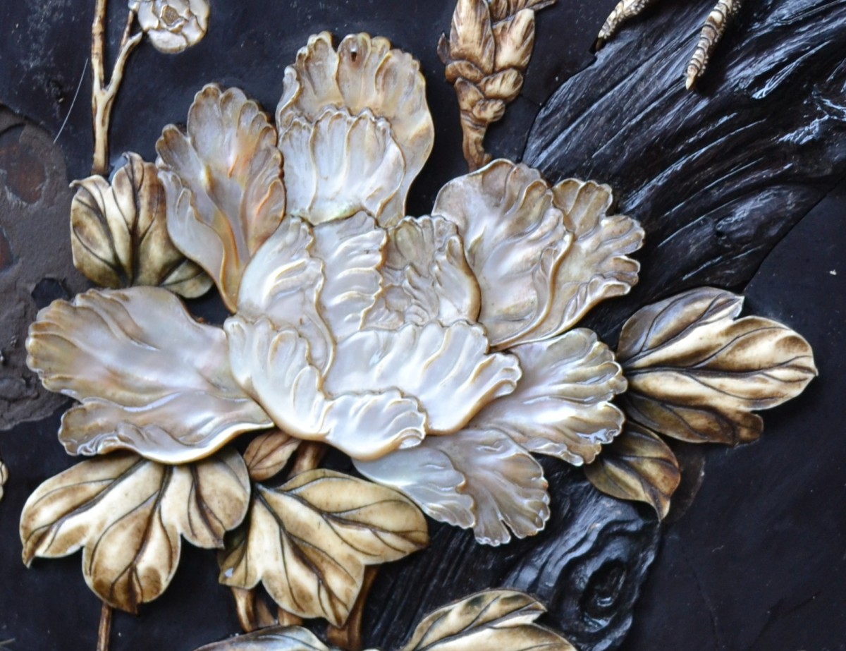 It is an exceptional work of absolute perfection; everything is of high quality: the materials, the precise and masterfully sculpted details. The bird's talons and head, the peony petals, and the tree trunk are all particularly revealing. There is no flaw. It is the work of a great master. There are two seals that might allow us to identify the artist, certainly one of the best of his time. It is likely that this screen was commissioned by Japan and not made for export.