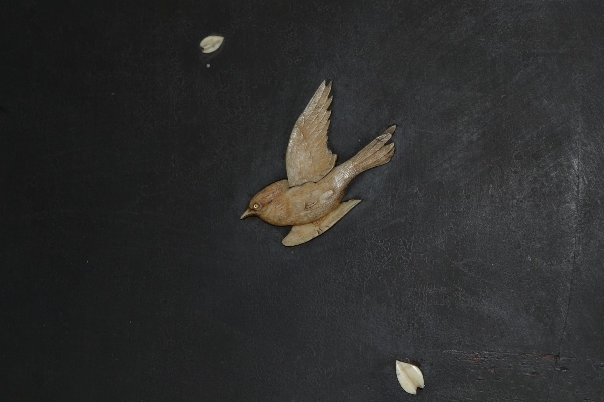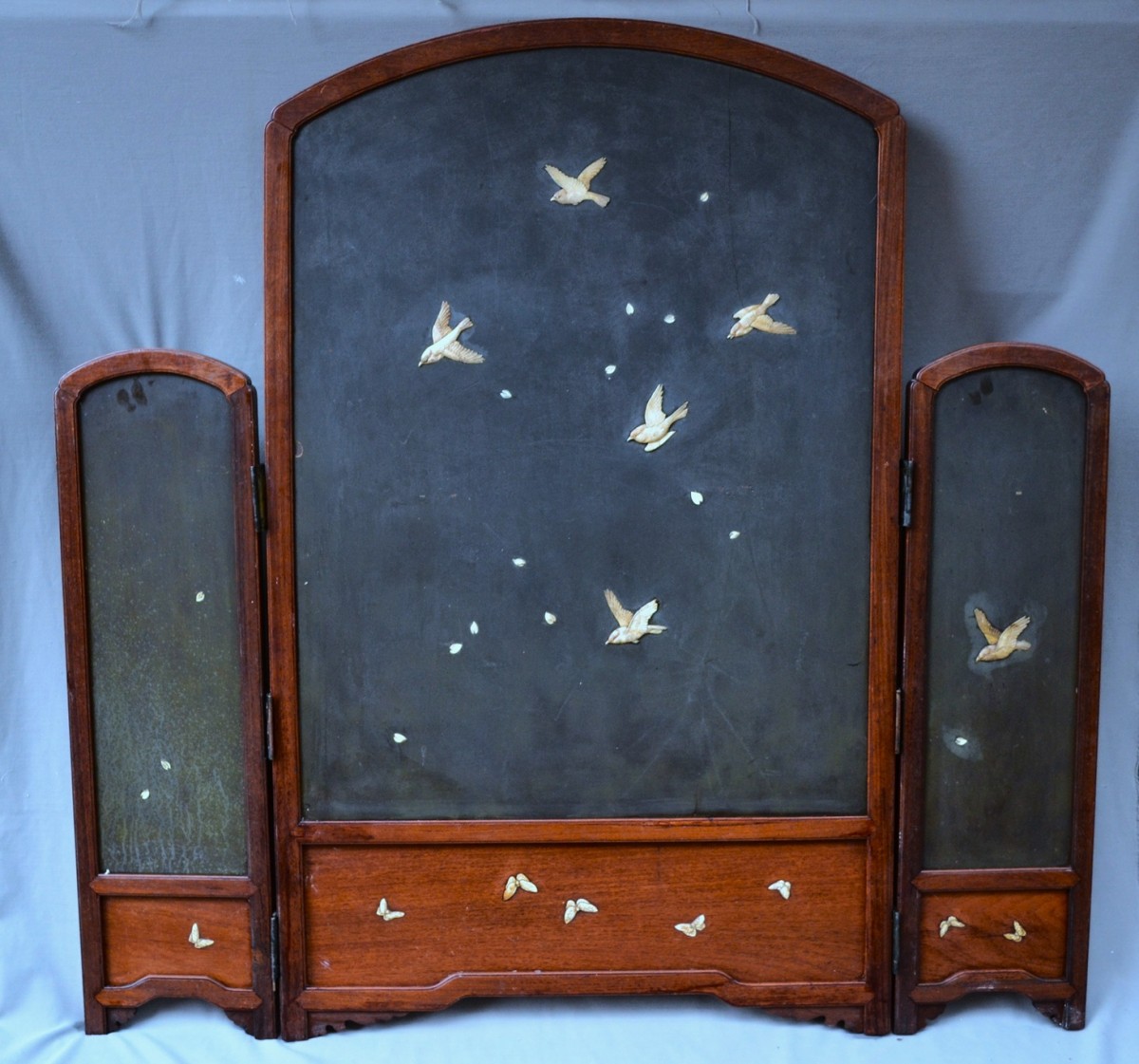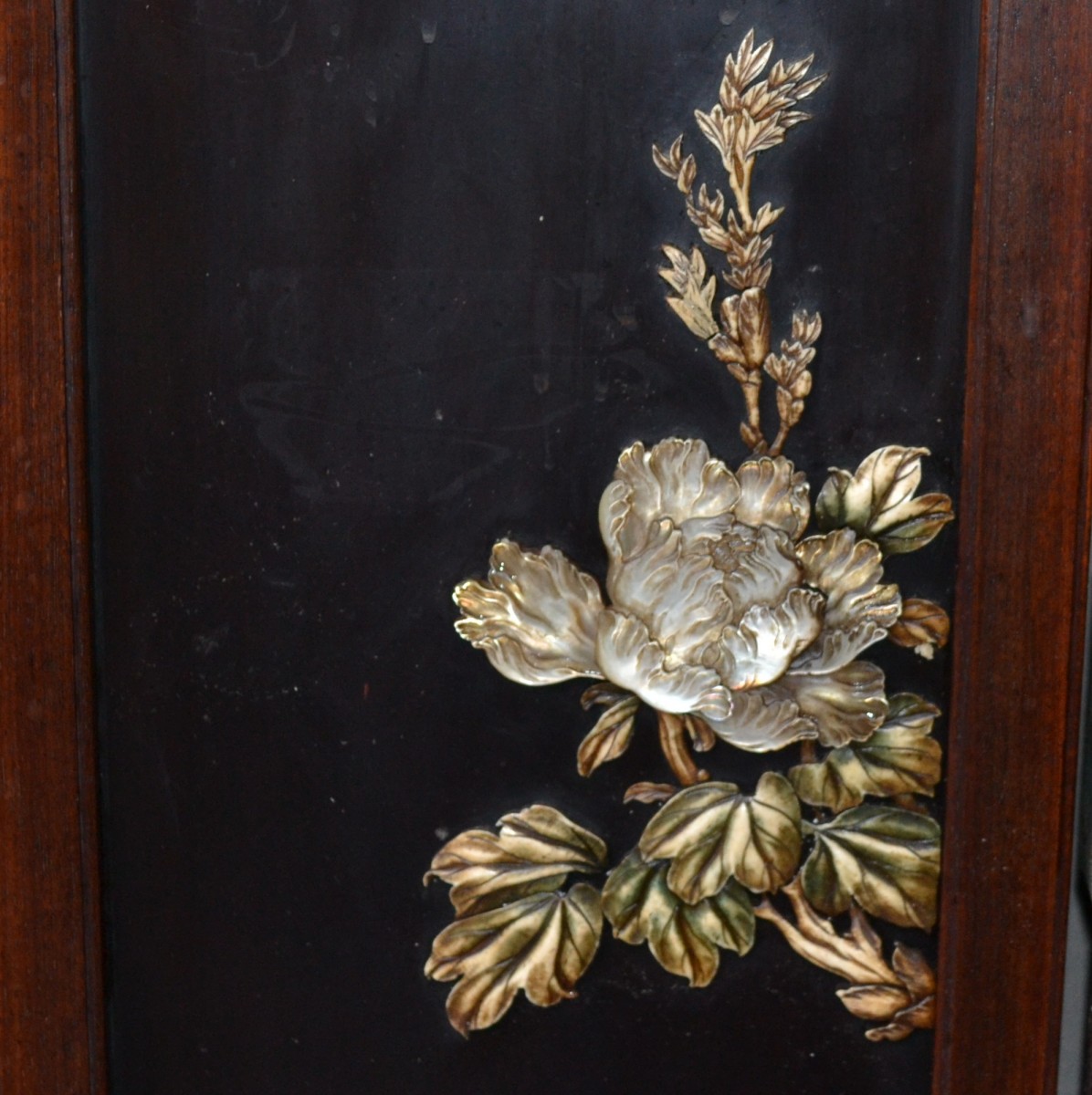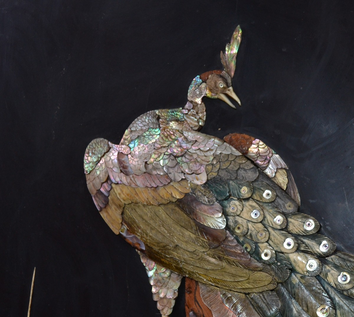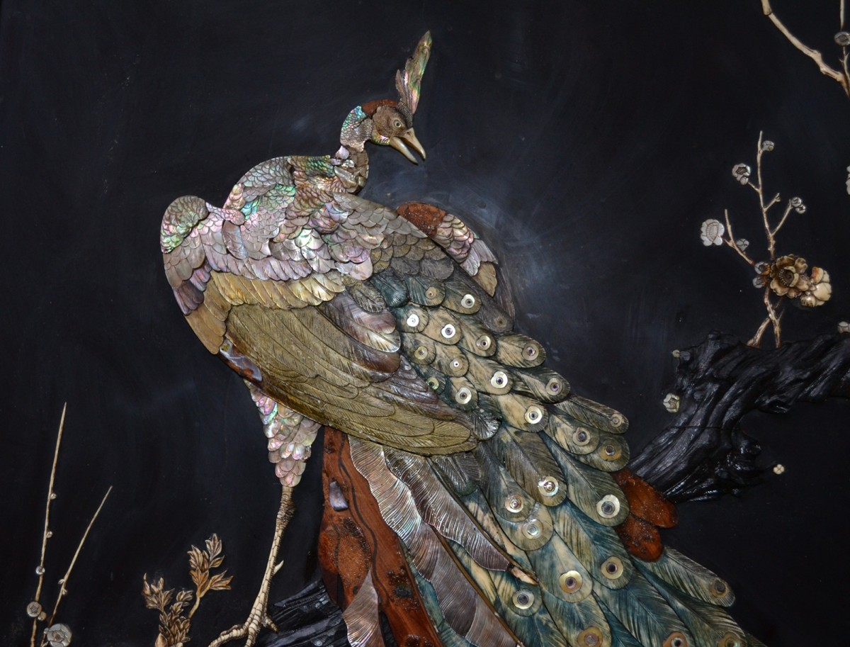 A three-panel wooden screen covered in the finest quality black Urushi lacquer (roiro), deep, thick, and durable. The inlays are in the style of the Shibayama family. The design depicts a peacock perched on a centuries-old plum tree still in bloom. The tree emerges from a bed of everlasting peonies. The inlays are made of mother-of-pearl, bone, and precious woods. The frame is rosewood. This triptych form, with a large central panel flanked by two smaller panels, is exceptional in Japanese art and possesses absolute elegance. It demonstrates a European influence. It is a central screen; the reverse is decorated very simply against a matte slate-gray Urushi lacquer background, with a flock of birds in flight among flower petals carried by the wind.
