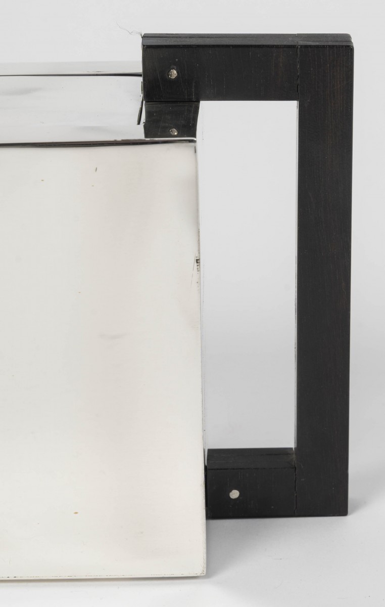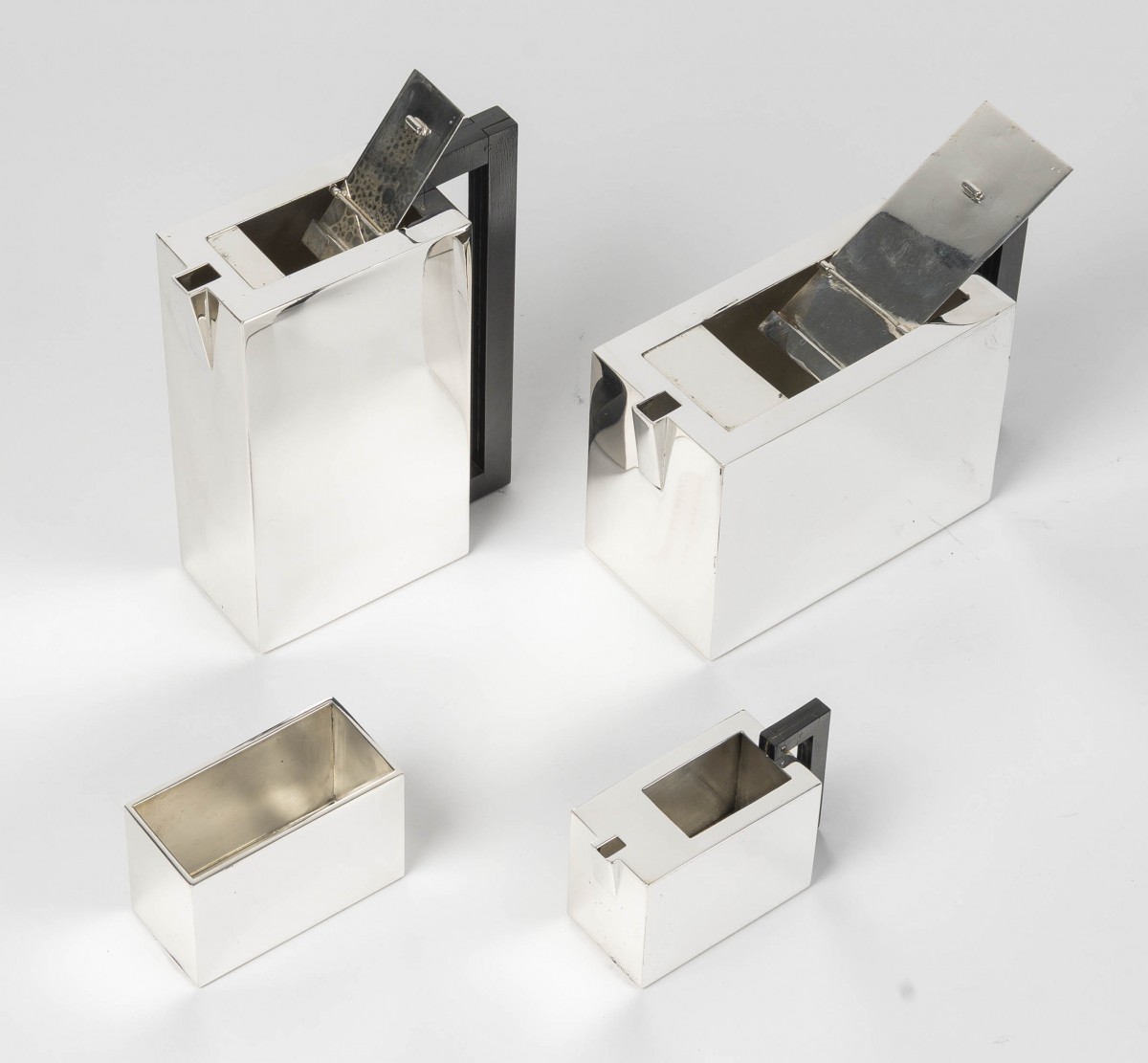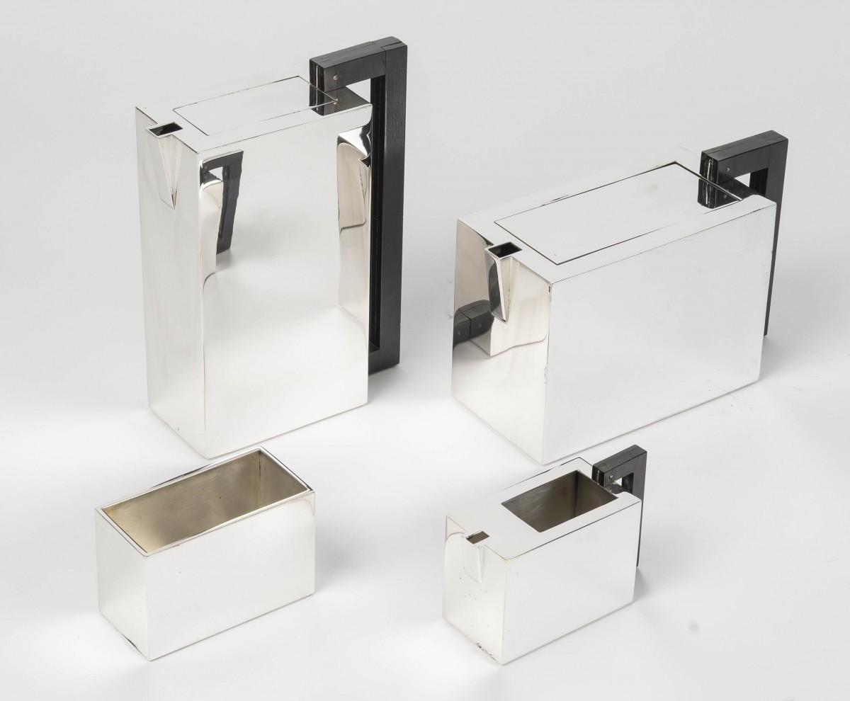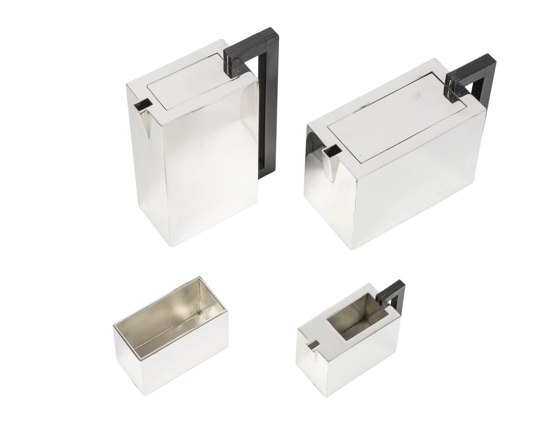 A superb tea and coffee service of modernist design, crafted in 925 sterling silver. The four pieces exhibit a rigorous geometric aesthetic, inherited from the Art Deco vocabulary: clean rectangular volumes, flat surfaces with sharp edges, angular spouts, and elegant vertical handles in dark wood creating a refined contrast.