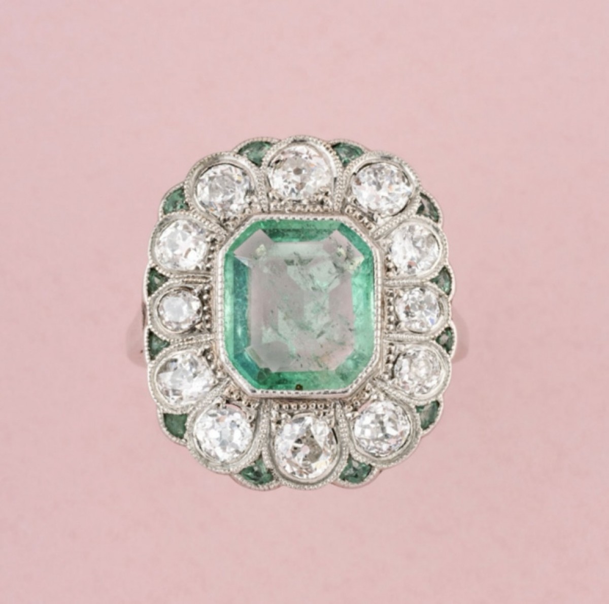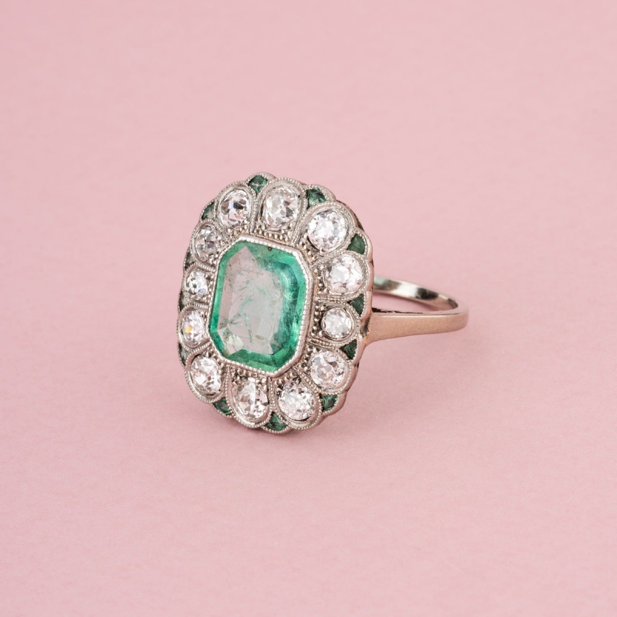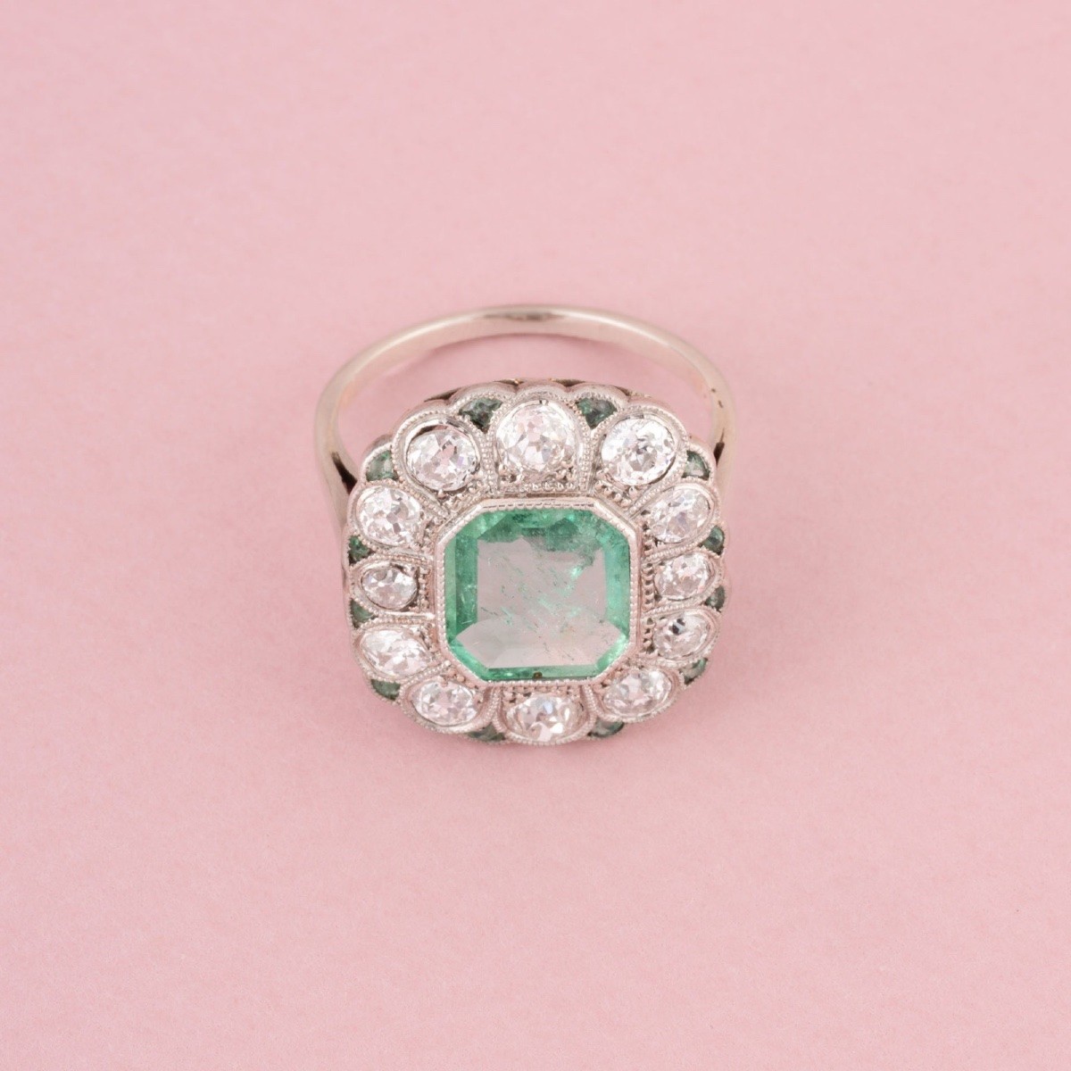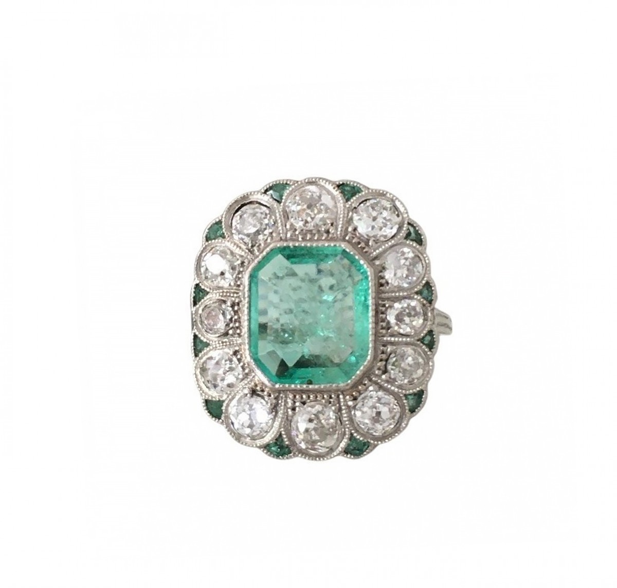 Antique Art Deco ring in 18K (750‰) white gold and platinum, set with an octagonal Colombian emerald of approximately 1.87 ct surrounded by 12 old-cut diamonds totaling approximately 1.54 ct in a scalloped setting, and 12 small emeralds.