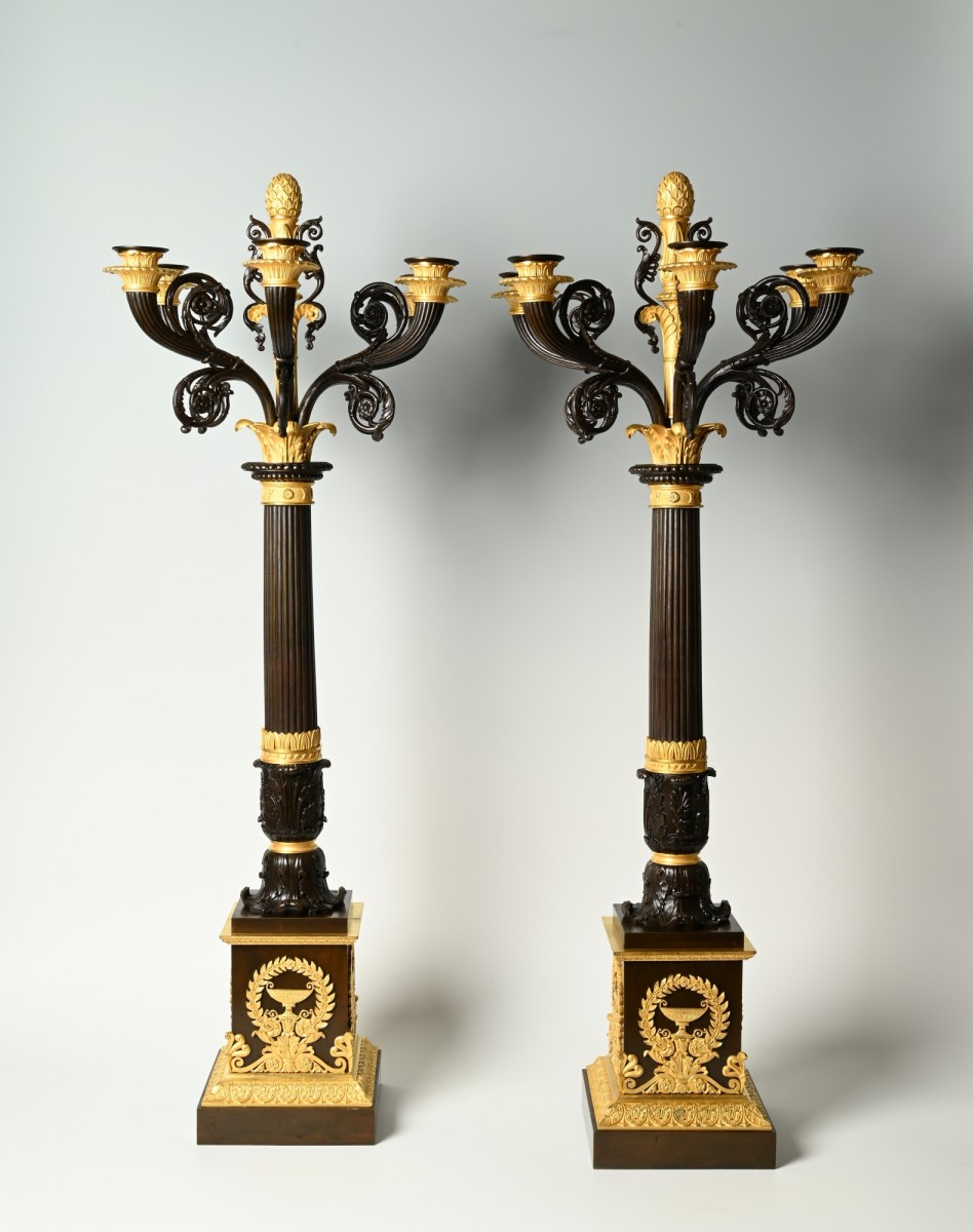 A fine and large pair of French Empire column-form candelabra with patinated and gilt bronze decoration to the column and square plinth base.