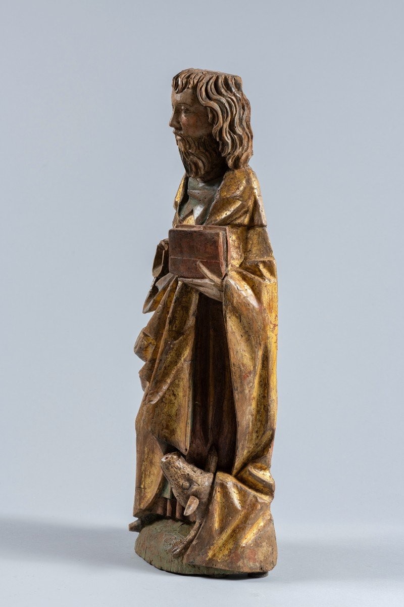 This charming limewood statuette represents the very popular Saint Anthony, dressed in the hooded habit of the Antonine Hospitaller Order. Popularized by the Golden Legend of Jacques de Voragine, this 3rd century Egyptian hermit withdrew into the desert to live his faith in poverty and chastity. After resisting the assaults of the Devil and triumphing in the manner of Christ, he taught the rest of his life to disciples who visited him to listen to him preach and join in his prayers. Upon his death, his relics were first transferred to Constantinople before joining an abbey in Dauphiné around the middle of the 11th century that became famous under the name of Saint-Antoine-en-Viennois. It is around this place that the community of the Antonines is organized, erected as a religious hospital order under Pope Boniface VIII in 1289 and specialized in welcoming sick people suffering from contagious diseases (the plague, leprosy, "the mal des Ardents" etc.). Here, our saint is represented old, according to iconographic tradition. He carries in his left hand a book alluding to the Antonite rule and must have held in his right a Tau or a bell, two of his usual attributes as illustrated by a print dated from the years 1460-1470, preserved at the University Library of Salzburg. At his feet appears a pig, the saint's favorite attribute. The latter would allude both to the diabolical wild boar of the desert that Anthony would have domesticated and which would have subsequently become his most faithful companion, but also to the pigs of his order which were the only ones able to move freely in the streets, adorned with a bell. This animal can be found at the foot of the saint on a German bas-relief from the beginning of the 16th century acquired by the Musée de l'Oeuvre Notre-Dame in Strasbourg from the Galerie Sismann in 2014. From a stylistic point of view, our work is similar to the Swabian productions of the first half of the 16th century and more particularly to a very beautiful Saint James from the Landesmuseum in Zurich. This sculpture from a church in the county of Aargau, between Bern and Zurich, presents a similar treatment of the drapes of the saint's cloak, but also of the beard and hair with wavy locks chiseled into hooks. In addition, this Saint James shares the same physiognomy as our Saint Anthony, marked by a face with an elongated oval. Hollowed out on its reverse, our sculpture must have once adorned the shutters of an altarpiece, as a pendant to other saints.