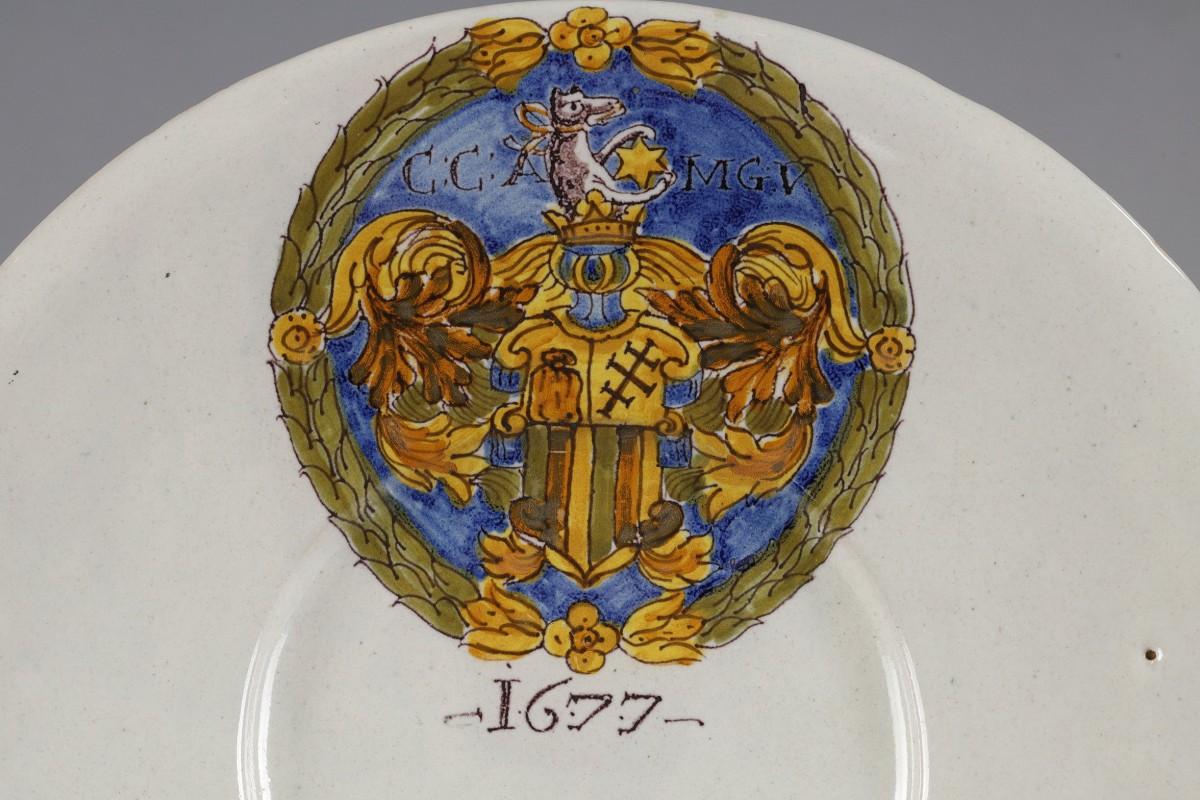 Faenza Small faience dish of the Cardinal type, with a white ground decorated in blue, ochre and manganese in the a compendiario style, bearing the arms of the Marca di Chiavenna family, surmounted by the date 1677 and the initials C.C.A.M.G.V.